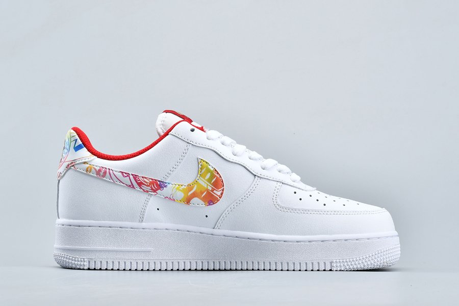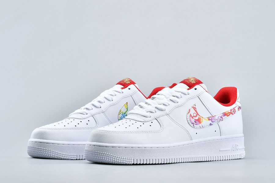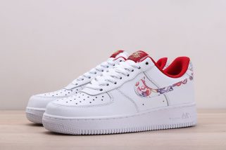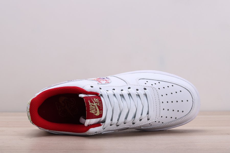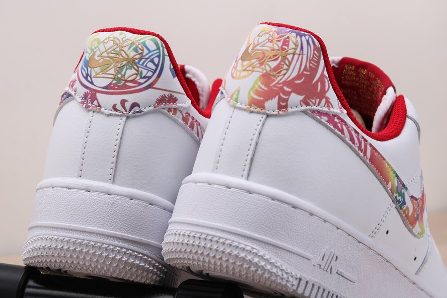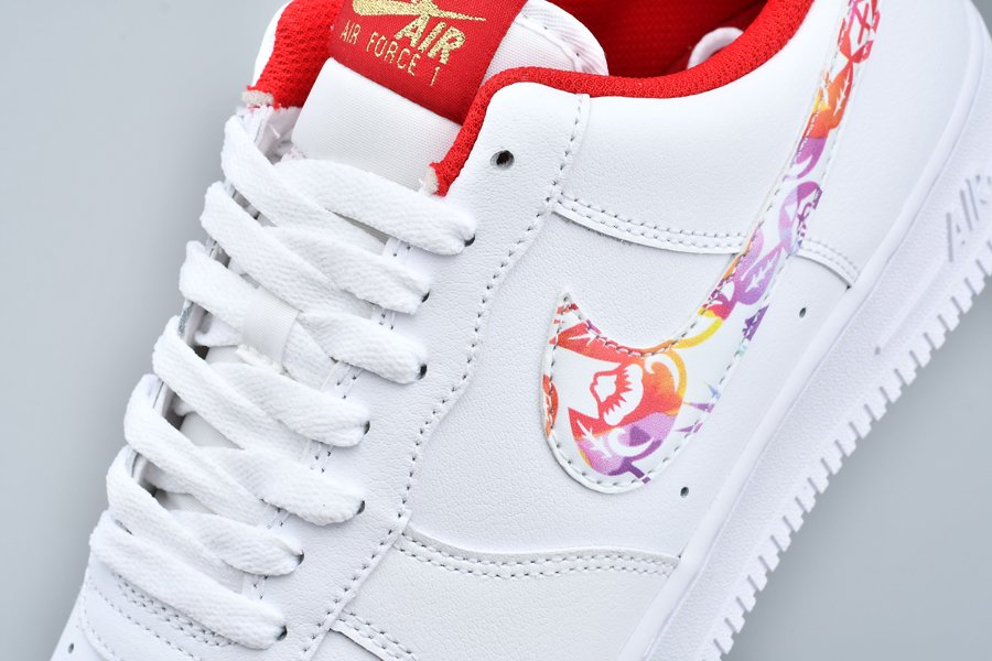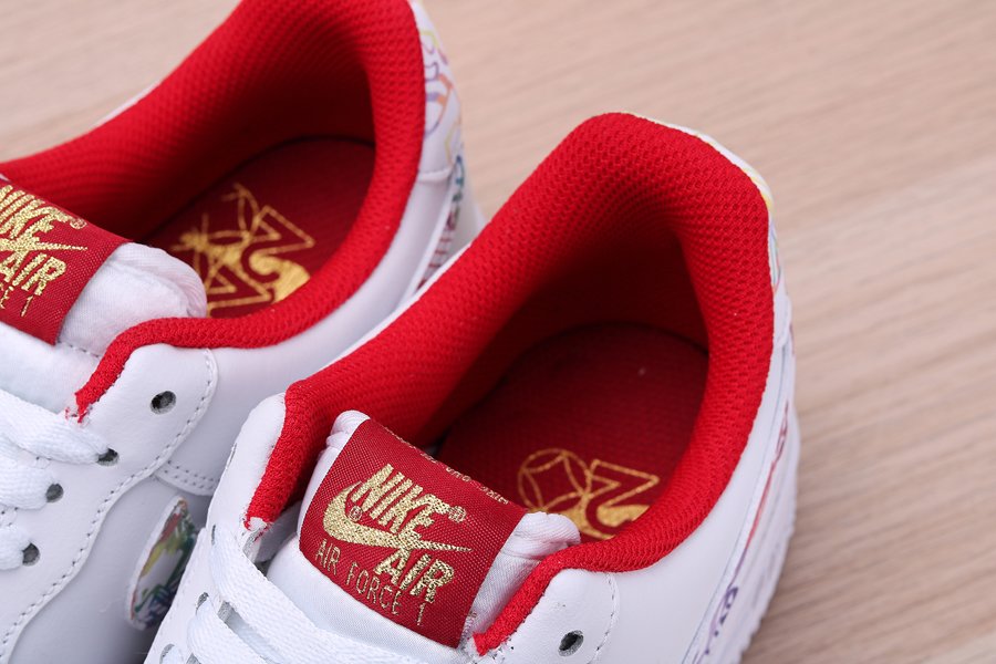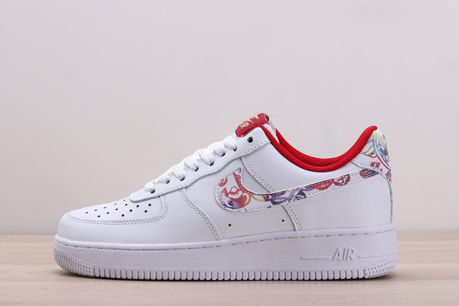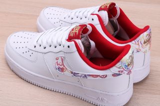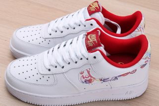 This rendition of the CNY AF1 flaunts a white leather upper that sports the highlight directed at its Swooshes and heel with abstract graphics that reveal dragons, lanterns and Chinese characters to reflect Chinese culture. Finally, red for the inner lining and tongue tab rounds out the style.