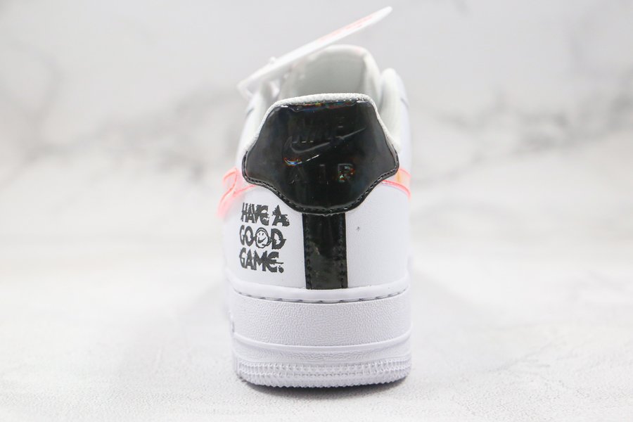 The Nike Air Force 1 Low “Have A Good Game” sports a full white leather upper and is contrasted by its iridescent Swoosh, vamp detailing, tongue tag, and dubrae.