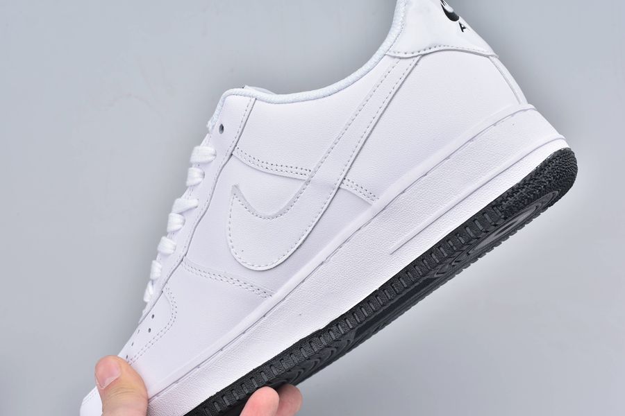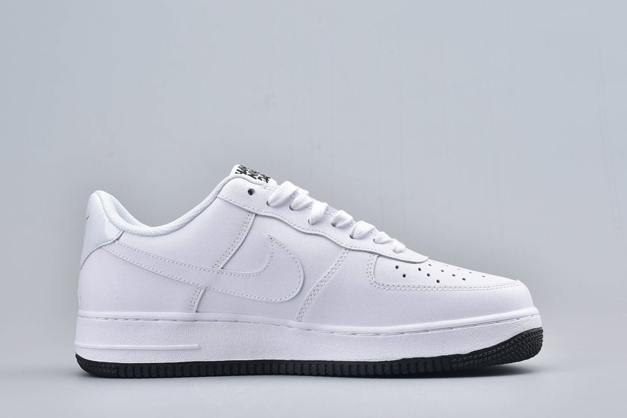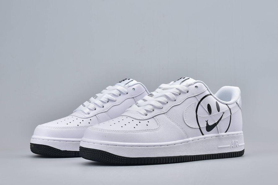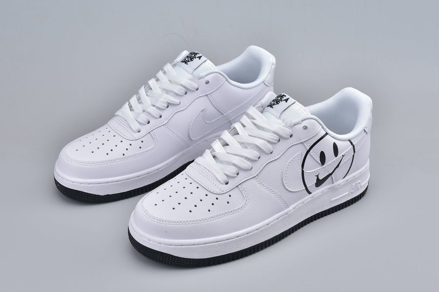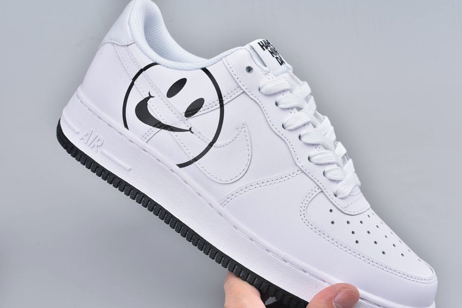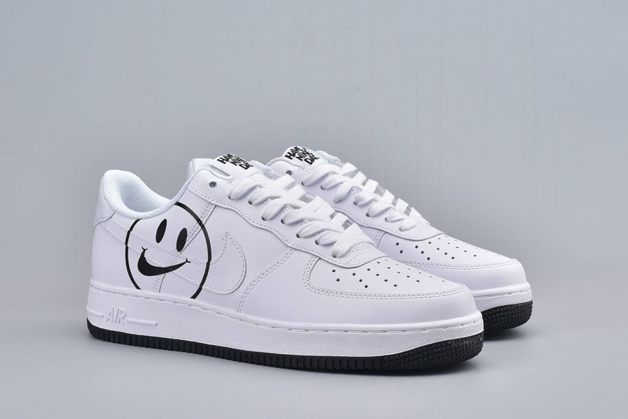 The Air Force 1 Have a Nike Day White is dressed from a slew of premium materials. Doused in an ultra clean white hue, an all white full length Air unit sits below for endless comfort and a smoother stride. To complete the design, a contrasting rubber outsole sits below in black as well as a smiley face on the lateral sides.