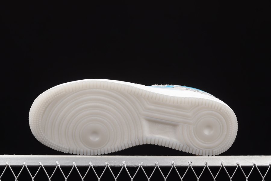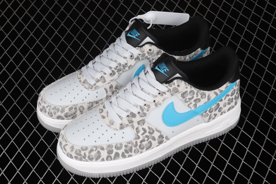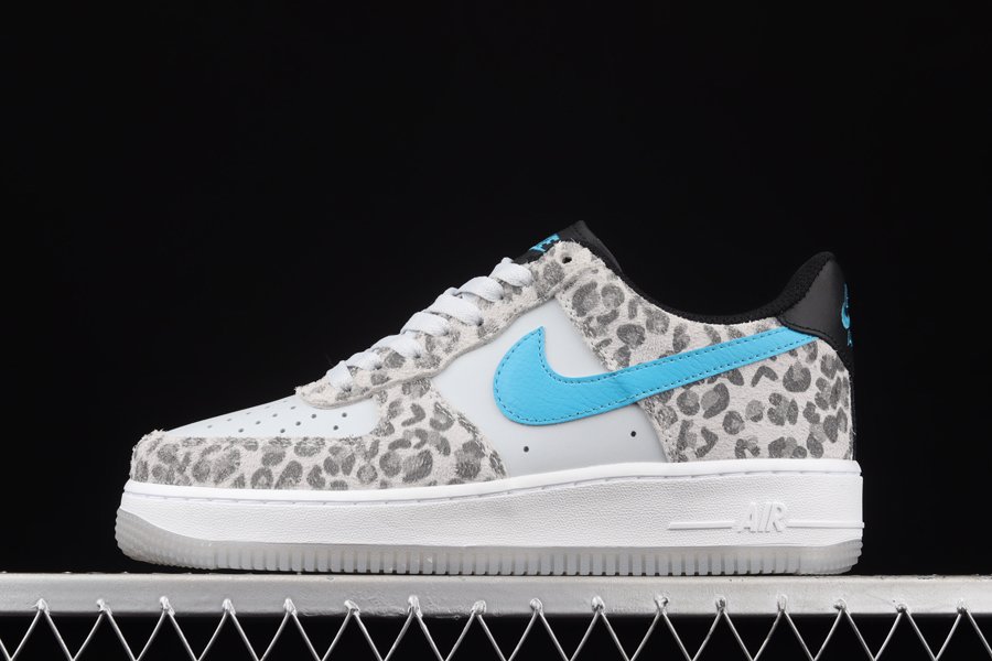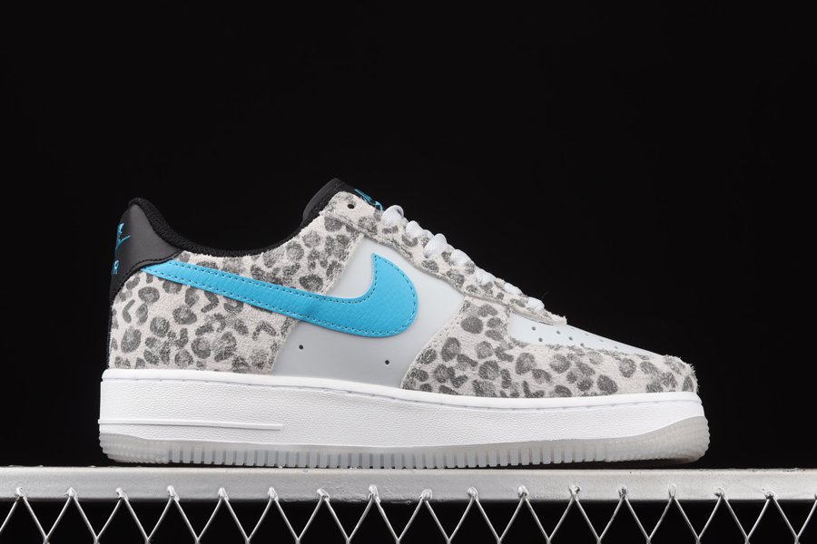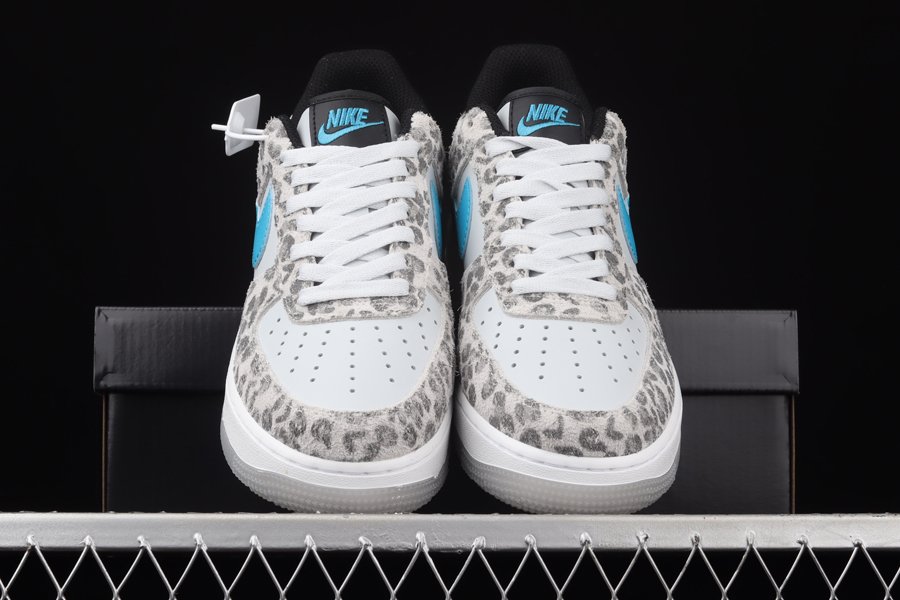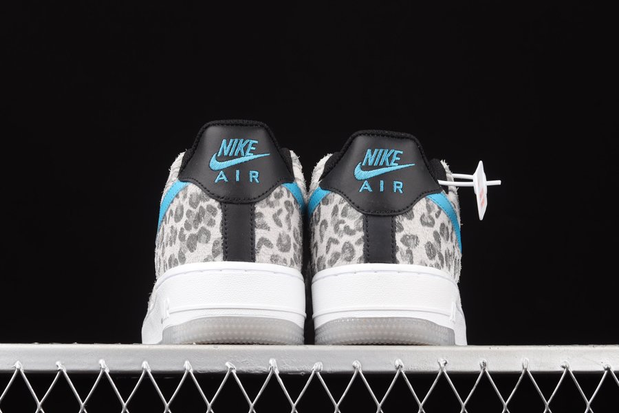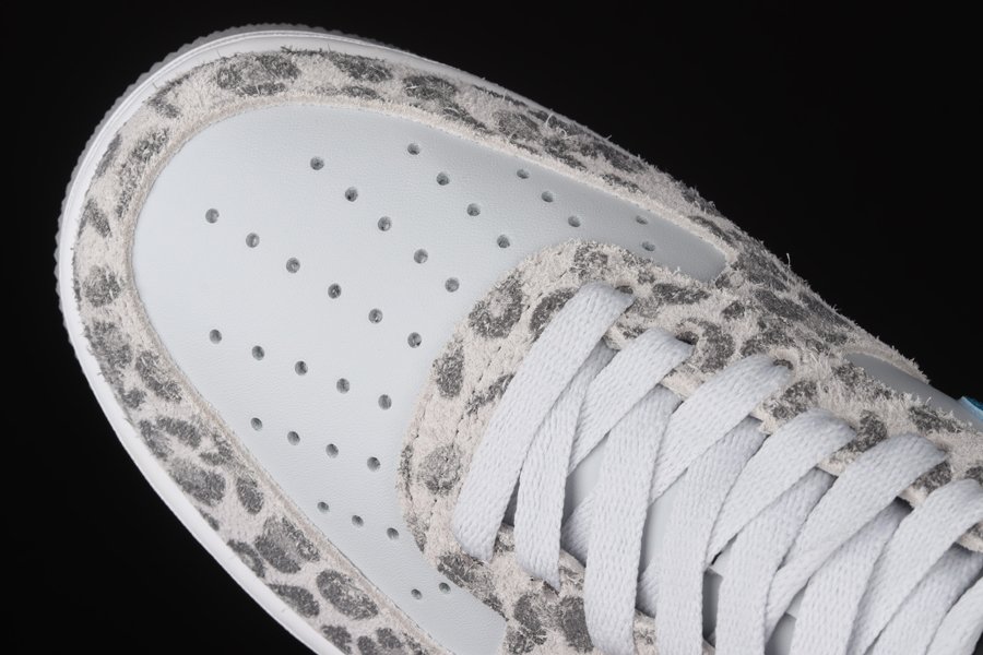 The Nike Air Force 1 Low Leopard has a white leatherbase and matching laces. Then there are overlays adorned with leopard snow print on the mudguard, eyelets and heels. Touches ofturquoise on the brandings, as well as a white sole and a semi-translucent outsole complete the design of Bruce Kilgore.