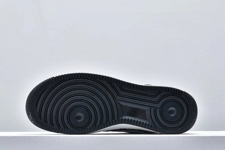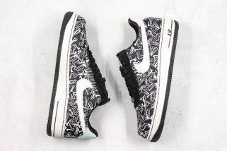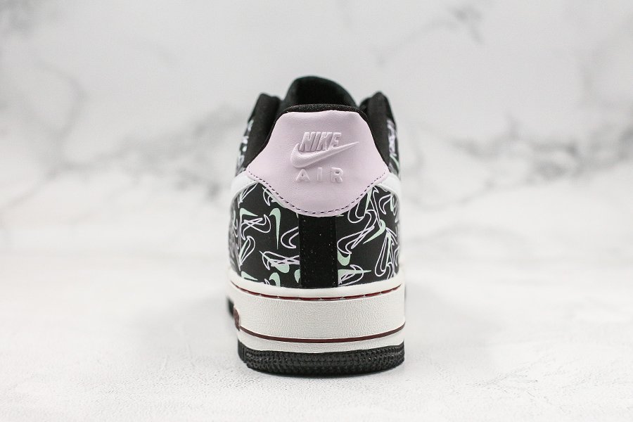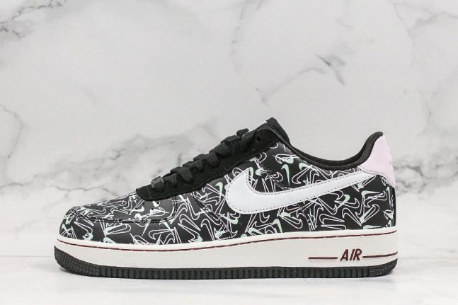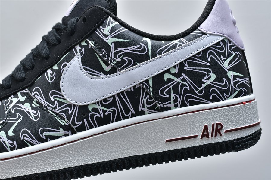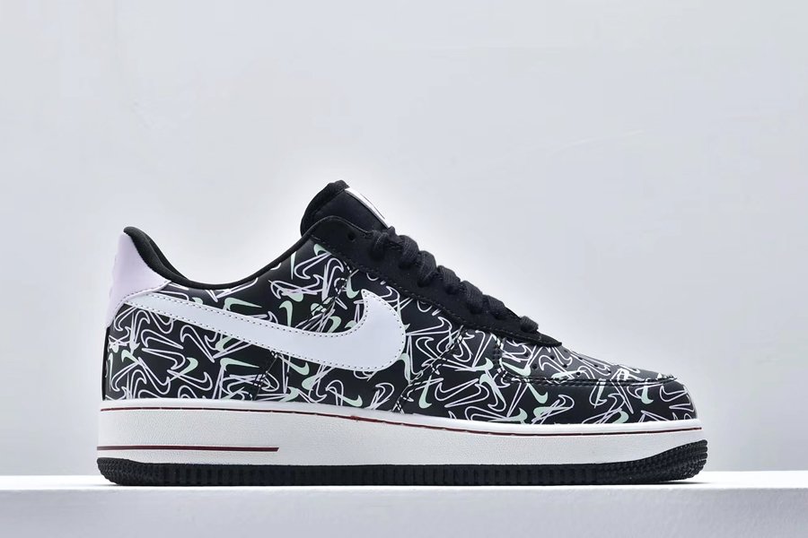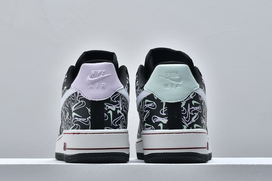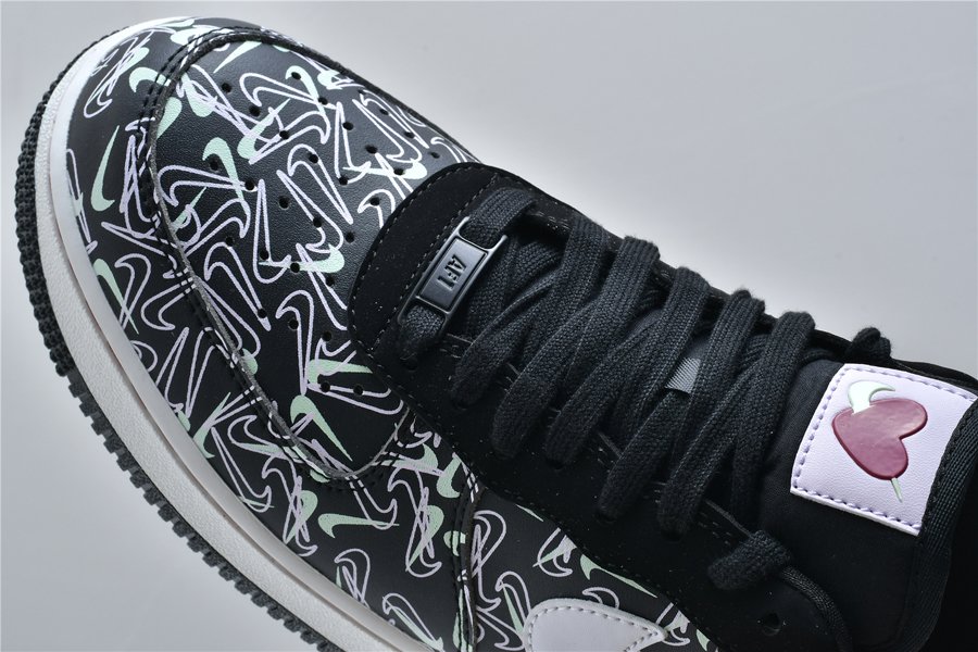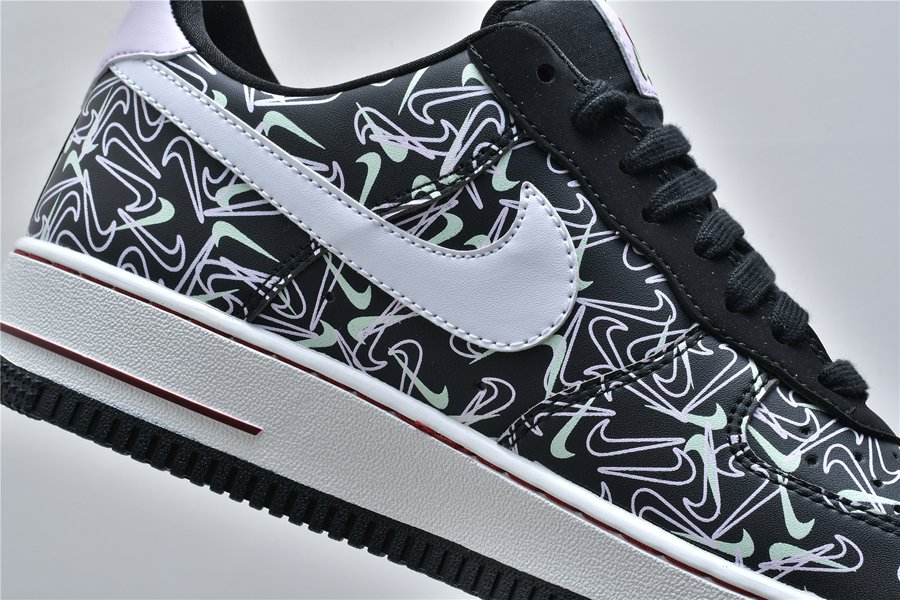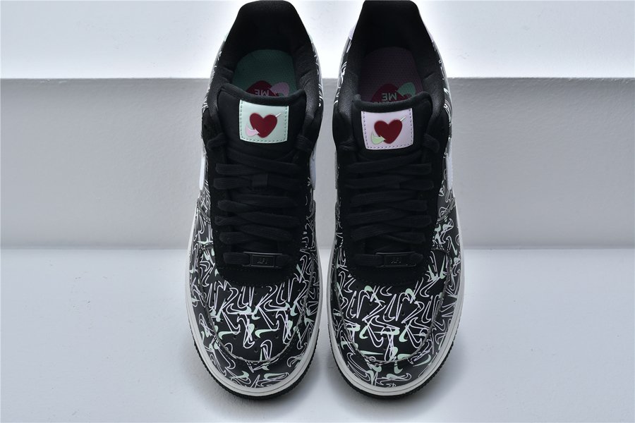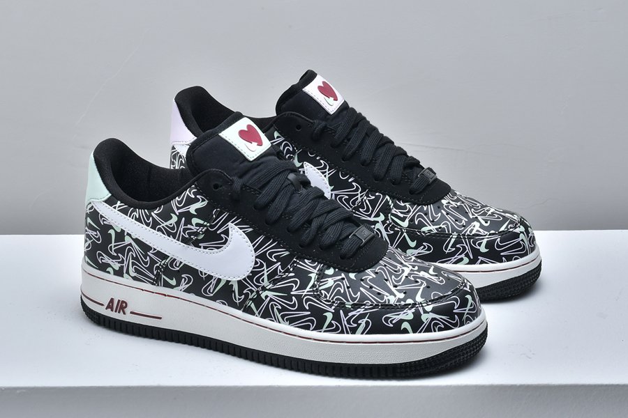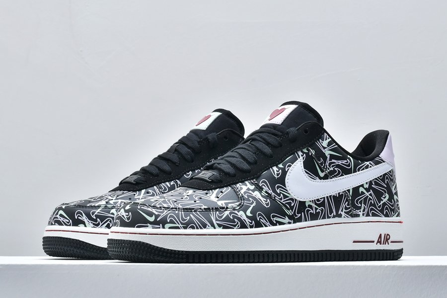 Leather covers over the upper of the sneaker, with filled and outlined Swooshes covering the entire thing, overlaid in differing sizes in white and mint hues, keeping with the palette of the rest of the Valentines Black Air Force 1.