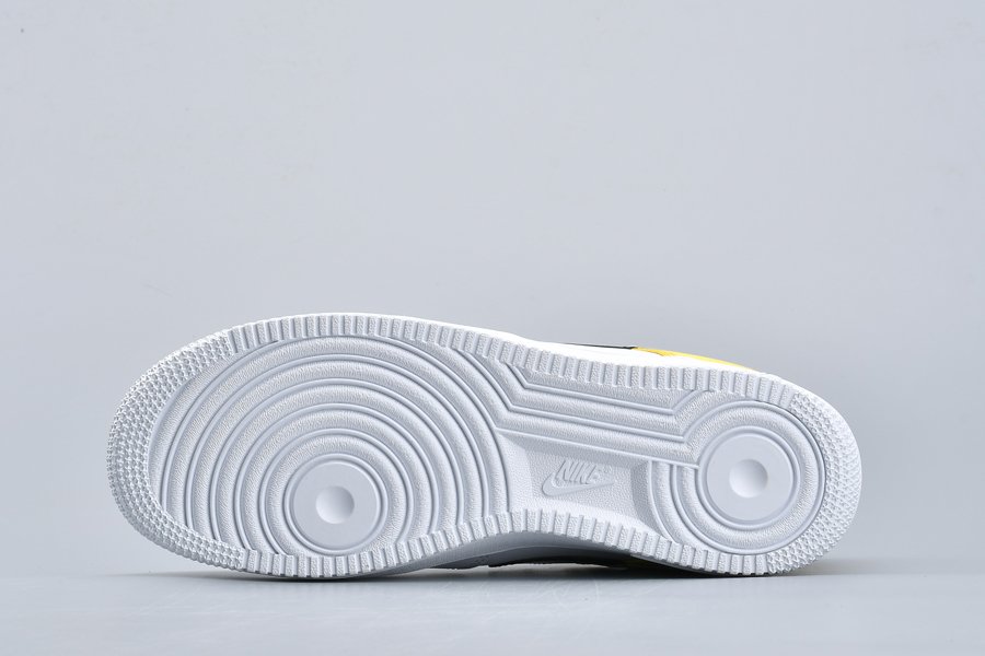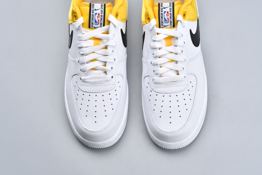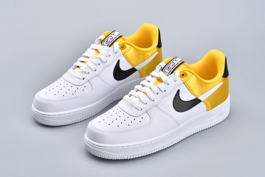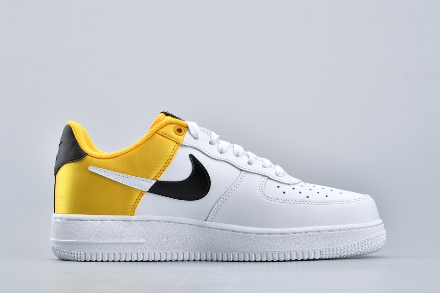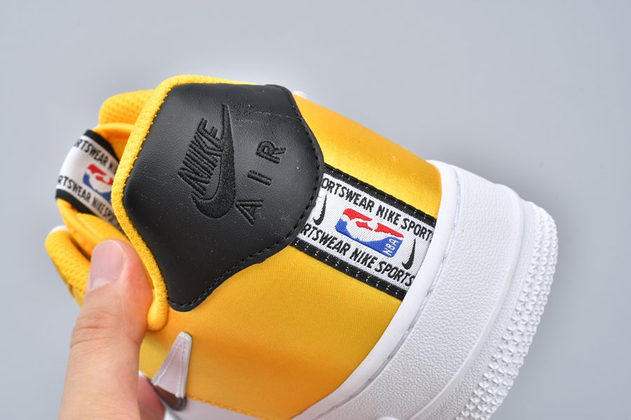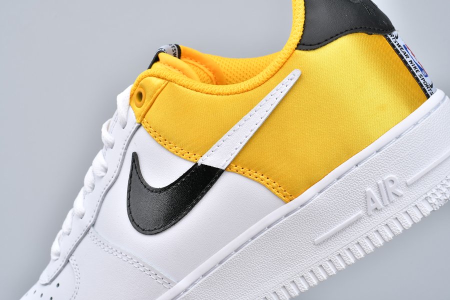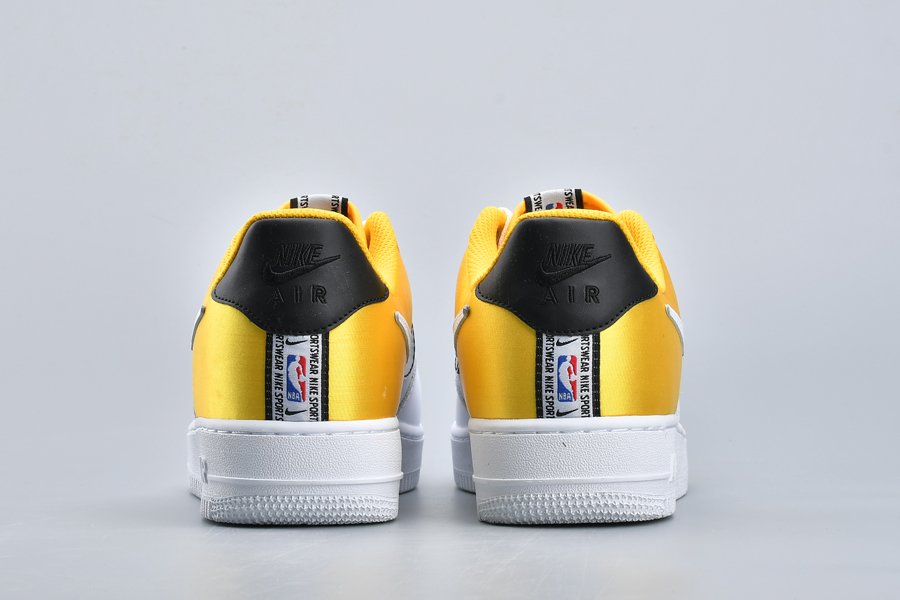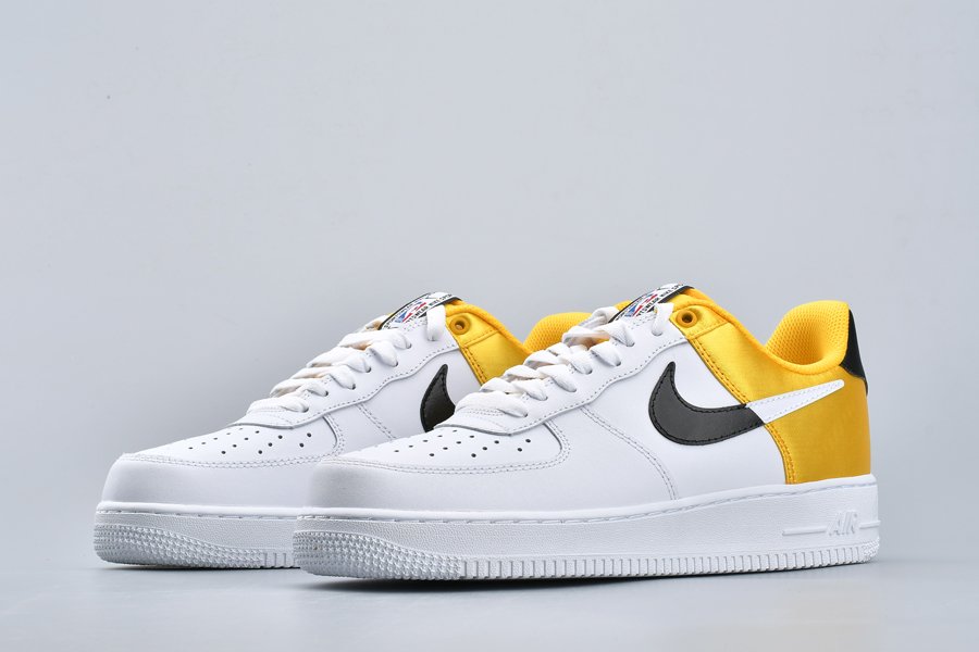 This Nike Air Force 1 NBA “Amarillo” bears a three-toned color scheme featuring a classic white leather base that runs from forefoot to midfoot with branding from the Association found on the tongues and heel stripes, and thus transitions into a split-colored black/white Swoosh, black heel tab, and yellow satin heel panels for a contrasting pop of color.
