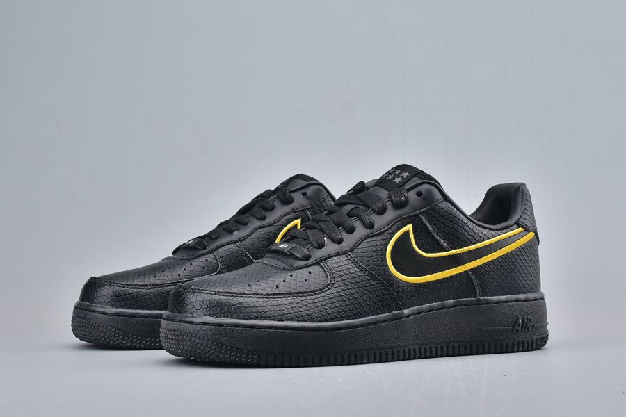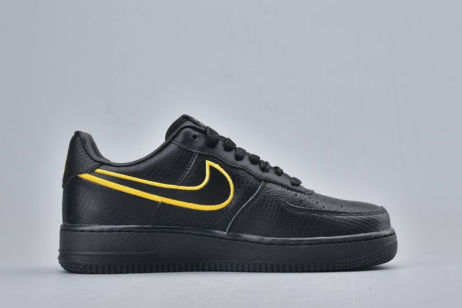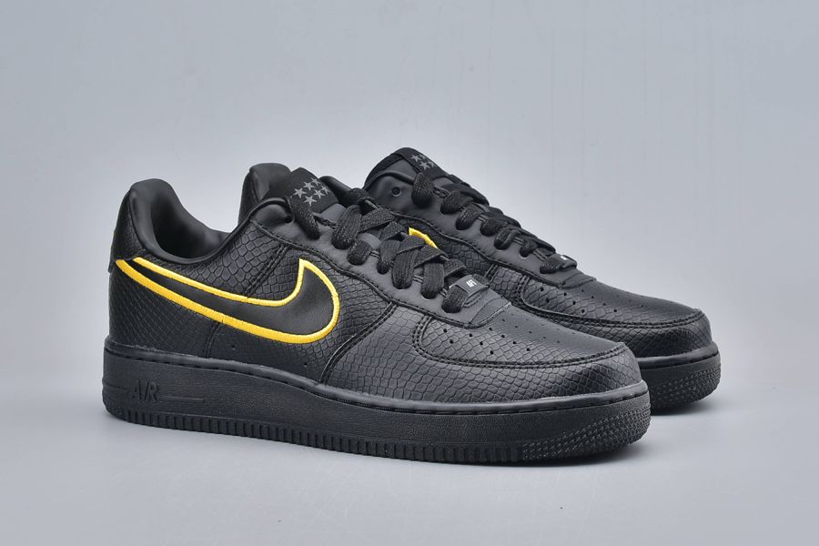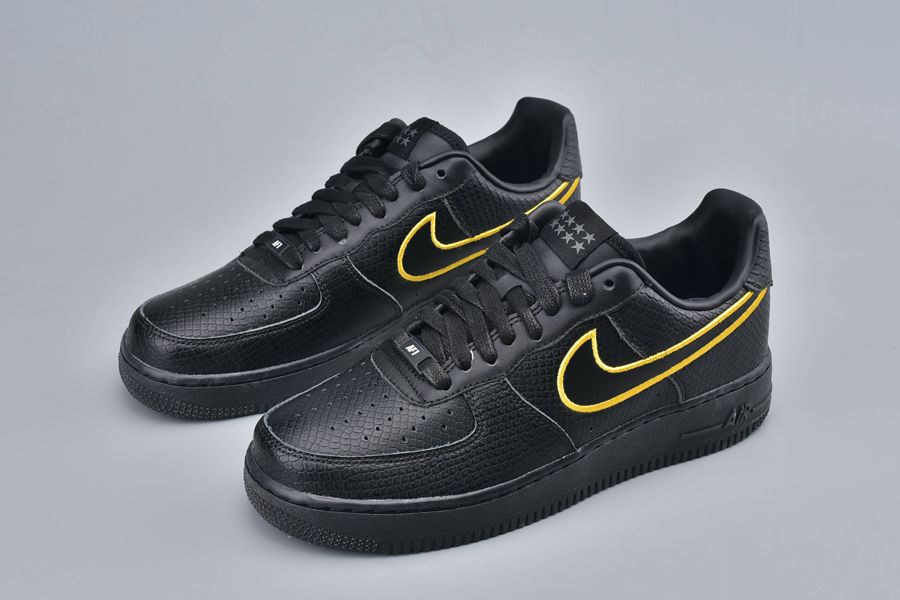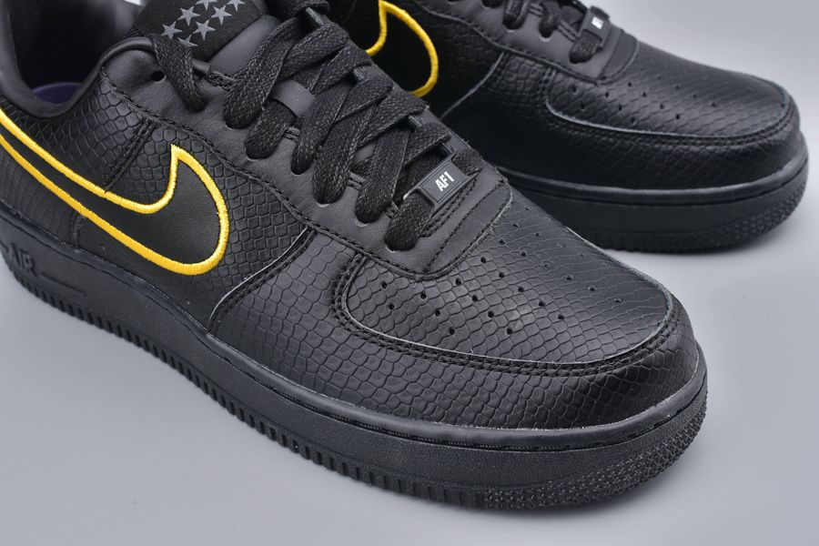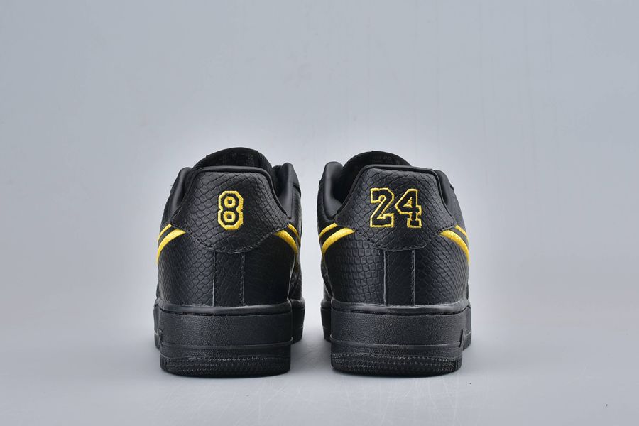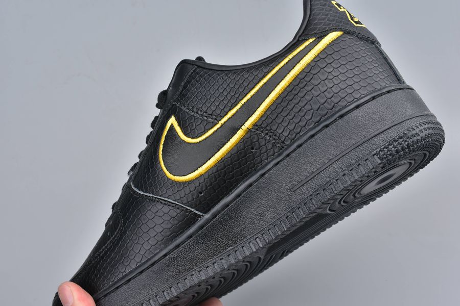 This Nike Air Force 1 Low was made to commemorate the Los Angeles Lakers number retirement ceremony for Kobe Bryant. Nicknamed the “Black Mamba” edition, they come in a Lakers-themed black and university gold colorway. Sporting a black-based snakeskin upper with leather accents. Other details include: a drop shadow “Swoosh” in gold on the sides, Kobe’s jersey number’s “8” and “24” embroidered on the back heel tabs and eight stars on each tongue tag, representing the total number of NBA titles the Lakers have won.
