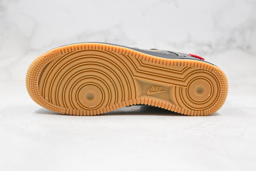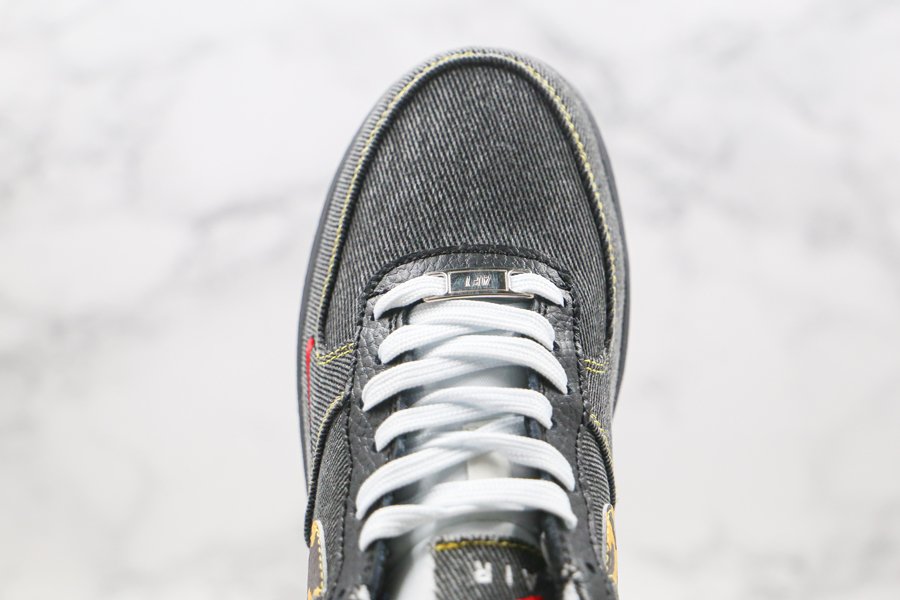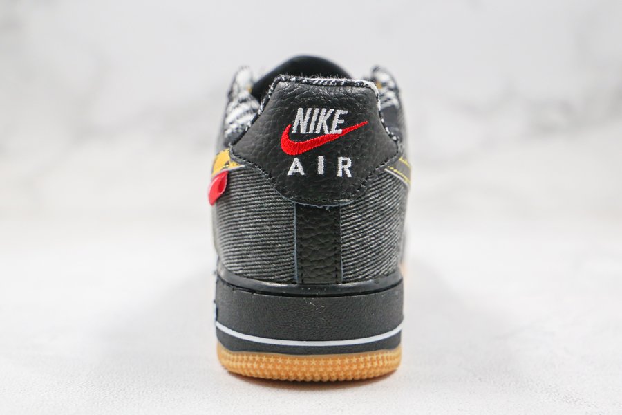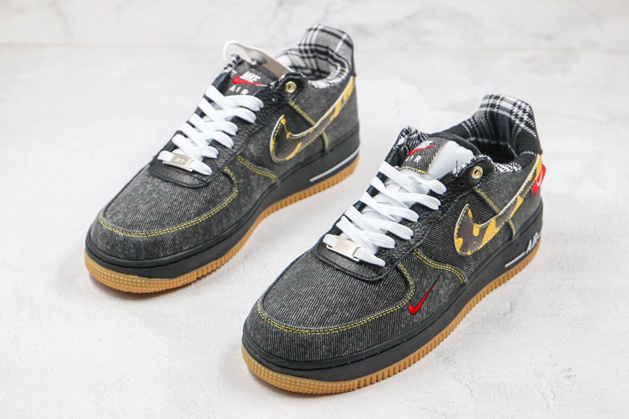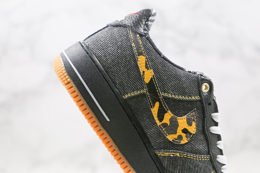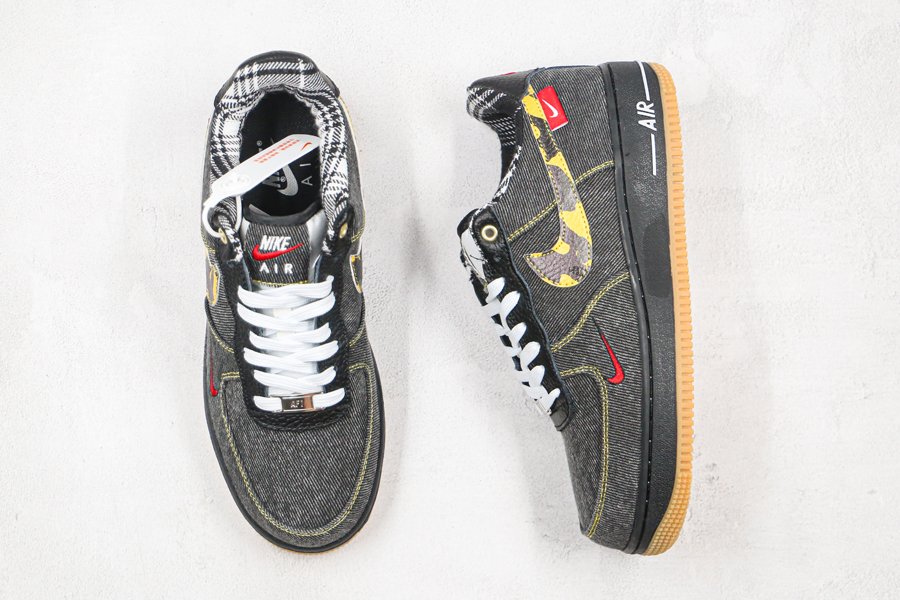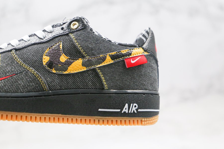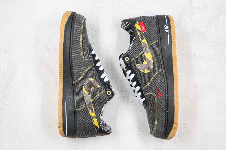 This version of the Air Force 1 Low starts off with a black washed denim base all over the upper with a black and yellow camouflage print placed on the side panel Swooshes. Pops of red are then seen on the mini Swoosh by the toe, the Nike tag on the Swoosh, and the Nike branding on the tongue and heel. Additional details include black leather on the eyestay and heel tab, a plaid inner liner, white tongue and laces, a black midsole, and a gum rubber outsole.