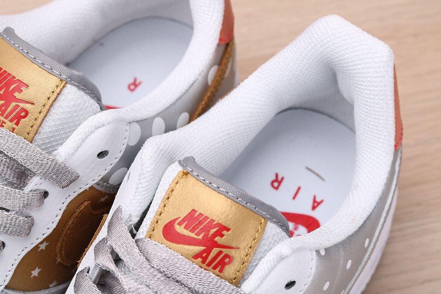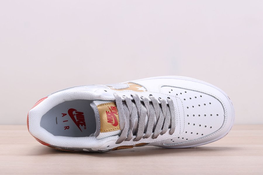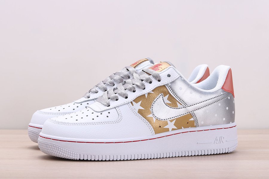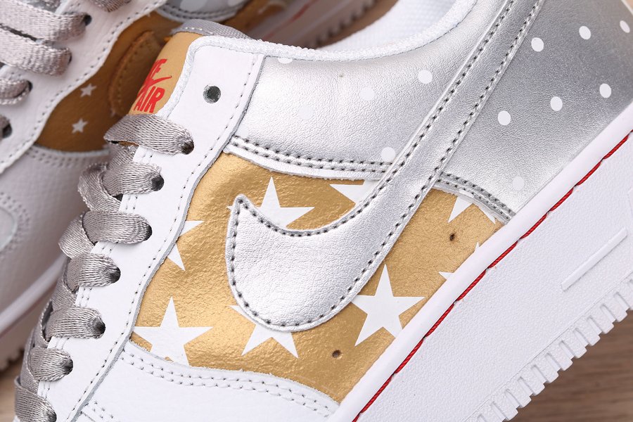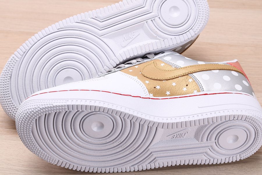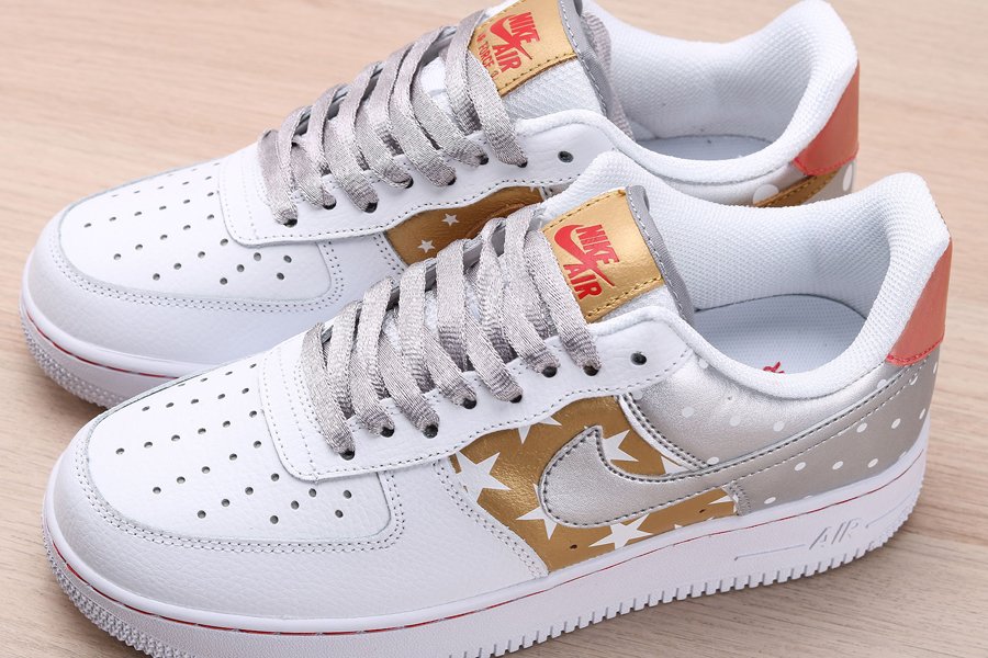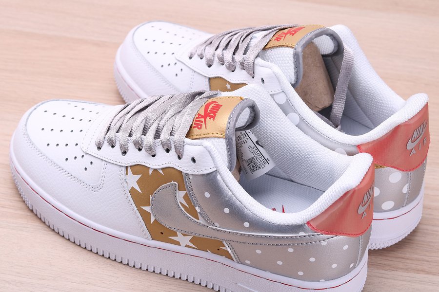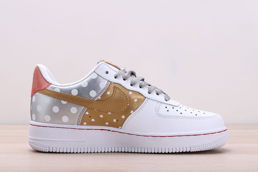 Print and graphics highlight this new Nike Air Force 1 Low that is part of Nike’s Fall 2019 Collection. Covered in a smooth white leather on the front half of the shoe as well as on the eyestay, this Uptown is then hit with tan side panels covered in white stars as well as a metallic silver heel with white polka dots. Silver and tan detailing on the Swooshes, laces, and tongue tag, and a transparent red heel tab wraps things up on this Air Force 1 Low.