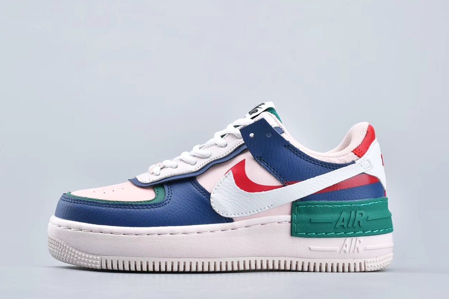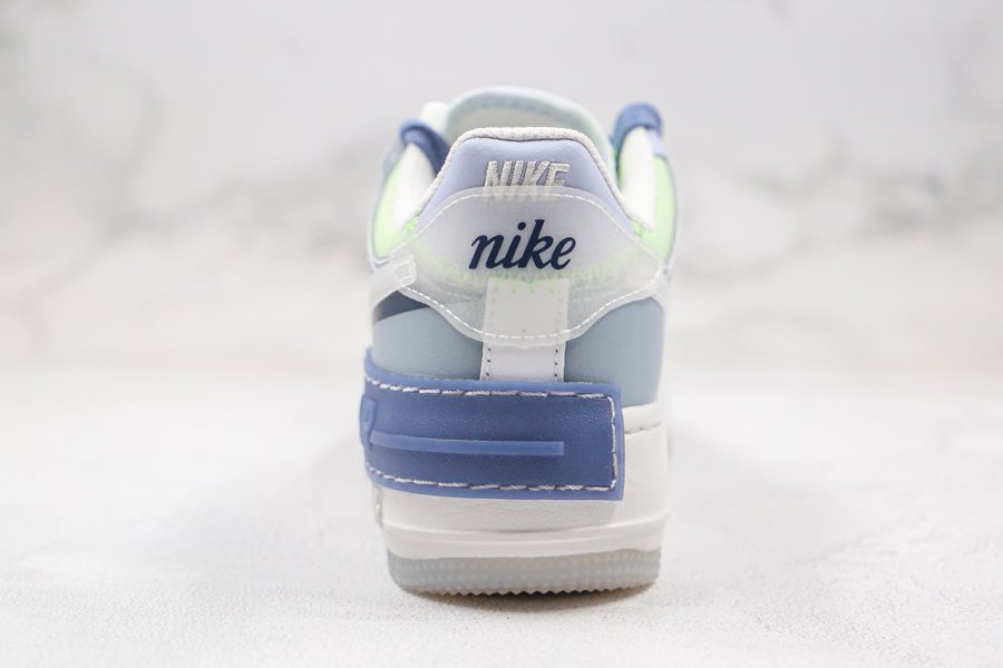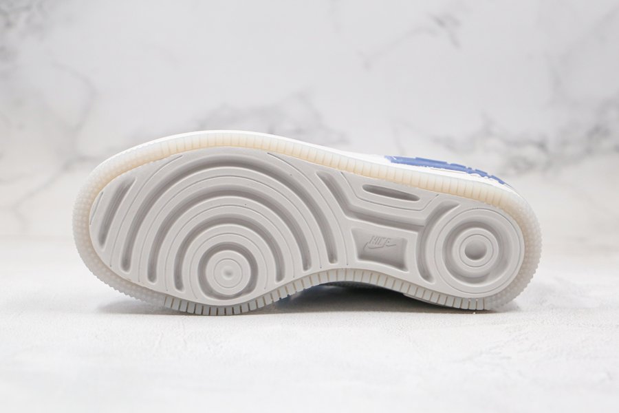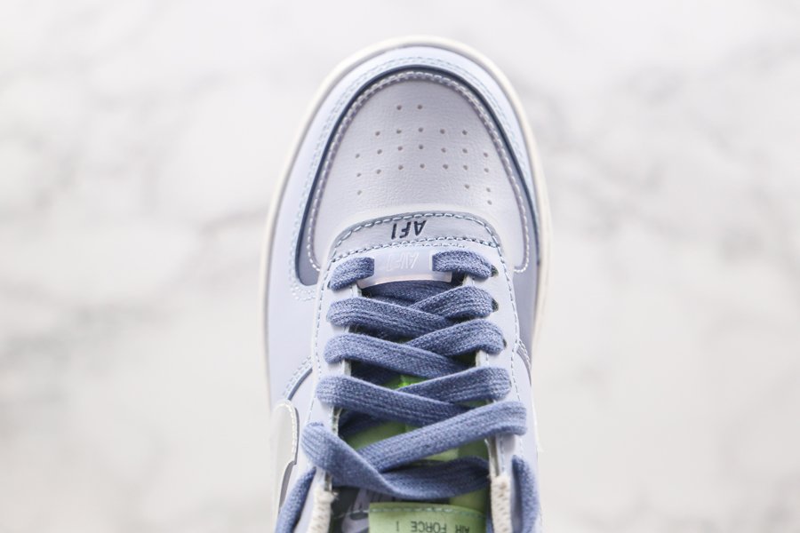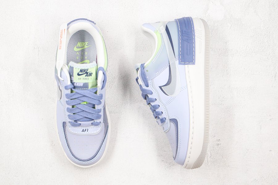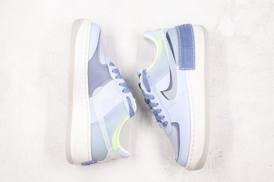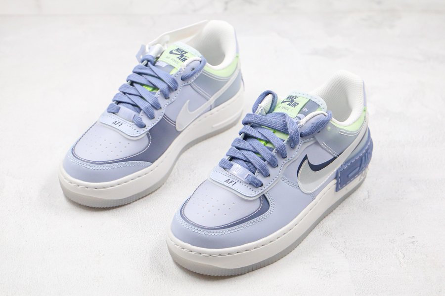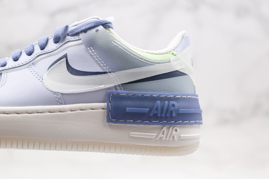 The Nike Air Force 1 Shadow SE Ghost World Indigo features the usual leather upper enhanced by lined elements, such as toebox and eyelets, but also the AIR tag on the heel and Swoosh. The combination of pastel blue and indigo creates dimension while the two-tone sole finalizes the design.