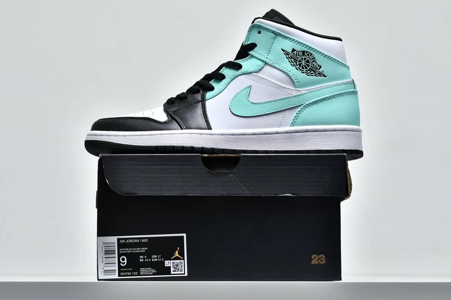 The Air Jordan 1 Mid “Island Green” starts off with a White leather upper paired up with Black hits on the toe overlays and tongue. Making them a Summer-approved sneaker is the Mint Green on the eyestay, ankle collar, Swoosh and Jumpman logos, and heels. Black laces, a White midsole and Black rubber outsole round out the main features of the shoe.