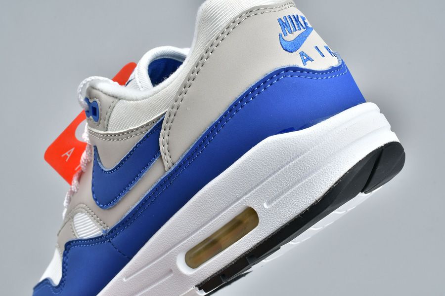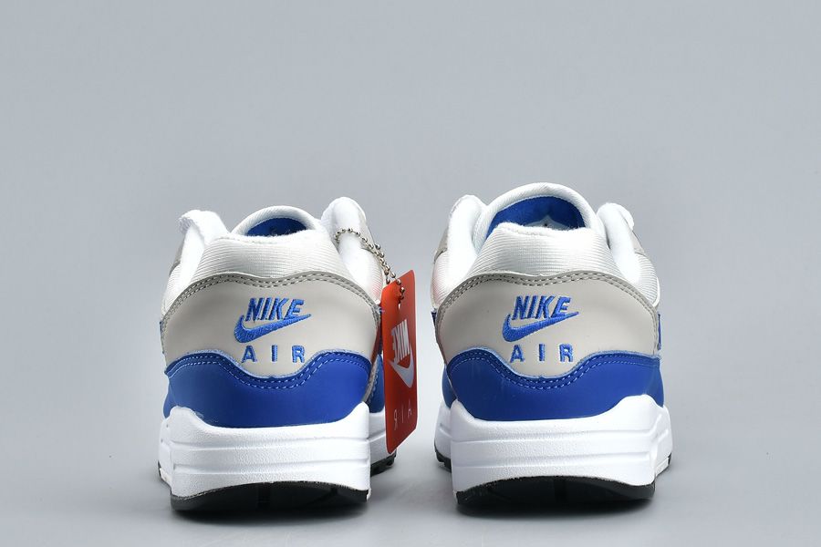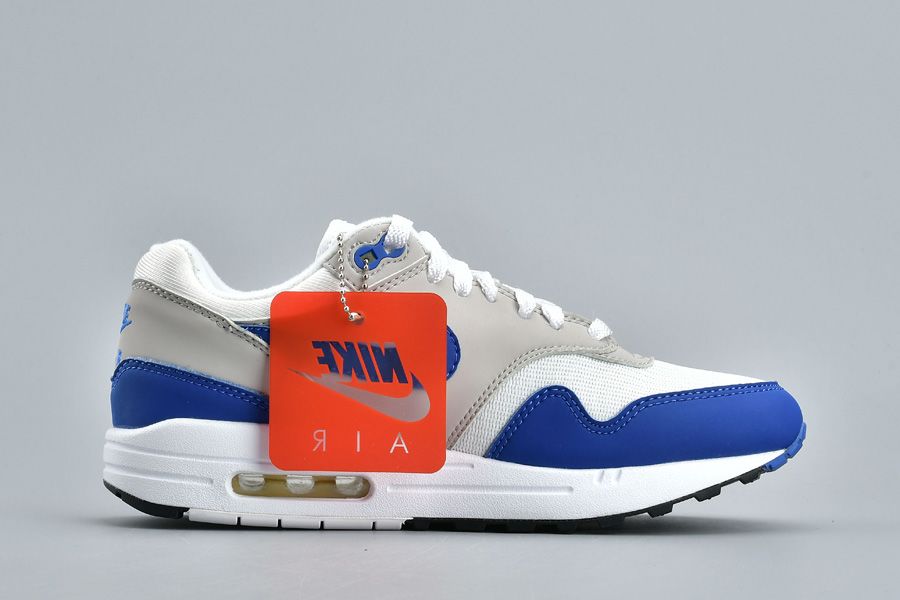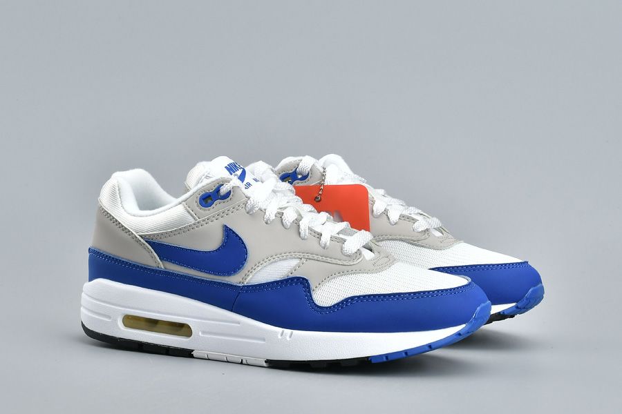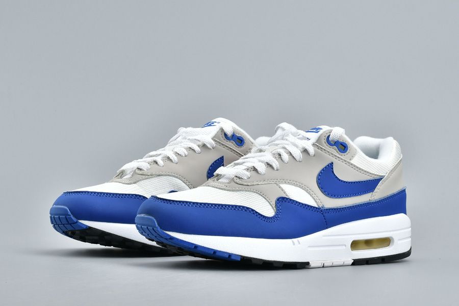 This Nike Air Max 1 features the OG color combination of White, Game Royal and Neutral Grey. Suede is used across the mudguard, panels and Nike Swoosh while mesh lands on the toe. Game Royal highlights this pair while landing on the mudguard, Swoosh, tongue branding and eyelets. Other details includes Grey on the panels, White detailing and Black on the outsole.