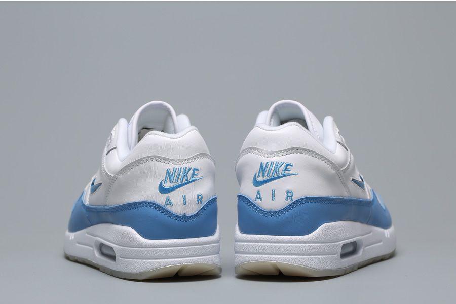 The Nike Air Max 1 Premium SC Jewel ‘University Blue’ revives a fan-favorite detail, the jewel Swoosh, rendered here in University Blue. The pastel shade is repeated on the leather mudguard and Nike Air branding on the tongue and heel, as well as the silhouette’s signature Air sole unit. Crisp white is used on the leather upper and midsole, while the translucent rubber outsole reveals a printed large Swoosh underneath.