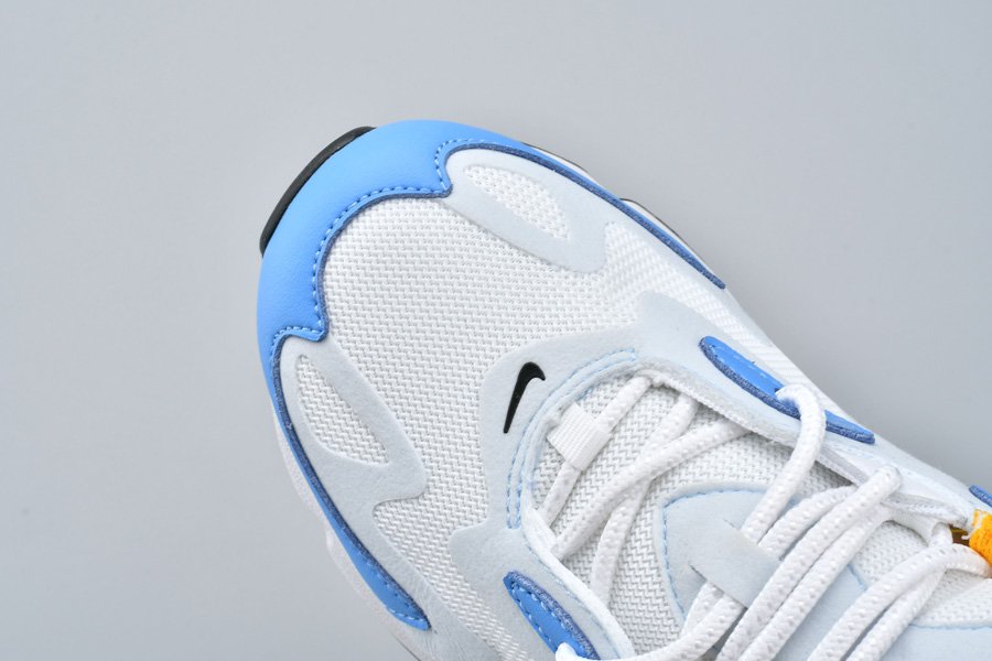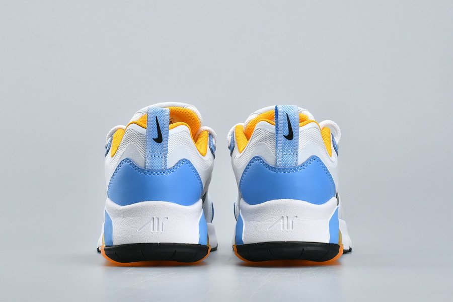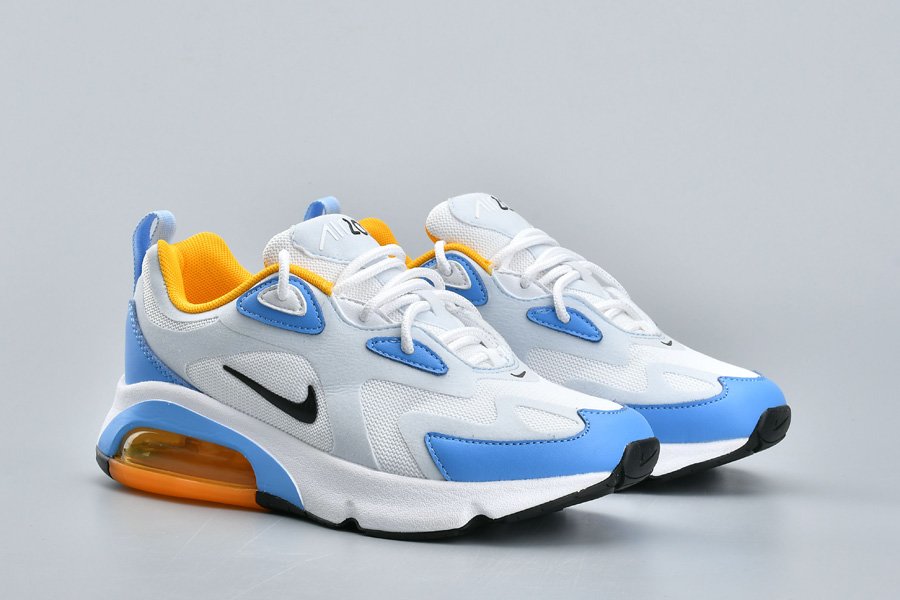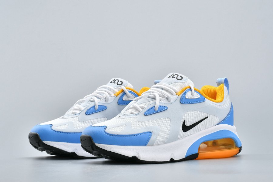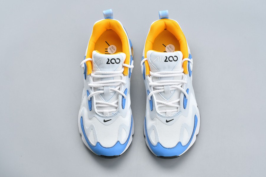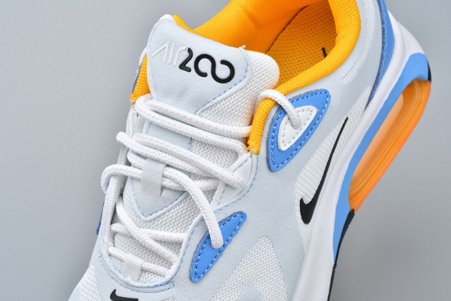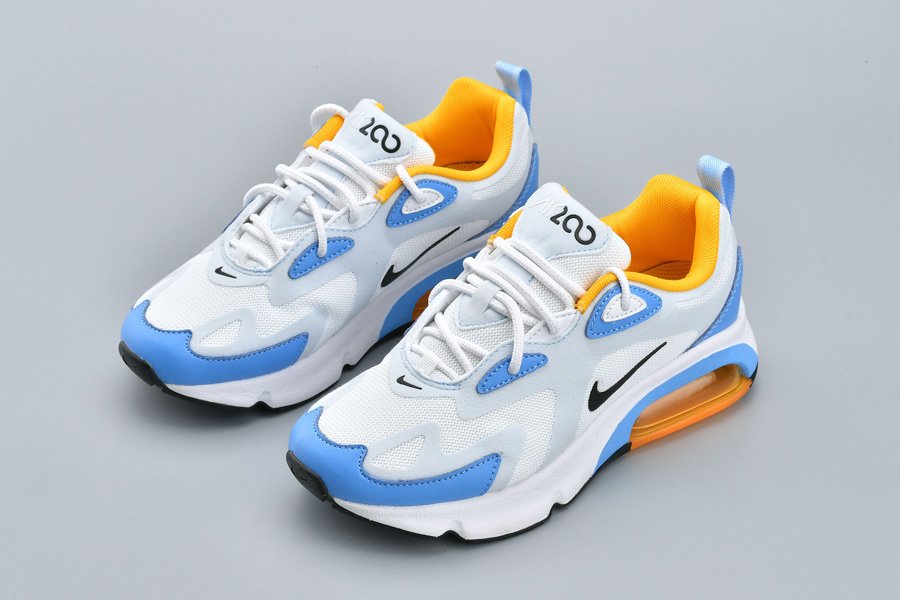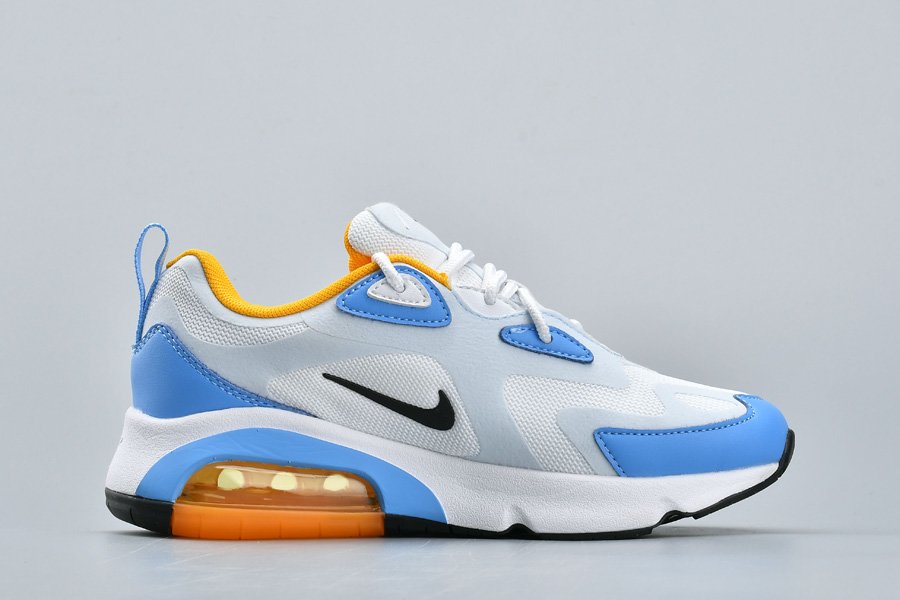 The Nike Air Max 200 arrives with a white upper, along with microsuede overlays in light blue hues. The iconic Swoosh is placed on the medial and lateral sides in black, while the Air Max 200 branding can be found on the padded tongue. Lined with an orange-yellow hue, the sneaker sports the Air Sole unit in the same color along with a black rubber outsole. The brand’s logo is also added on the blue heel tab.
