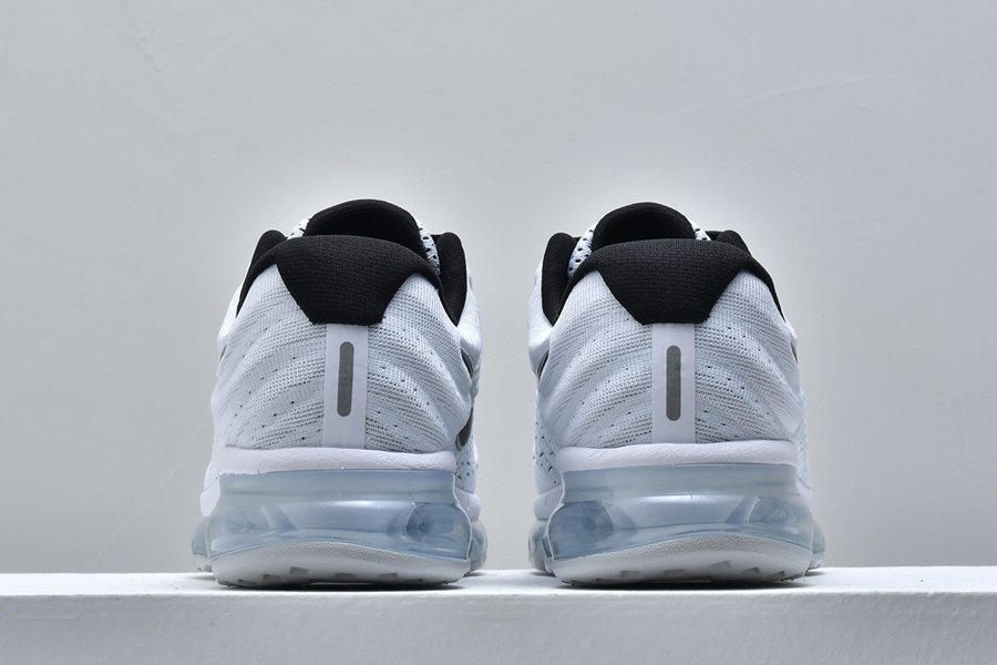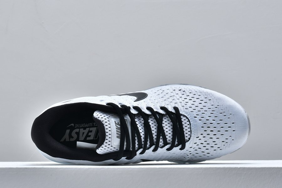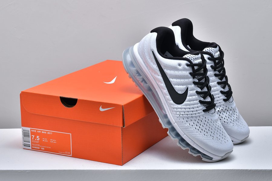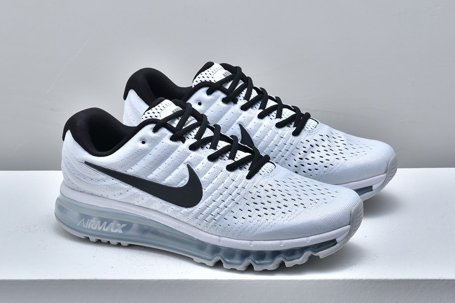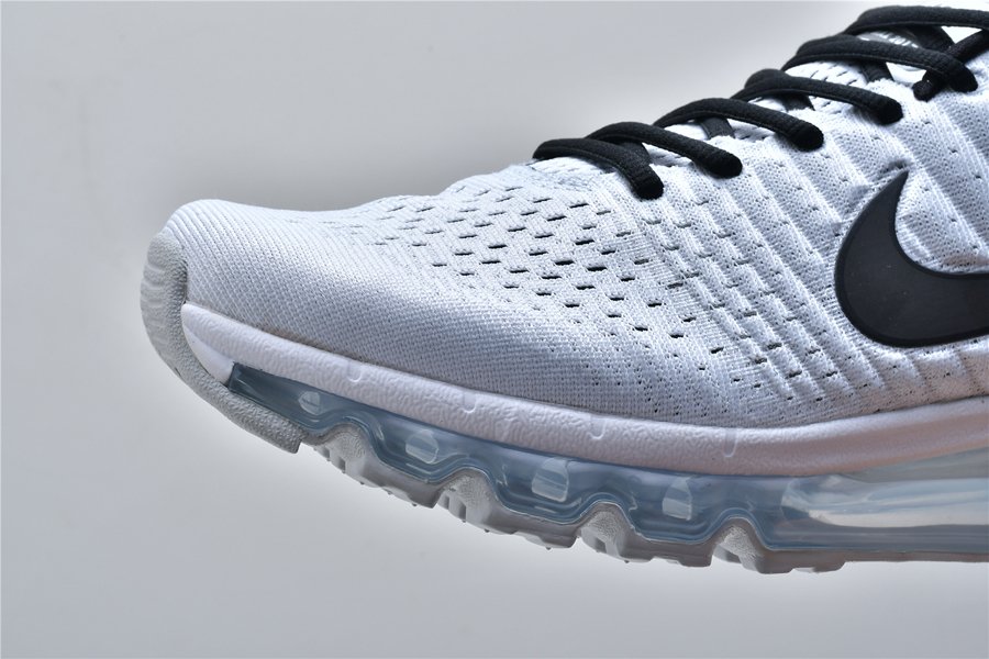 The Nike Air Max 2017 features a one-piece ventilated Flymesh upper with a moulded foam wrap, plush collar and flexible cushioning that is colored in white with black accents on the swooshes, laces, lining and piping on the midsole. A full-length Air Max unit completes the look altogether.