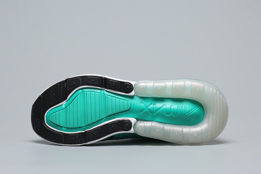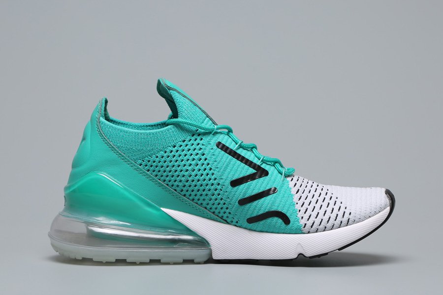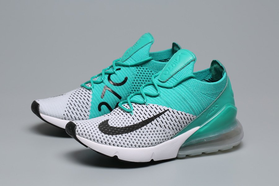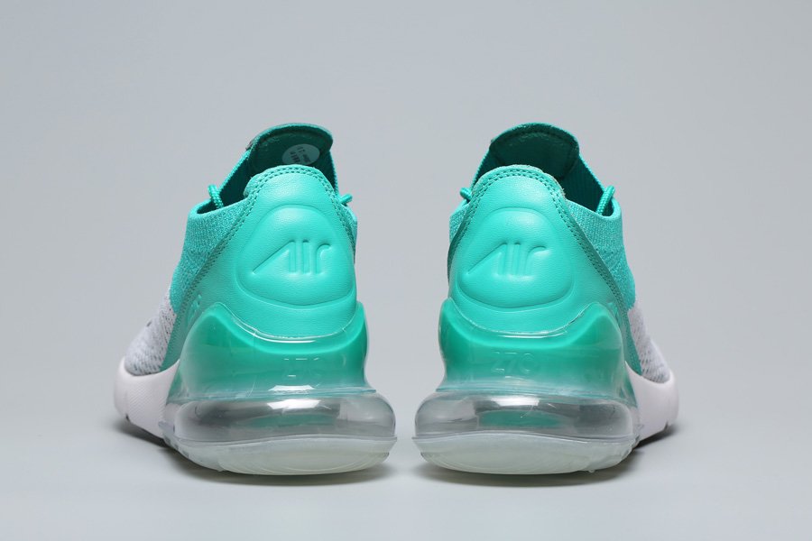 This Nike Air Max 270 comes dressed in a Clear Emerald, Black, Pure Platinum and White color combination. Constructed with Pure Platinum Flyknit on the uppers, Clear Emerald lands on the tongue, laces, sock like collar and heel counter. Following we have Black on the branding and outsole, White on the midsole and a transparent Air Max unit.