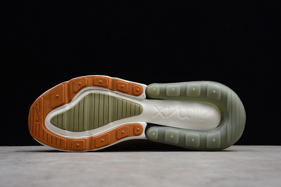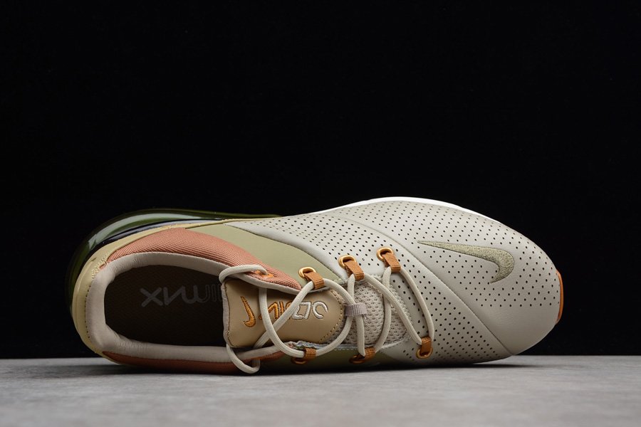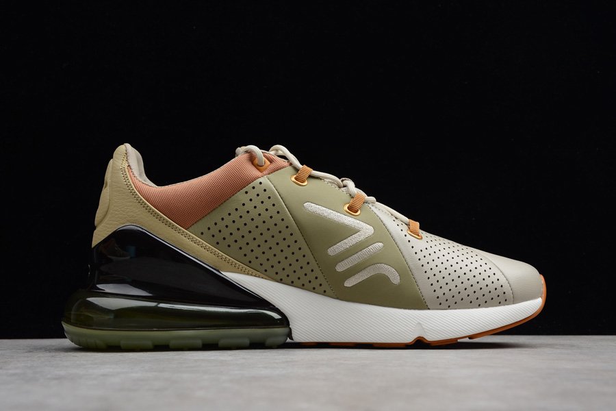 This Nike Air Max 270 Premium features a perforated leather upper instead colored in an official color scheme of String/Desert Ochre-Neutral Olive. A contrasting black heel overlay, followed by a large tinter Air bag in the heel unit and white midsole with a gum outsole completes the design altogether.