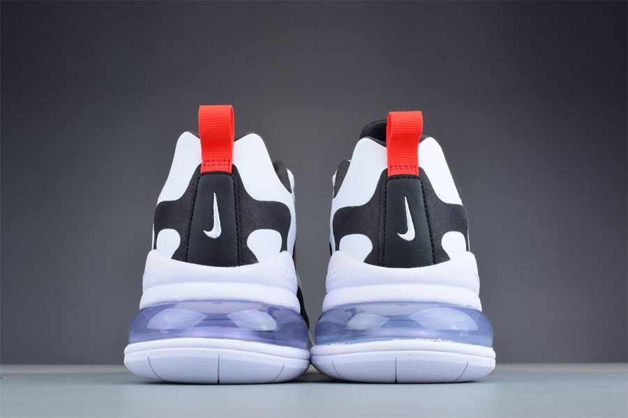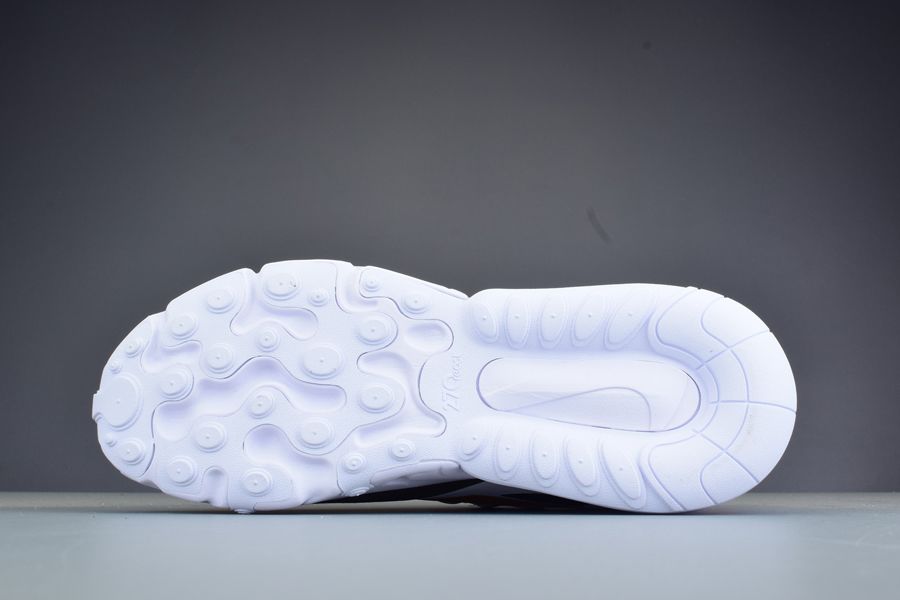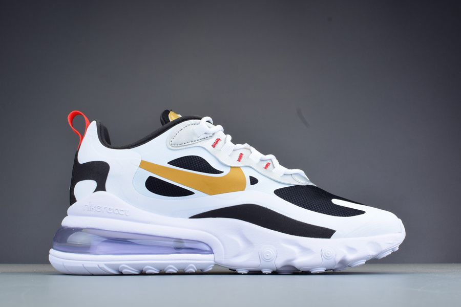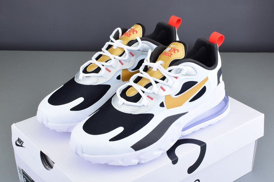 This Nike Air Max 270 React features a black textile mesh construction on the upper that is then hit with contrasting white overlays. For a pop of color we see the addition of Metallic Gold on the Swooshes as well as on the tongue along with red accents on the stitching by the eyelets, the branding on the tongue and insoles, and the heel pull tab. Down below we have a white React midsole with a matching rubber outsole along with a translucent Air Max 270 unit on the heel.