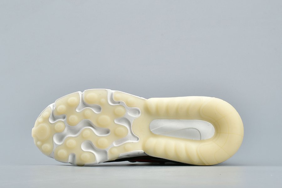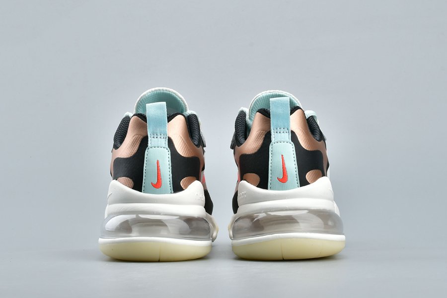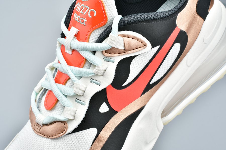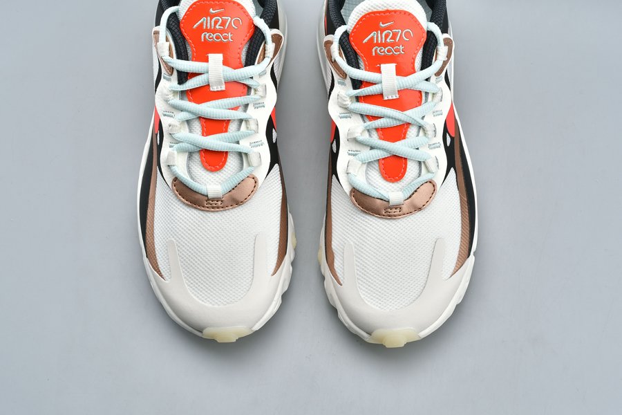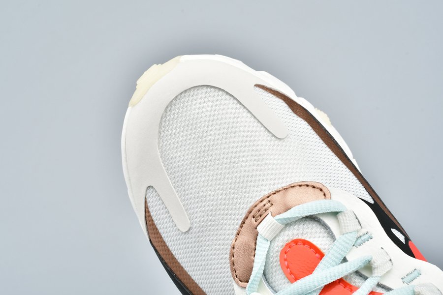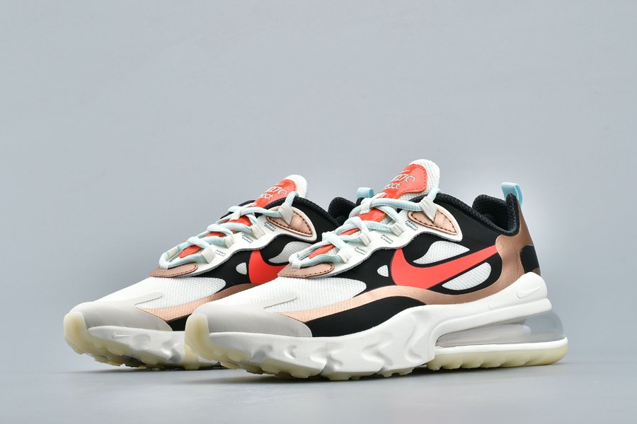 This hybrid Air Max silhouette starts off with a white mesh construction on the upper along with black and bronze synthetic overlays which provide the shoe with a bold contrast. Providing more contrast is the addition of bright orange on the Swoosh branding on the heel and side panels as well as on the tongue. Aqua/teal on the laces and heel along with a white React midsole and creamy translucent outsole wrap things up.