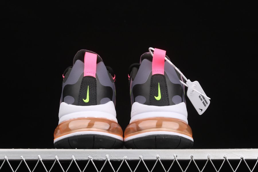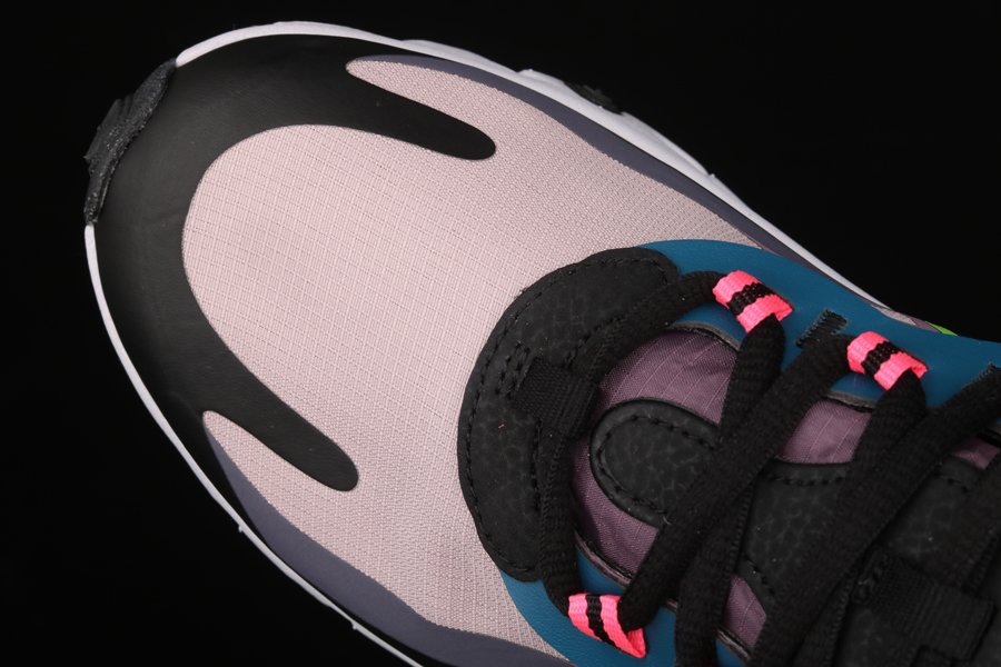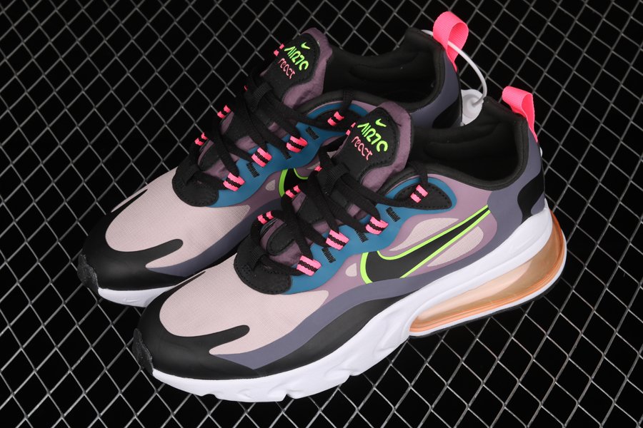 Synthetic and textile uppers see a greyish lavender hue that is matched by the darker shades of purple and black applied to the graphic overlays that wrap around the pair. A neon green outlined swoosh disrupts the palette and adds extra brightness. Neon elements are also found on the pink lace loops and coral heel pull tab and Air unit. Serving as an in-between shade, one of the layers used around the laces are clad in a blue that’s neither neon nor dull. A dimpled white React foam midsole completes the design to deliver the franchise’s signature comfort.