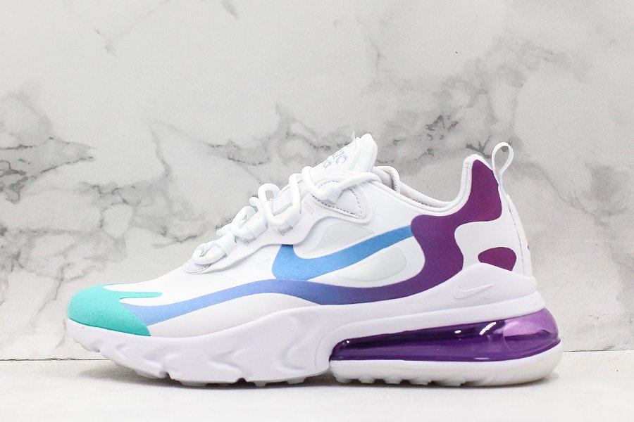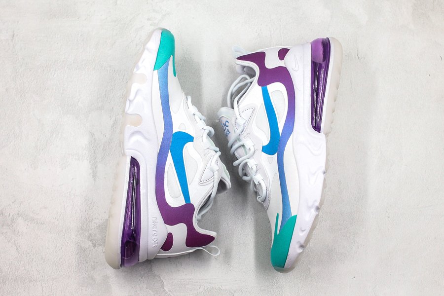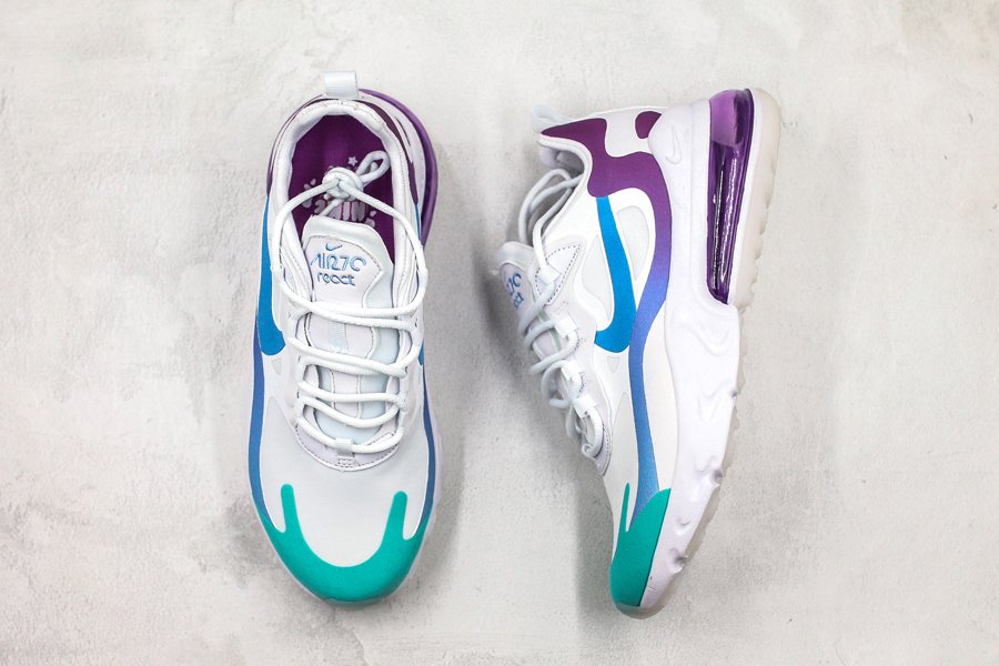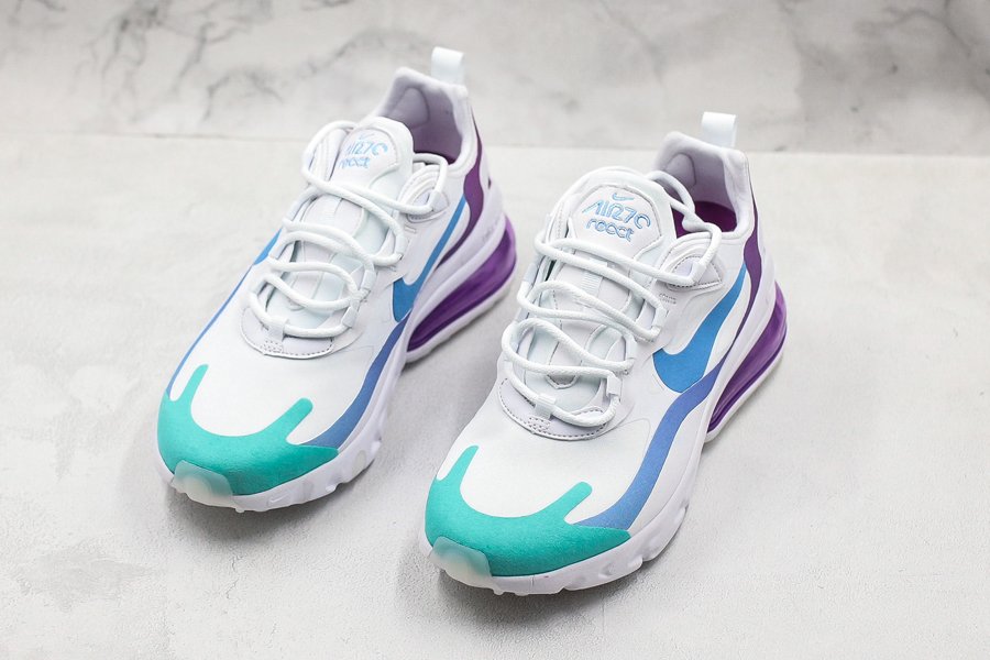With a bold shape, vibrant color schemes, and a combination of two ultra-popular cushioning technologies, Nike’s Air Max 270 React has quickly become a lifestyle favorite. It’s appeared in yet another fresh colorway, one that features a bold gradient shift with a crisp white synthetic base and dusk-style purple on the heel before dressing the midfoot and Swoosh in a soft blue, and finishing with an airy teal on the toebox. The tongue’s embroidery features more blue detailing, a special print arrives on the insoles, and a purple Air Max 270-style heel cushioning unit/white React foam forefoot promise exemplary comfort. The injection of intrigue on this 270 React comes by way of the insole thanks to Korean lettering that phonetically spells out “Nike”, encased in a bubbly heart.