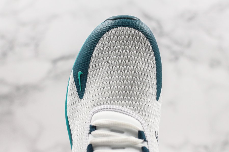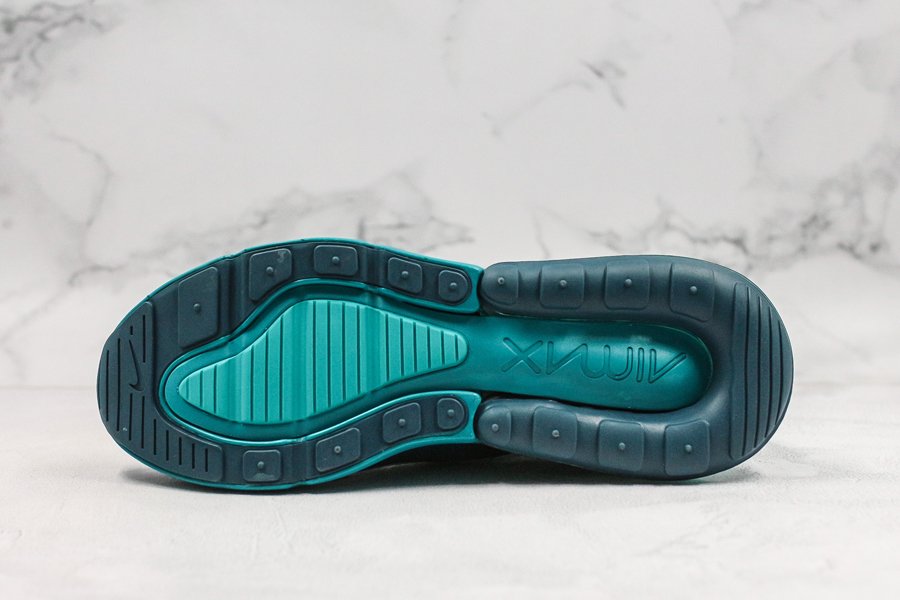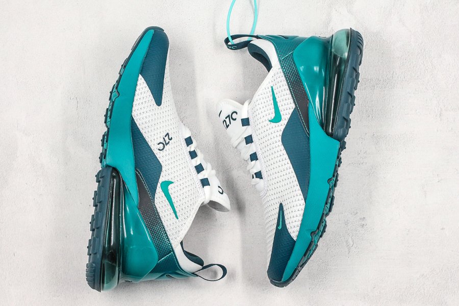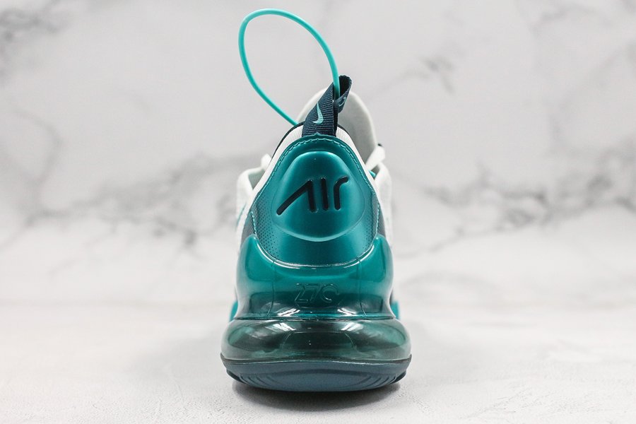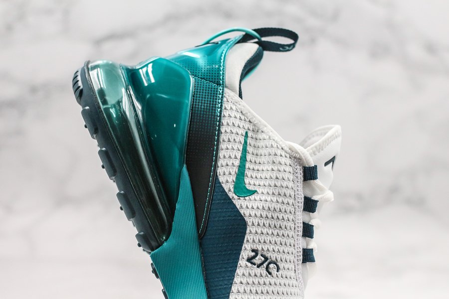 Introduced in bold “Spirit Teal,” the Air Max 270 flaunts a white mesh upper, with the defining teak hue alongside Nightshade hits utilized throughout the profile, particularly on the synthetic overlays, eyelets, Swoosh logos, glossy heel tab and midsole. Finally, the large signature Air Max 270 heel unit in the same teal hue tops off the design.