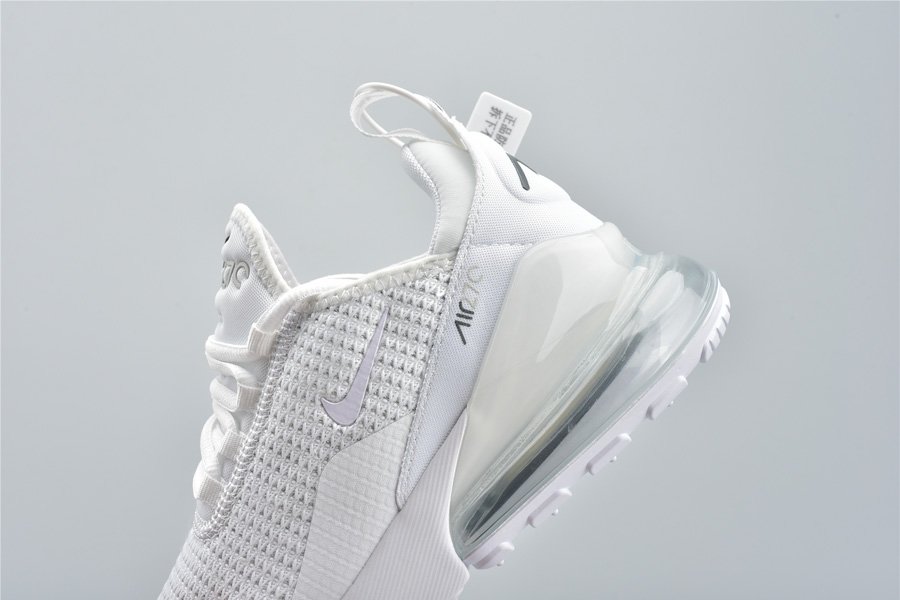 The Nike Air Max 270 sports a new construction with a mesh knitted upper. Colored in White/Pure Platinum, the traditional open knit mesh panels is replaced with a different knit style that features smaller holes. Finally, the signature Air Max 270 heel unit with pops of blue and a white rubber sole tops off the design.