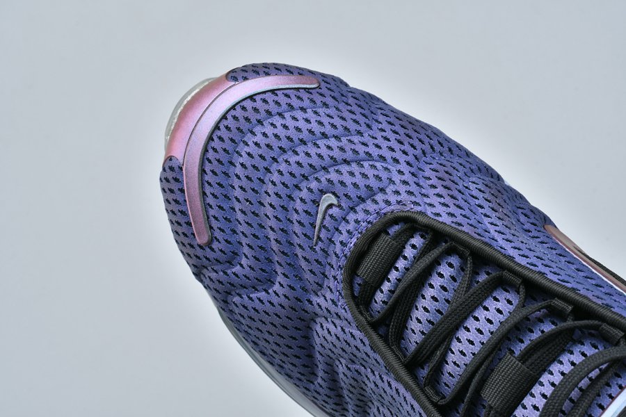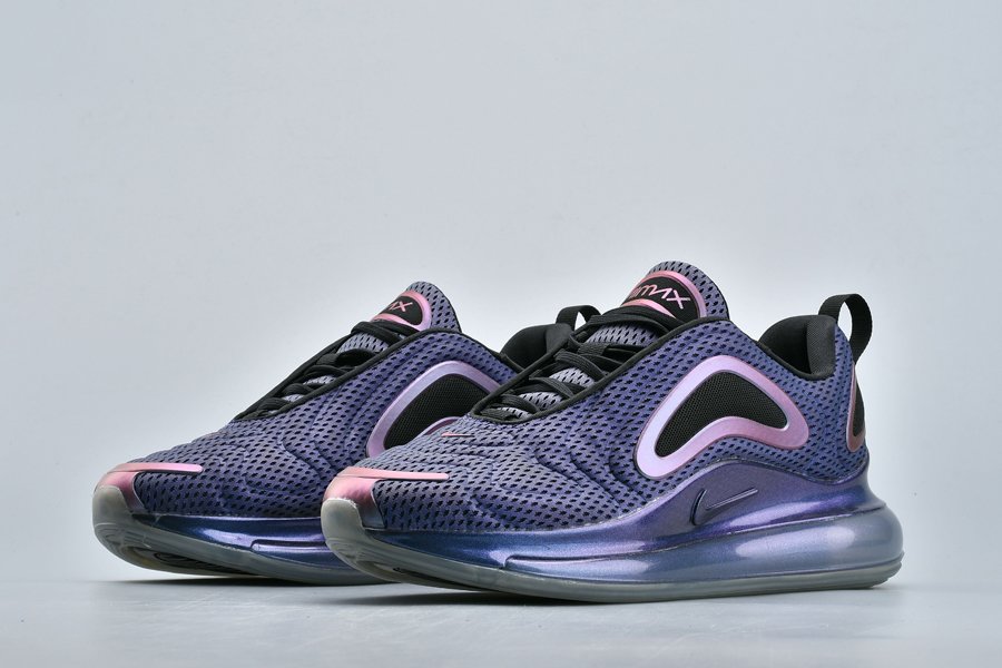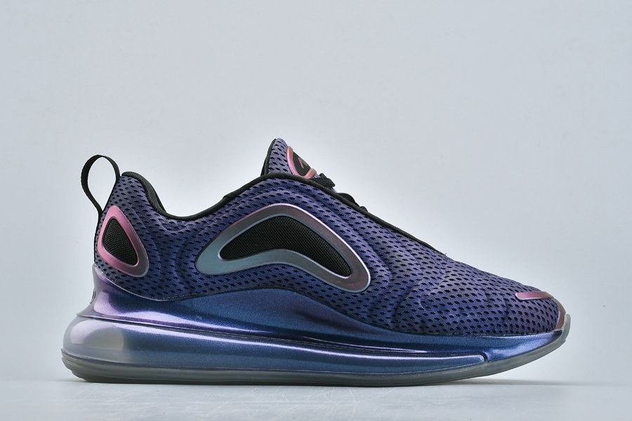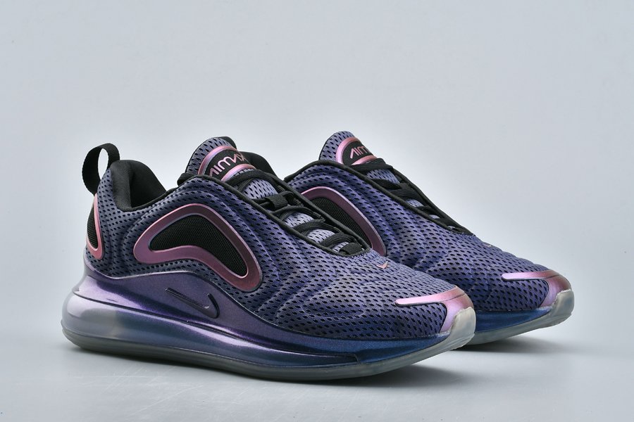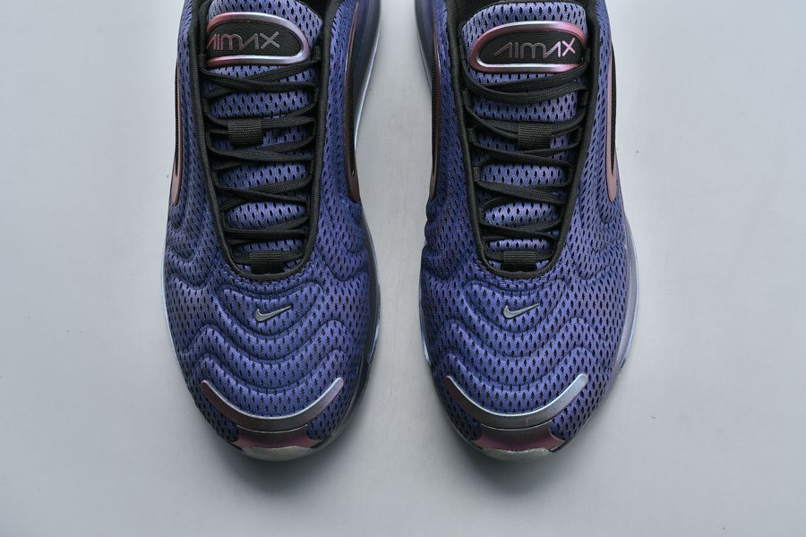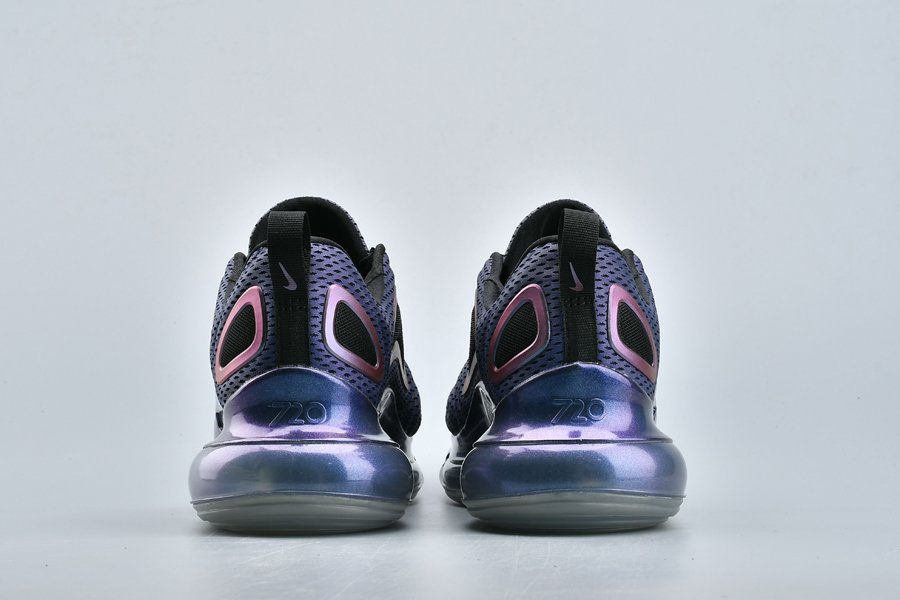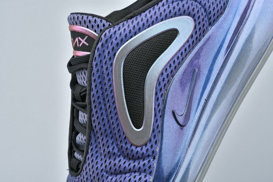 The Nike Air Max 720 “Northern Lights Night” sports a metallic purplish hue across its molded mesh upper with a wavy pattern, the sneaker is contrasted with black accents and metallic silver hits all over. Finally, more metallic purple is used above its midsole, wrapping around the base, while a clear 720 Max Air sole unit tops off the style.