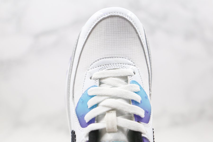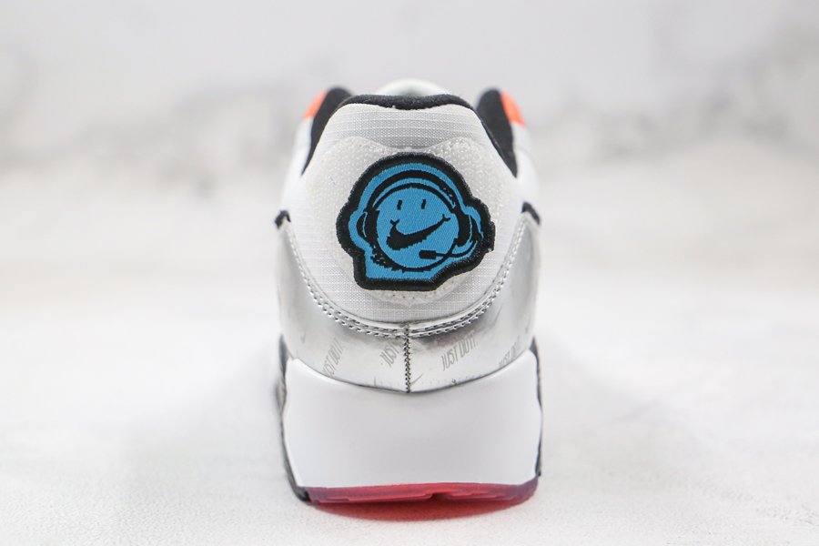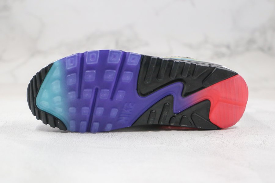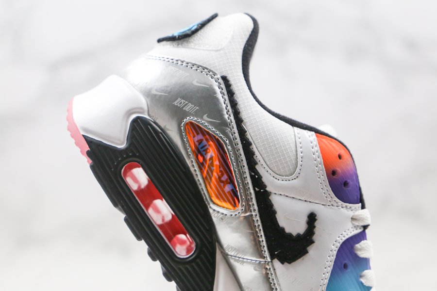 Looking at the upper, crafted with a smooth bright white leather, the blue, red and holographic accents decorate its body. The tongue is accessorised with a shiny logo complementing the design of the Air-bubble on this AM 90 silhouette. A reflective print is presented over most of the shoe with coloured gradients and pixelated imagery. This is continued along the eyelets, with bold red, purple and blue hues gracing the throat area. The striking black Swoosh is presented with a glitch, adding to that video game feel. Below the Swoosh boasts a silver panel, created with a smooth reflective leather printed with the Nike logo. In the centre of this silver we can see a metallic Air unit in true Air Max fashion. The heel of this show is slightly elevated heel with an air bubble to generate comfort and stability within the design. On the inner, the logo is presented in blue on the left shoe and red on the right, illustrating the mismatched, glitchy nature of this design.