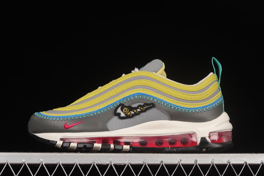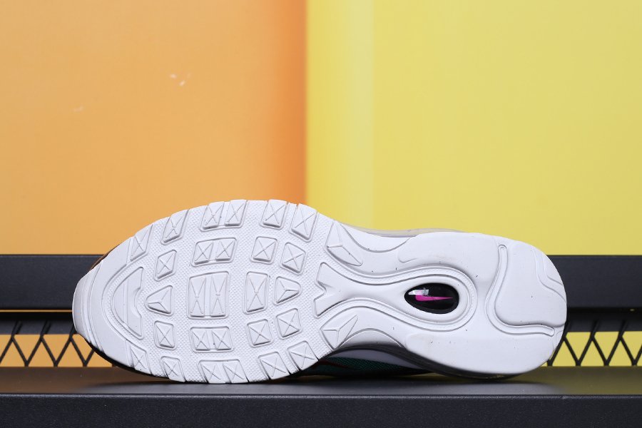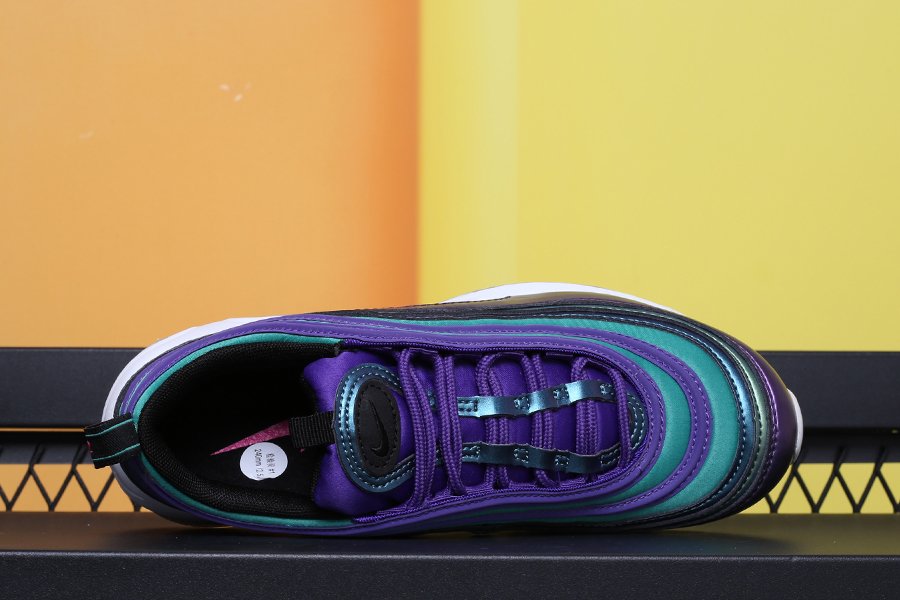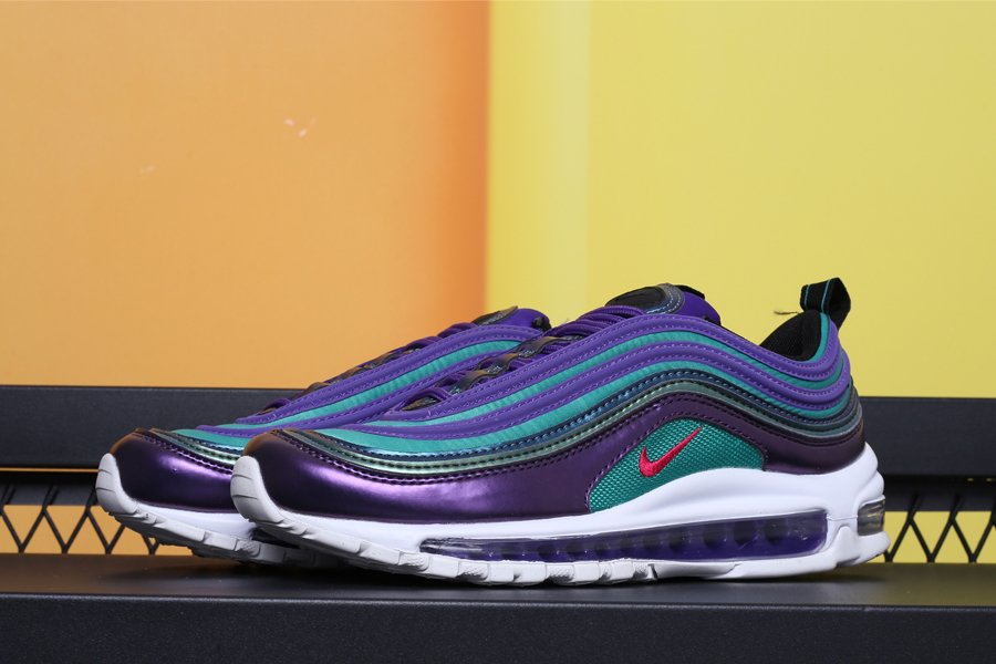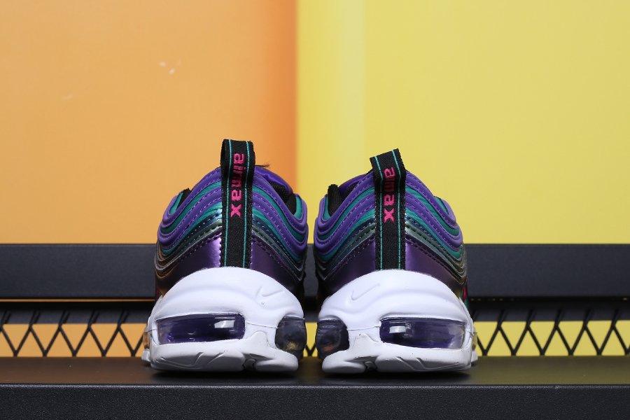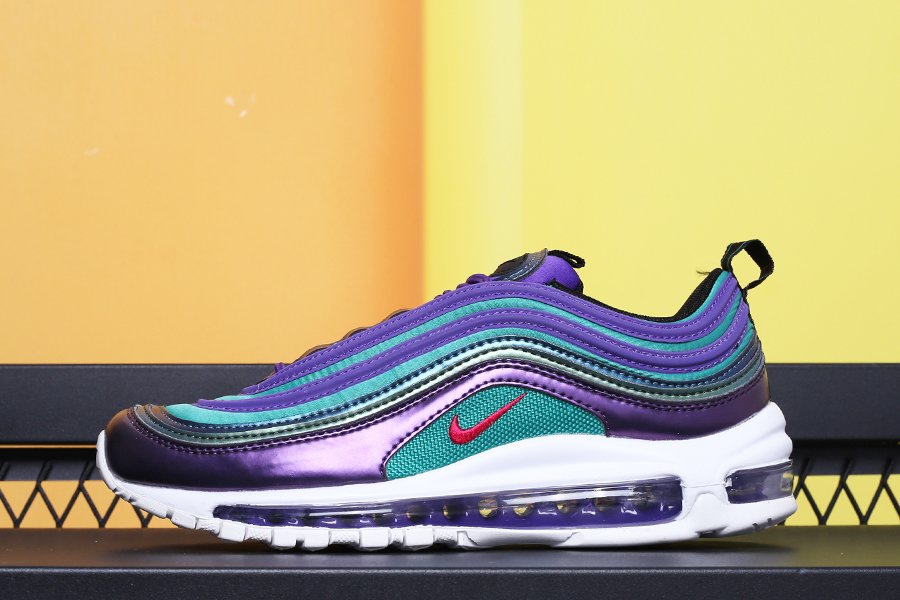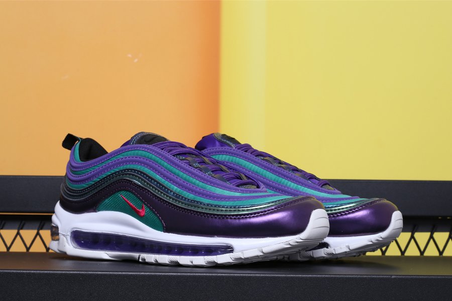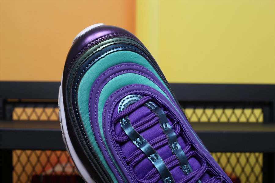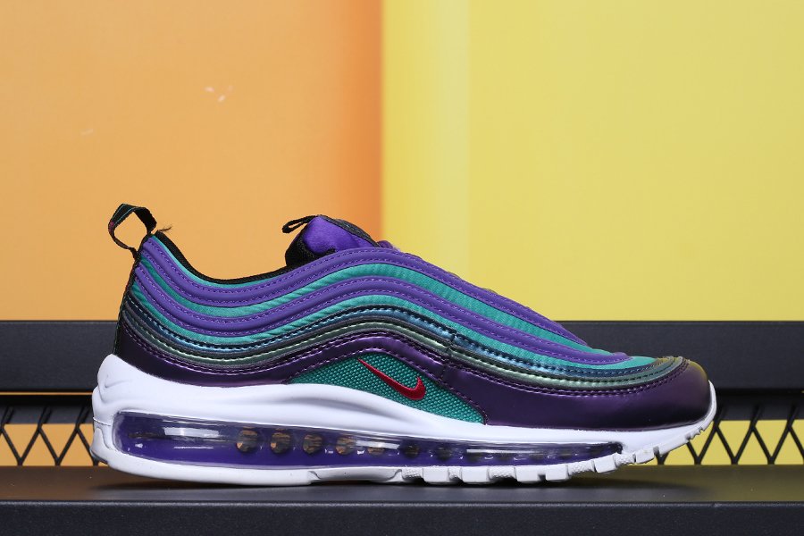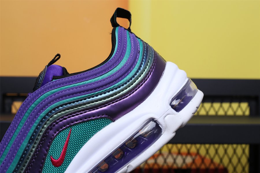 Mermaid vibes rule this Iridescent Nike Air Max 97. The shoe’s overlays feature an slick-style combination of purples, greens, and silvers that shift depending on the viewing angle, while a turquoise nylon serves as a base color. The top two stripes offer a reflective material, a purple tongue provides further colorful contrast, and the look is then tied off with a simple white midsole, purple Air Max unit, and white outsole.