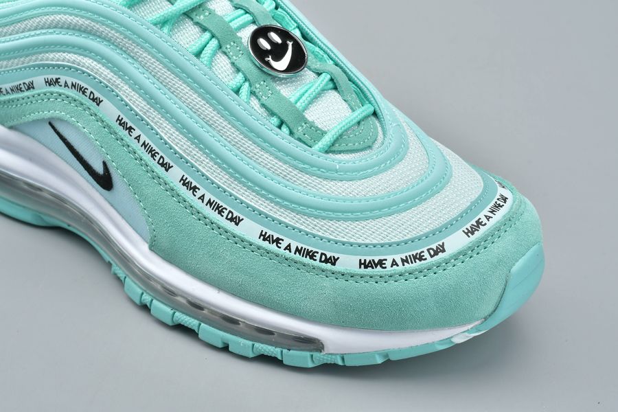 Tonal laces sit up top in the Air Max 97 concealed lacing unit, and the Have a Nike Day smiley face emblem decorates the laces lower down, bringing a cheeky smile to the sneaker. With a mini Swoosh at the top of the tongue, on the sidewall and on the heel label, these 97s are definitely for Nike lovers wanting to make a statement.