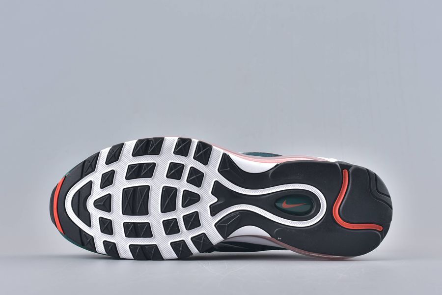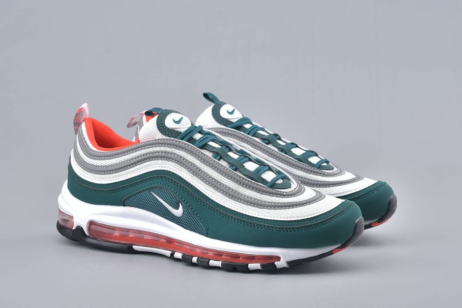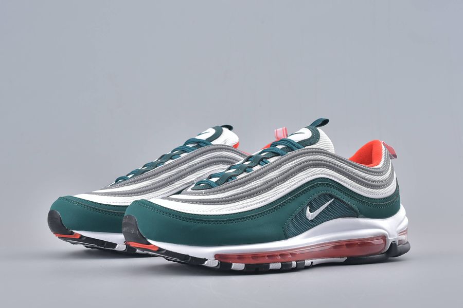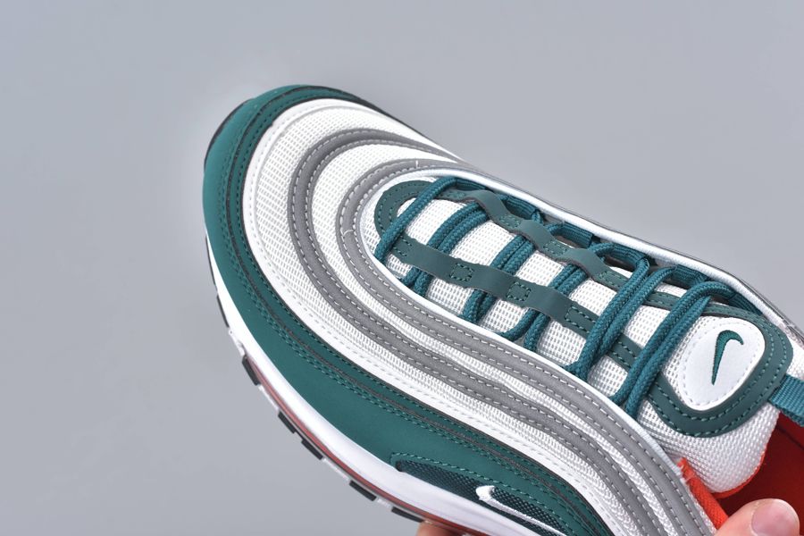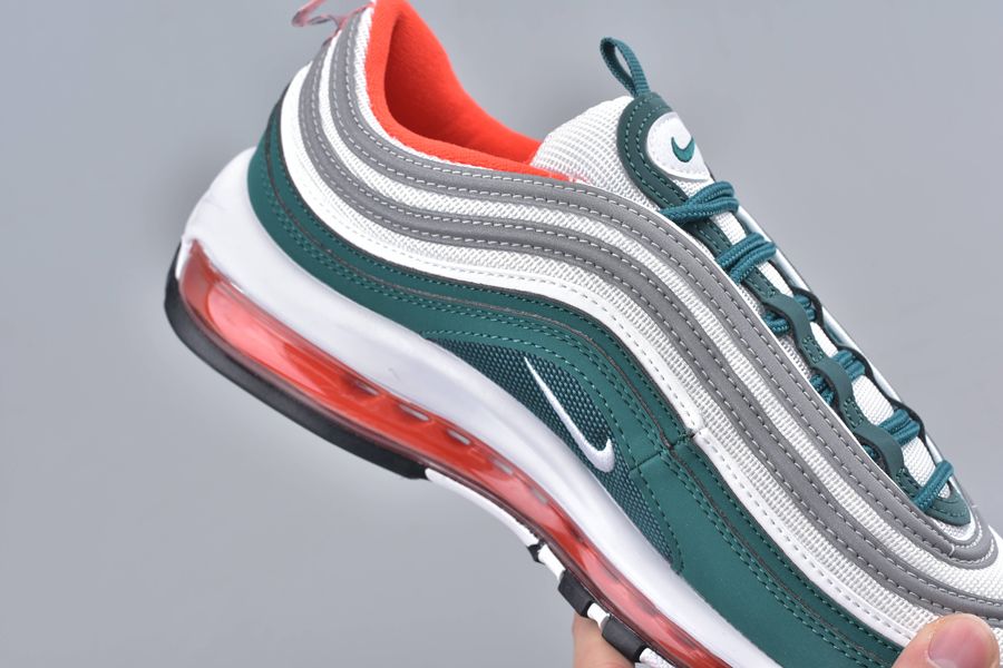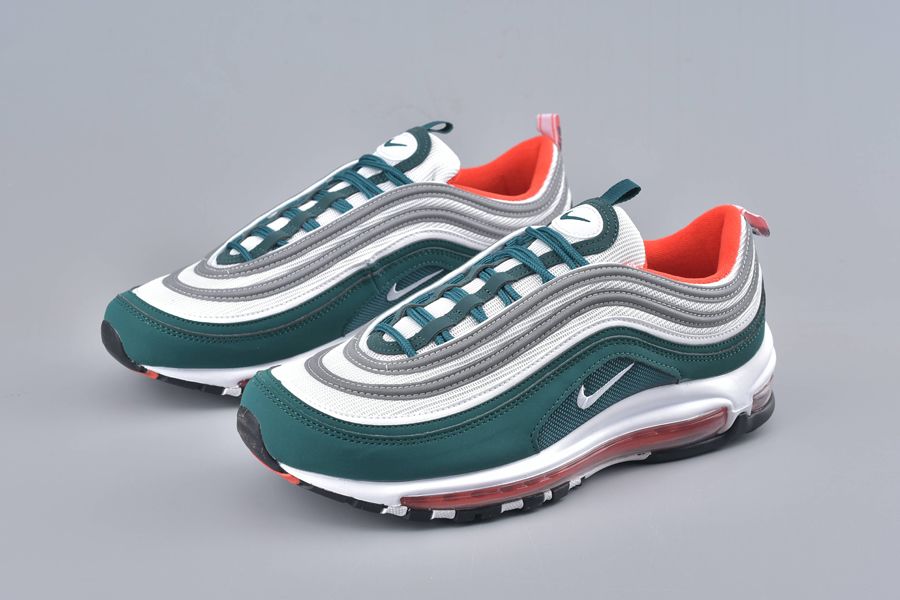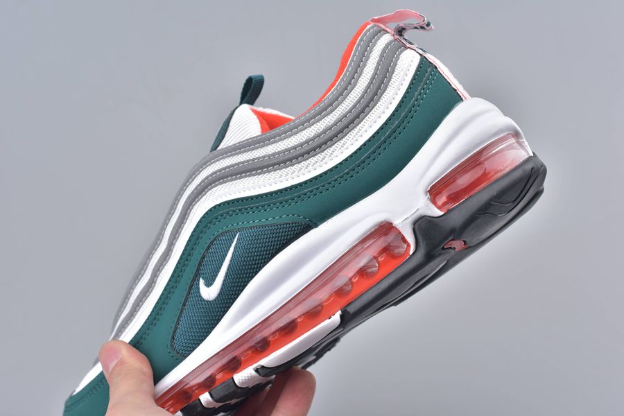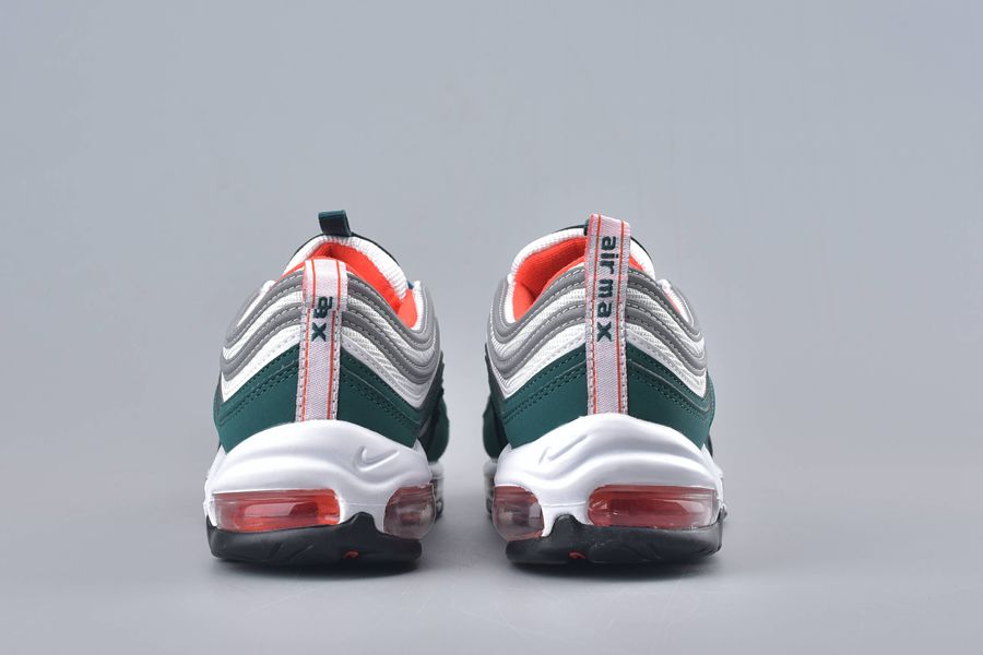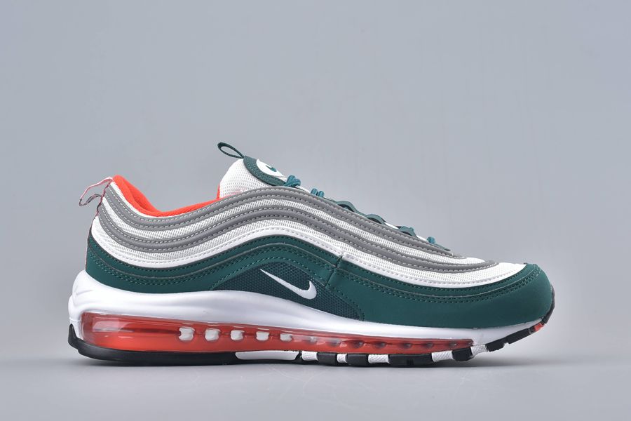 Dressed in a Rainforest, White, Team Orange and Black color scheme. This Nike Air Max 97 is highlighted with Rainforest Green detailing and Orange accents on the inner lining, heel tab, full-length Air Max sole unit and outsole.