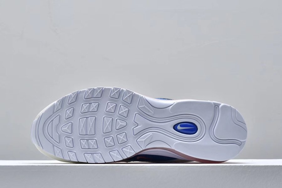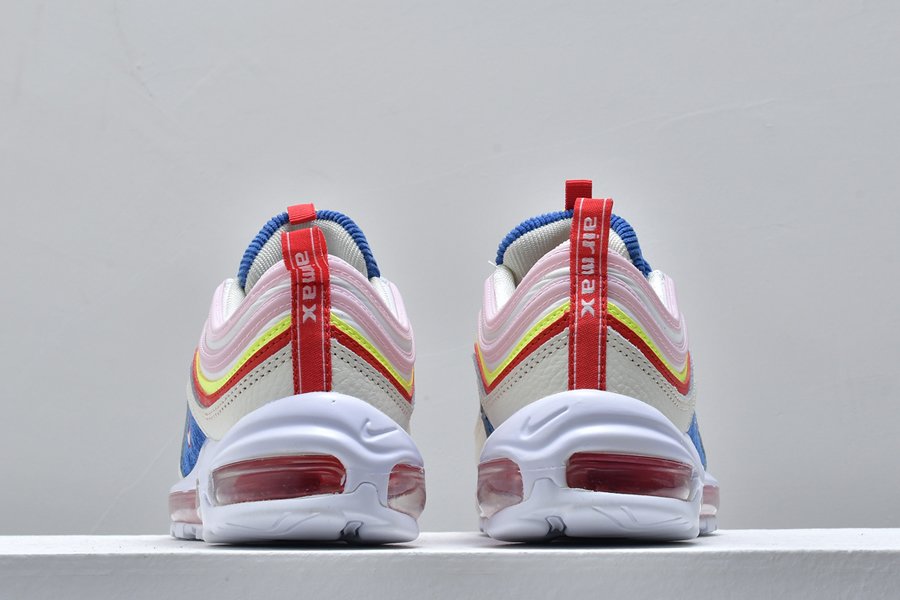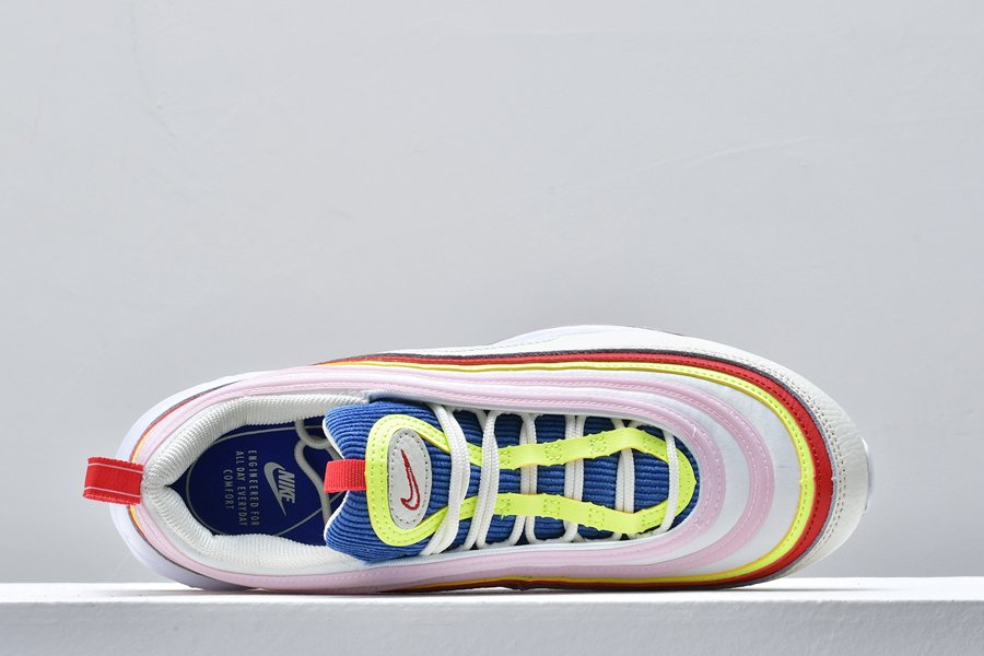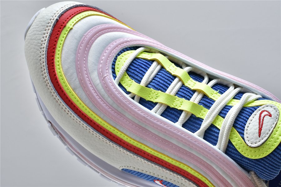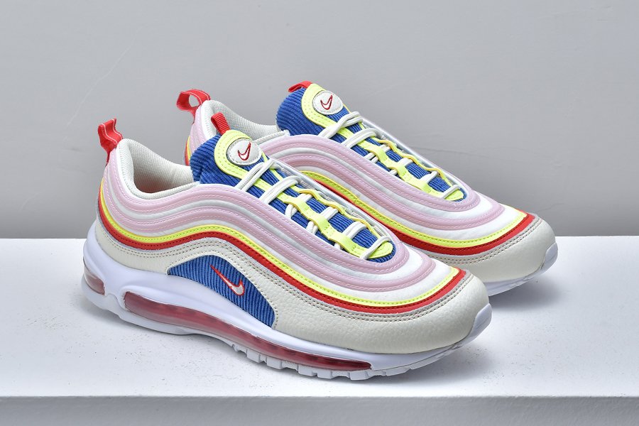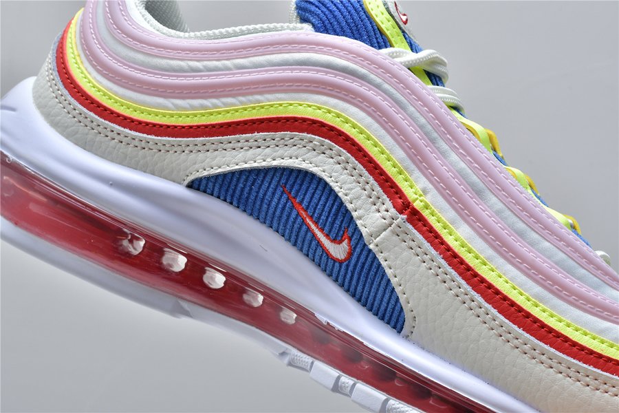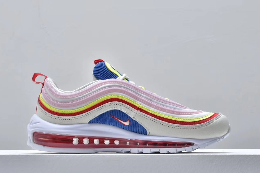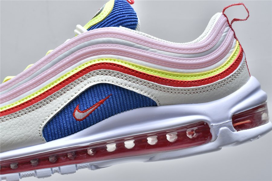 This Air Max 97 is dominated by a white upper with blue, red, and volt accents providing the shoe with a nice pop. It’s also important to mention that this Air Max 97 comes with corduroy on the upper for a unique look. A white midsole and a visible red full-length Air Max unit complete the look on this.