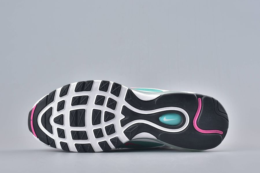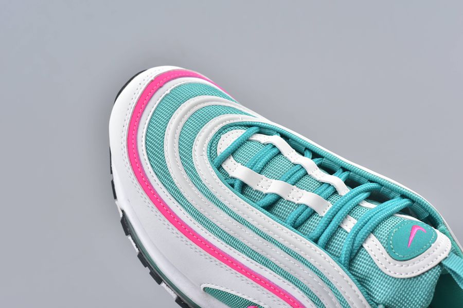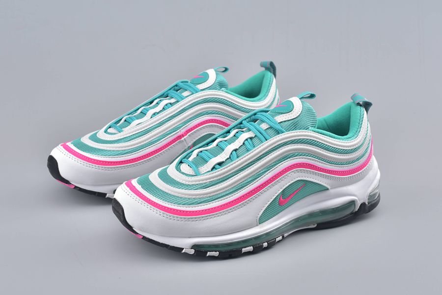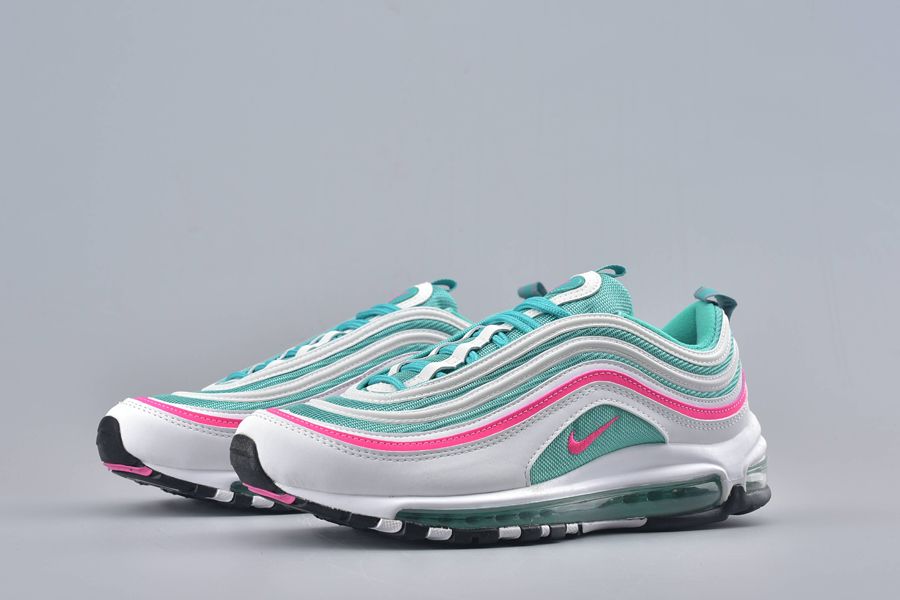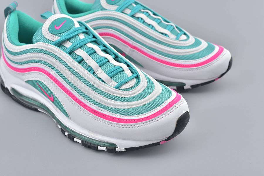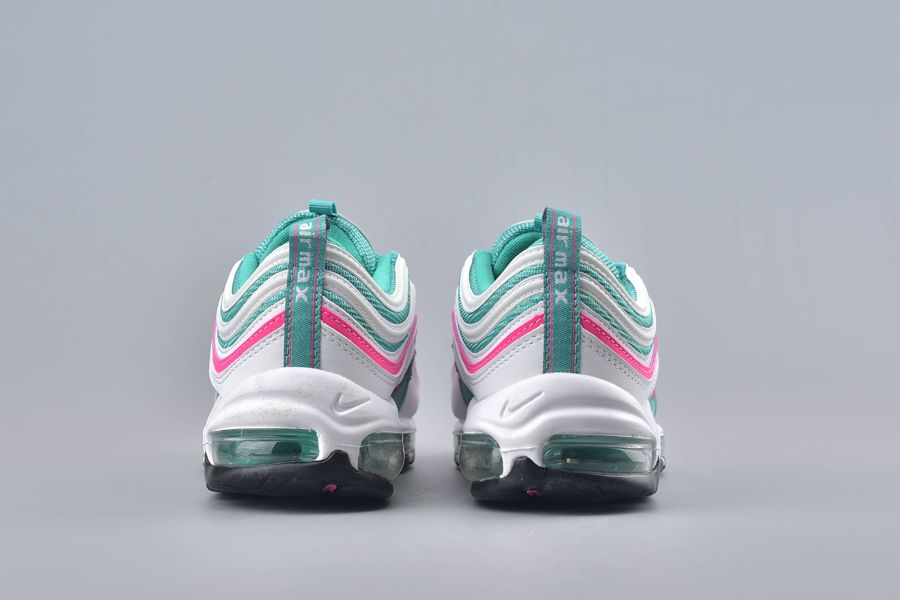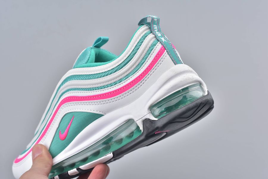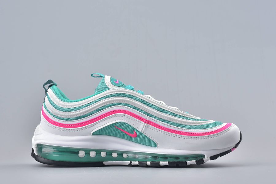 All the classic Air Max 97 details feature and that includes the mini-Swoosh across the sidewall. This gives a bold contrast in pink with that same theme surrounding the shoe to one of the synthetic stripes. To finish this bold silhouette. a full length Air Unit makes an appearance in green underfoot.