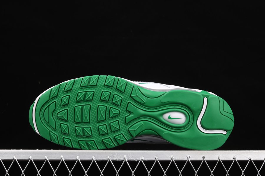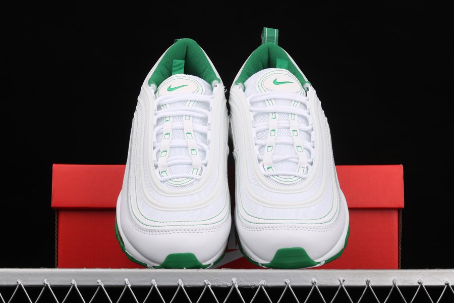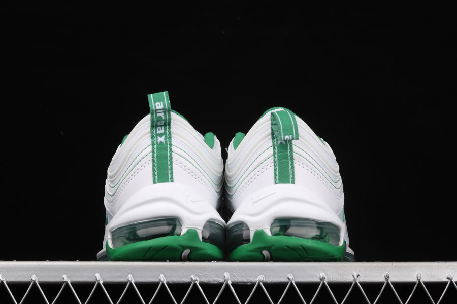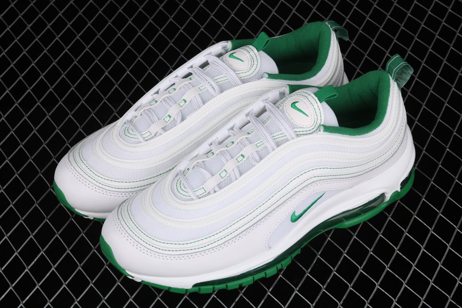 Dressed in white all over, the kicks are constructed with mesh and leather materials to create the signature AM97 stripes running along the top of the shoe. A “Pine Green” shade adds a touch of contrast to the topstitching details, tongue tag, collars and insoles. Air Max branding graces the heel tab, while the transparent Air sole unit reveals more of the green accent color.