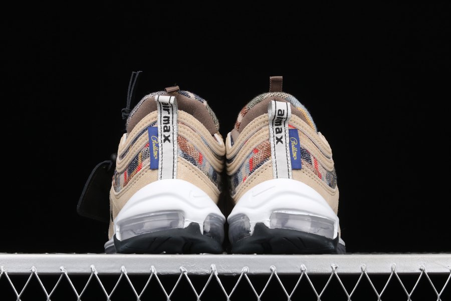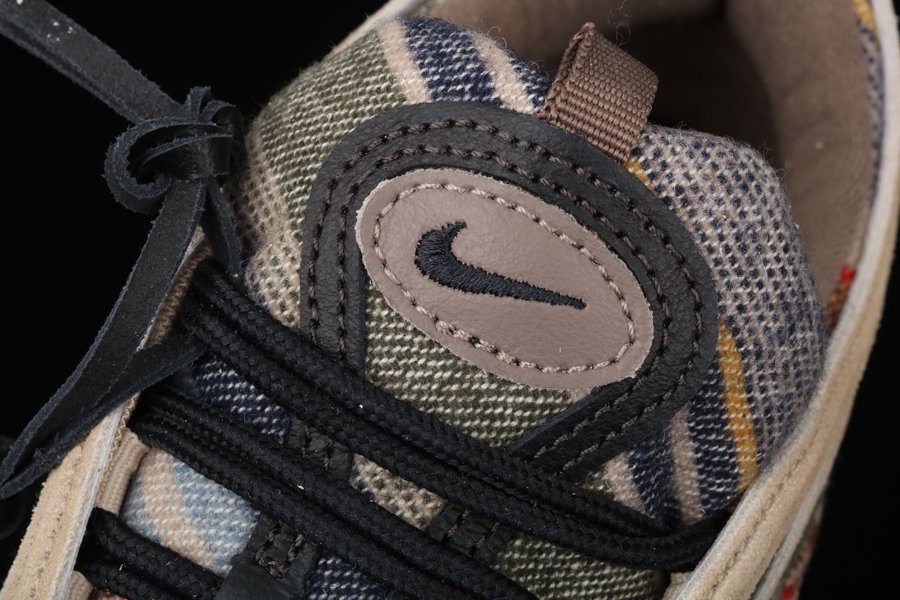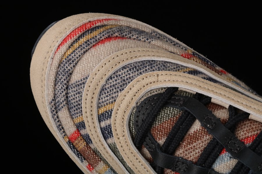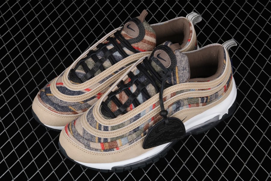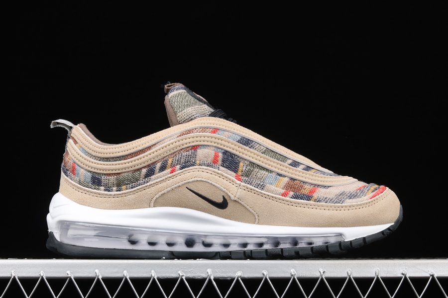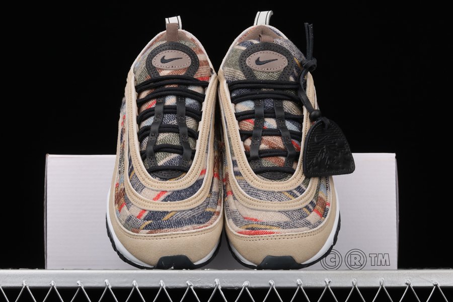 Firstly, let’s have a look at the colour scheme. Sure we say it’s a “Multi”, but the dominance of multiple shades of brown has to be the primary reason for it. Besides, the subtle (maybe not so subtle) colour pops from the waves look totally ready to crash parties this season! The Pendleton Nike collab means this silo will come wearing wool fabric and comfy textiles. However, that doesn’t mean the silo will be too fragile. It can keep you safe just as well! Finally, a white Air Max 97 midsole and a unique hang-tag ith branding finish the design.