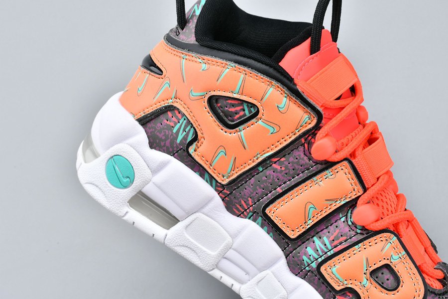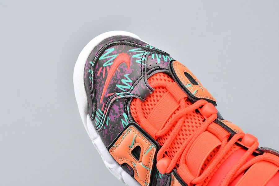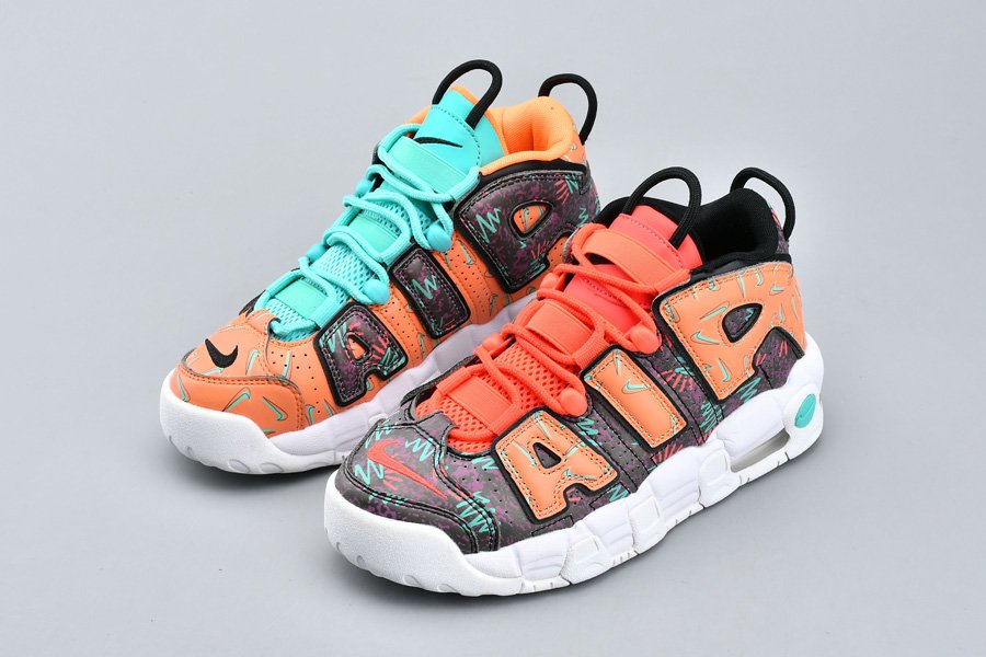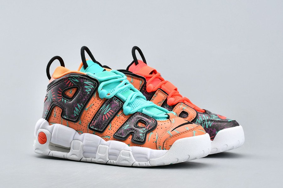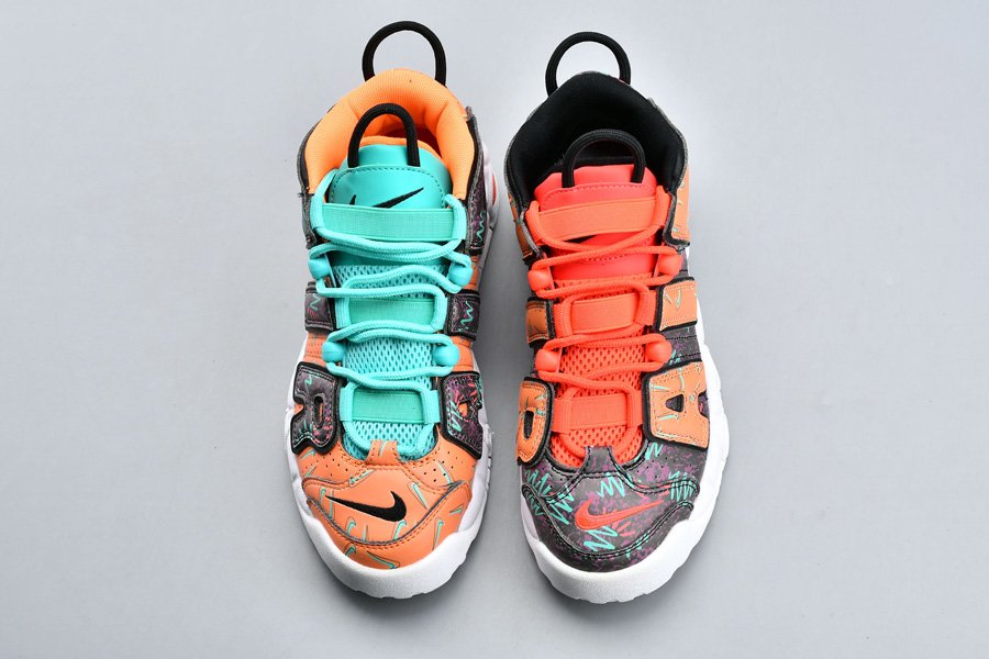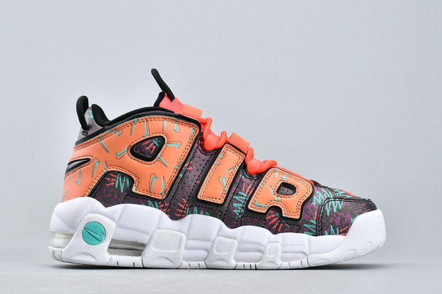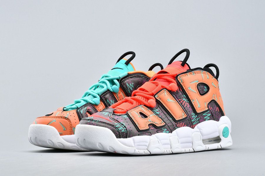 Currently being labeled as the “What The 90s” colorway, this Air More Uptempo takes on a colorful appearance as the shoe takes on a color scheme that includes Total Orange, Black, Hyper Jade, Bordeaux, and more. The orange parts of the upper are hit with miniature teal Swoosh checks while the bordeaux areas are adorned with 90s-inspired graphics. Finishing details include one tongue done in Hyper Jade and the other on orange and a contrasting white rubber sole unit.
