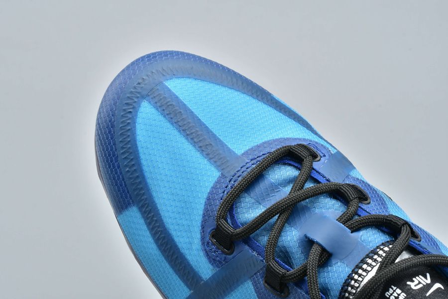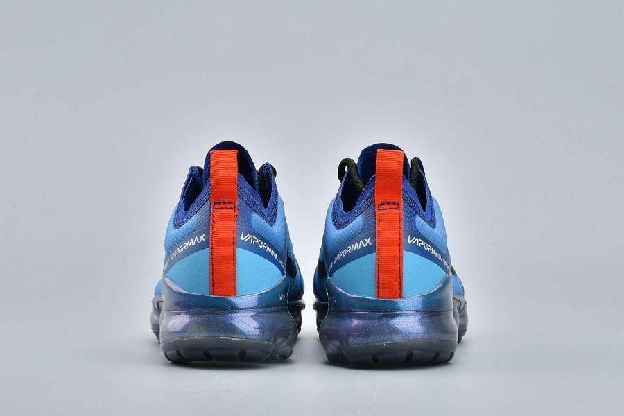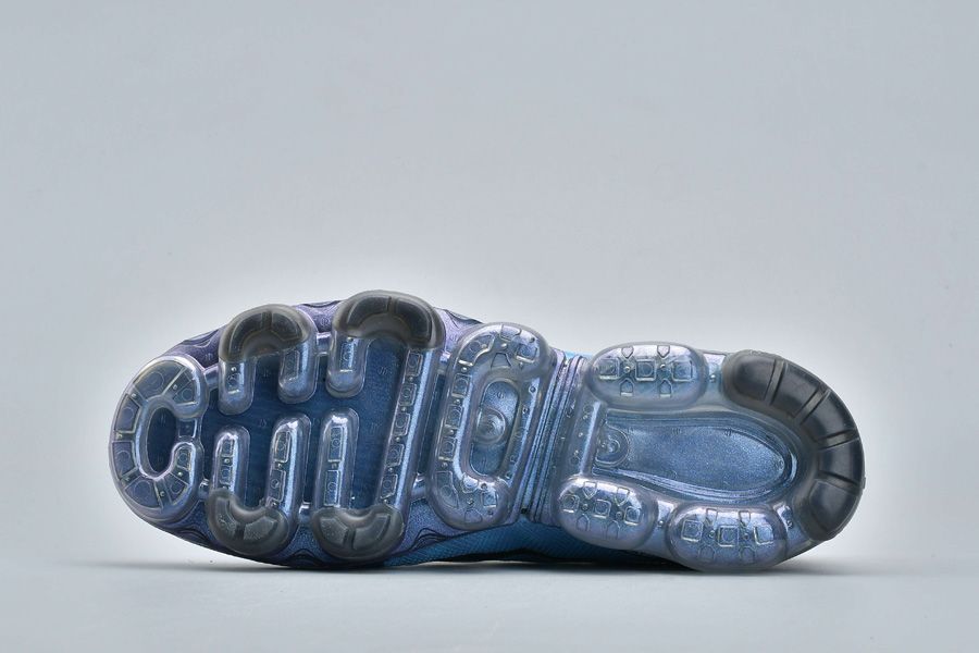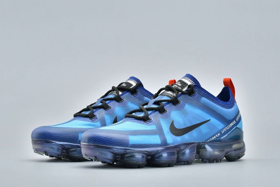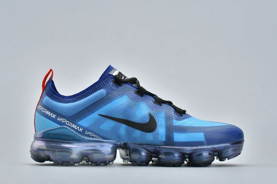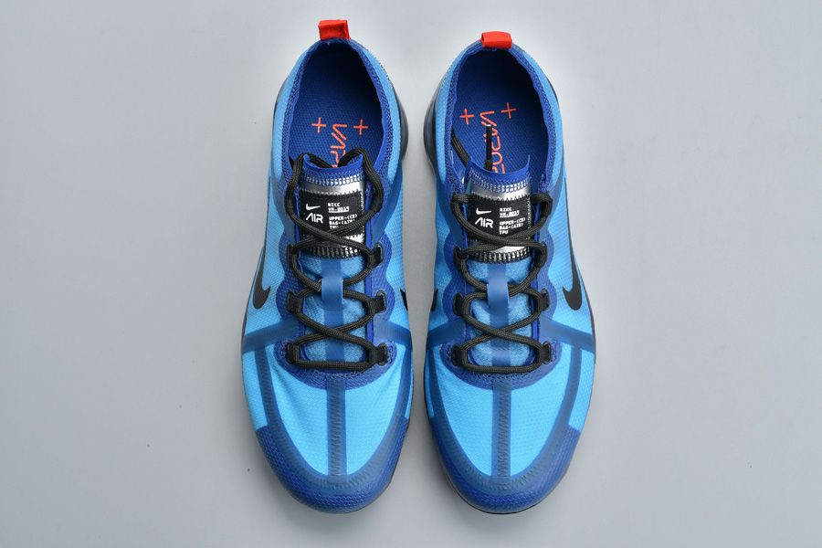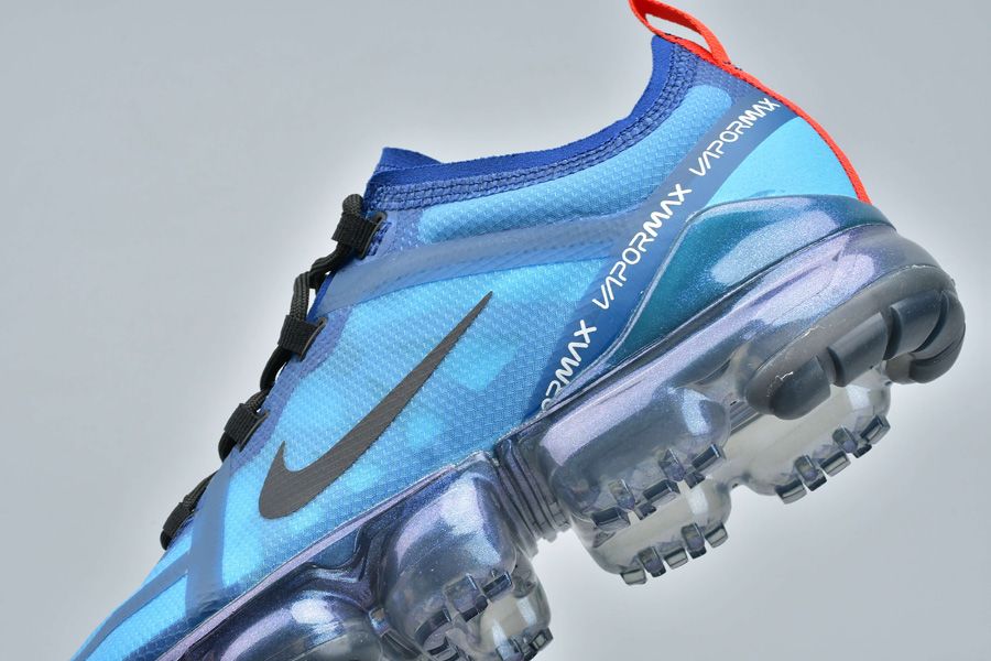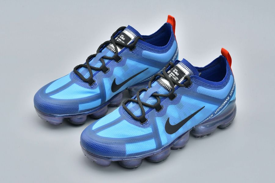 This Nike Air VaporMax comes highlighted with various shades of Blue across the upper. In addition we have Silver on the tongues, Black accents and Red on the heel pull tab and insole. Instead of using Flyknit, Nike has swapped their knit material for a translucent TPE-infused upper. Completing the look is a Blue VaporMax Air Unit.
