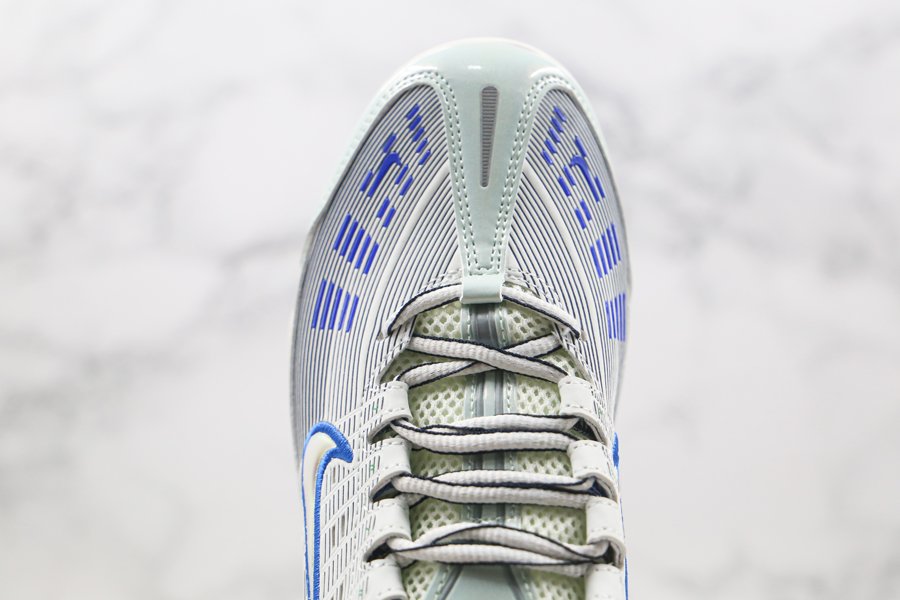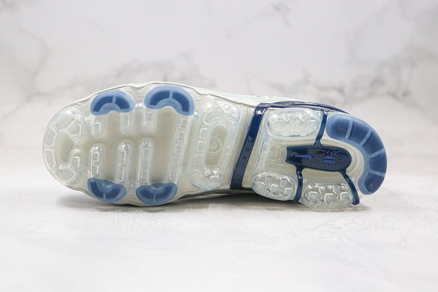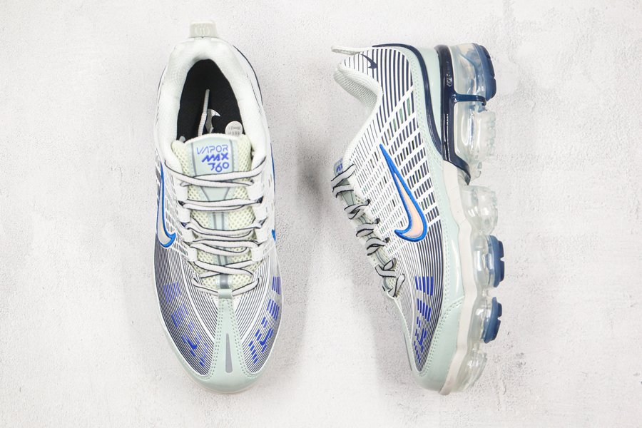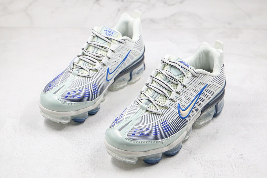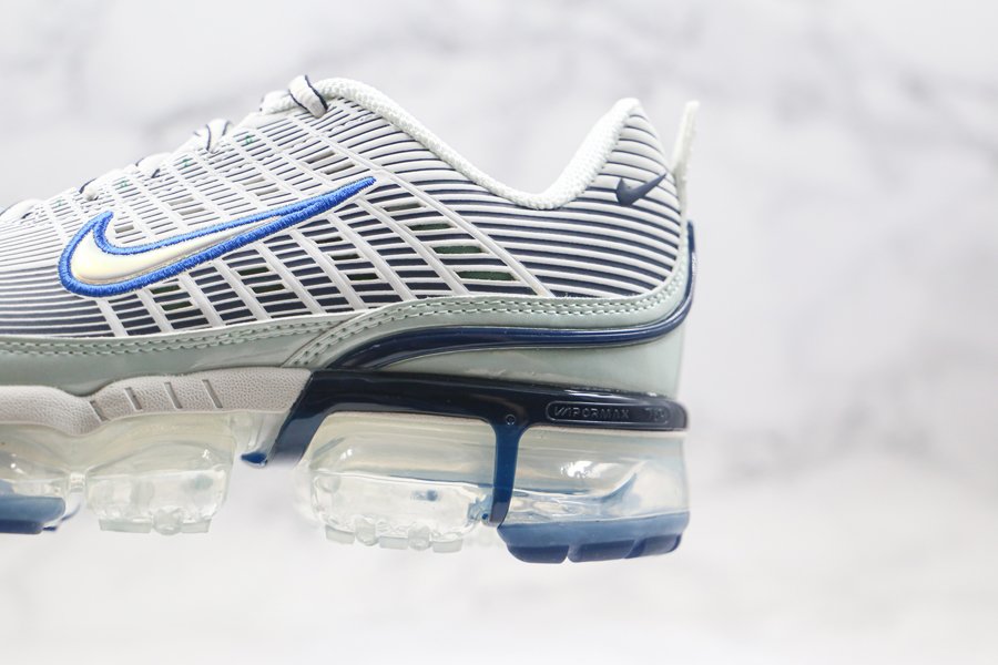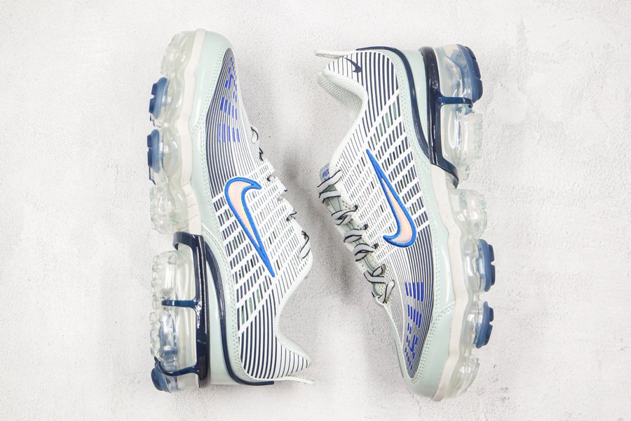 The retooled sneaker from 2006’s boasts a subtle Pure Platinum base with elegant Spruce Aura wrapping the mudguards and toe caps. The rear-end and upper’s lineal detail is loaded with bold navy blue for maximal contrast, while strikes of Racer Blue along the forefoot, tongue branding, and profile Swooshes add some extra pop. Completing the design is a white midsole piece and a Spruce Aura, Translucent and Racer Blue VaporMax sole unit.