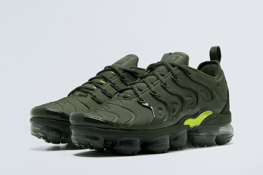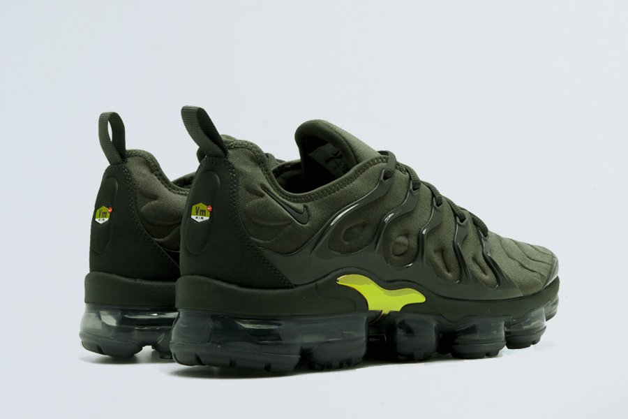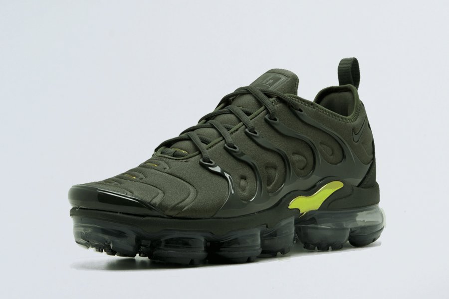 The Air VaporMax Plus “Cargo Khaki” combines the upper from the Air Max Plus with VaporMax’s unique cushioning profile. It features optimal cushioned support and a lightweight neoprene design for a supportive fit and feel for any occasion. The iconic synthetic cage upper infuses shiny texture and design for a sleek finish that’s complemented with a dark green and khaki colorway.