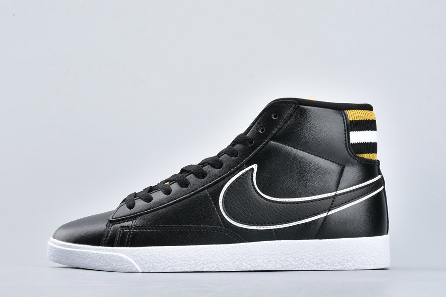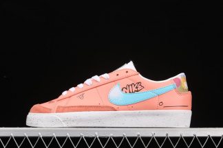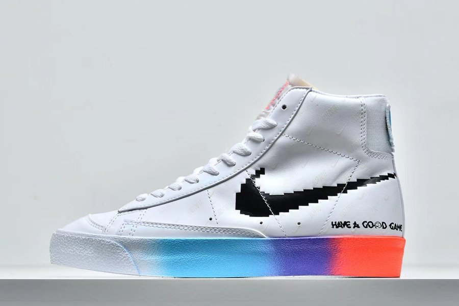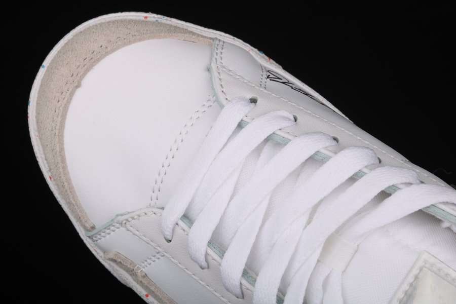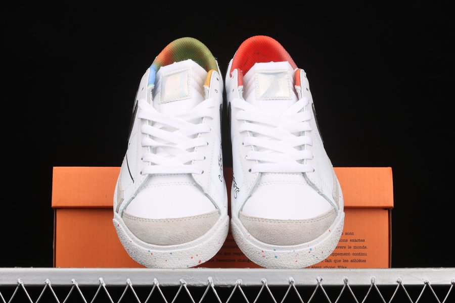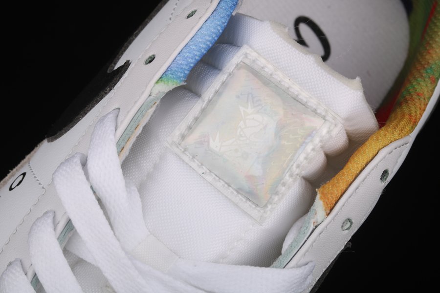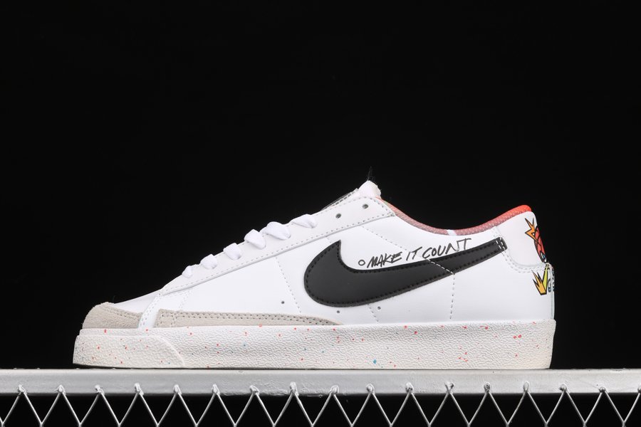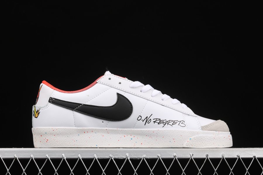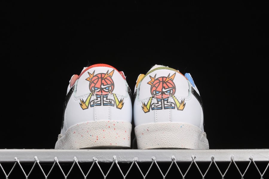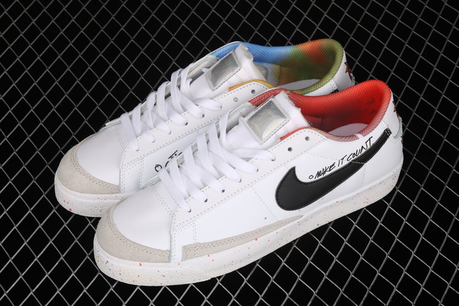This Nike Blazer Low features a White leather upper with Black Swooshes on the sides and messages throughout the shoe like “Make it Count” and “No Regrets” on the sides. Highlighting the shoe is the hoops character appearing on the heels as well as being displayed on the iridescent tongues. A gradient collar lining atop a multicolored speckled midsole completes the design.