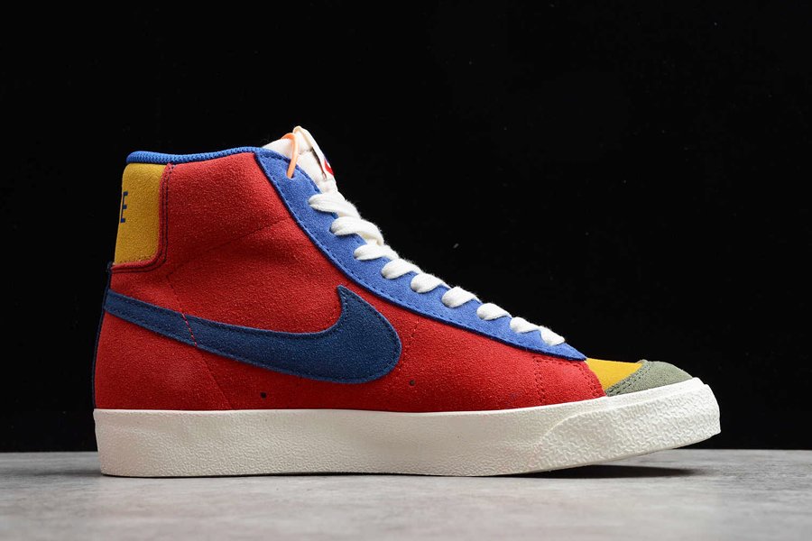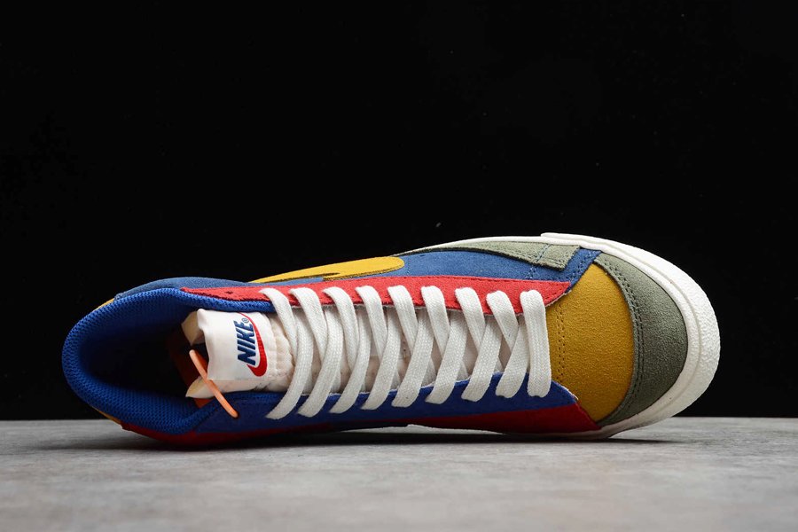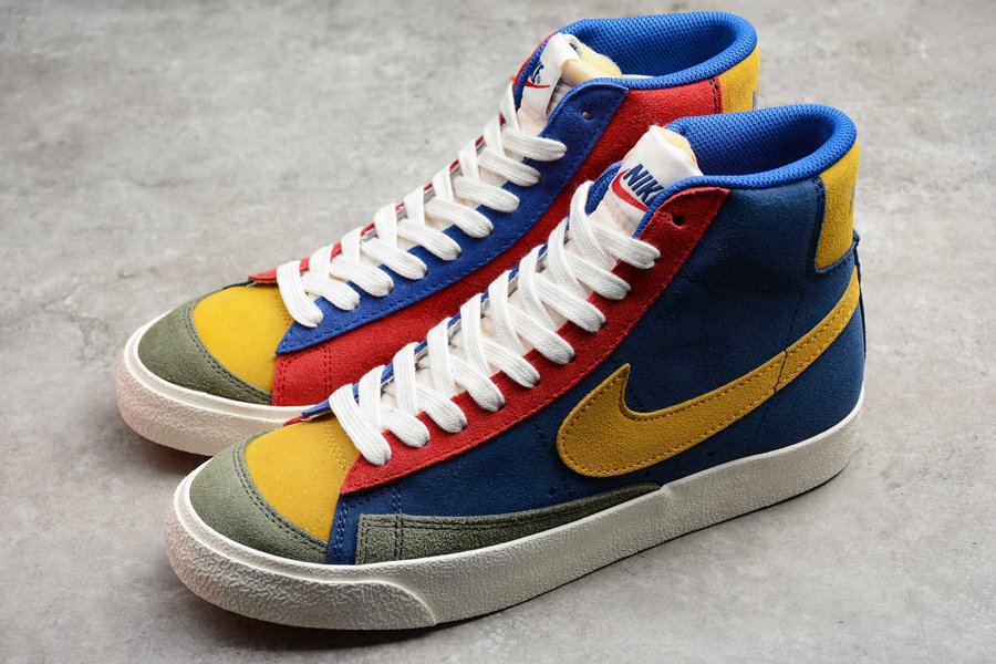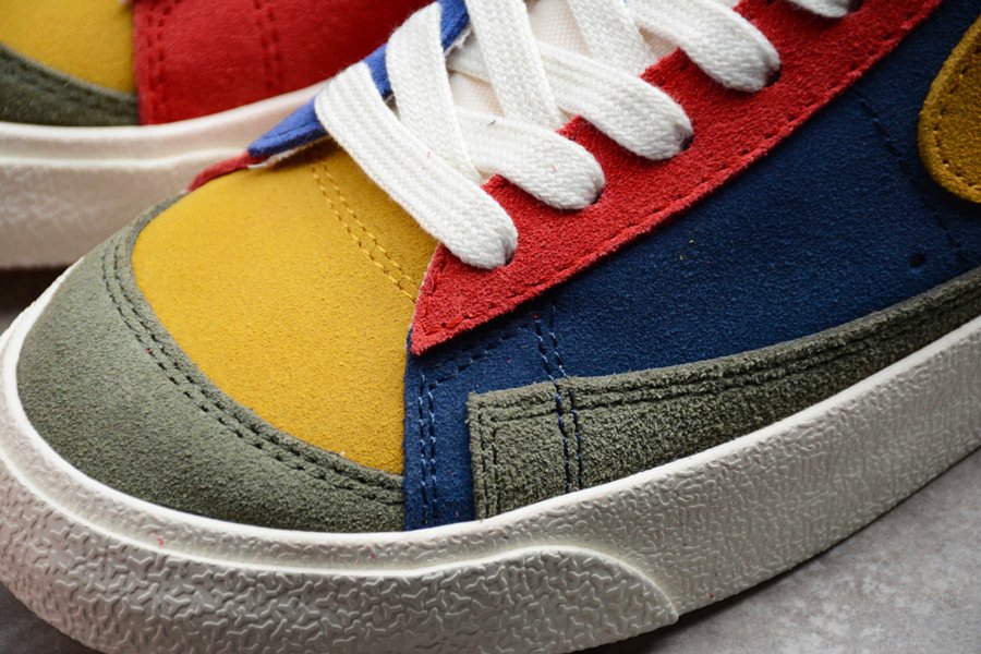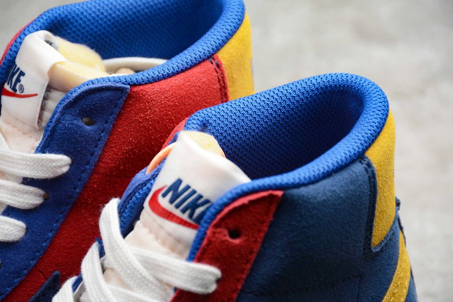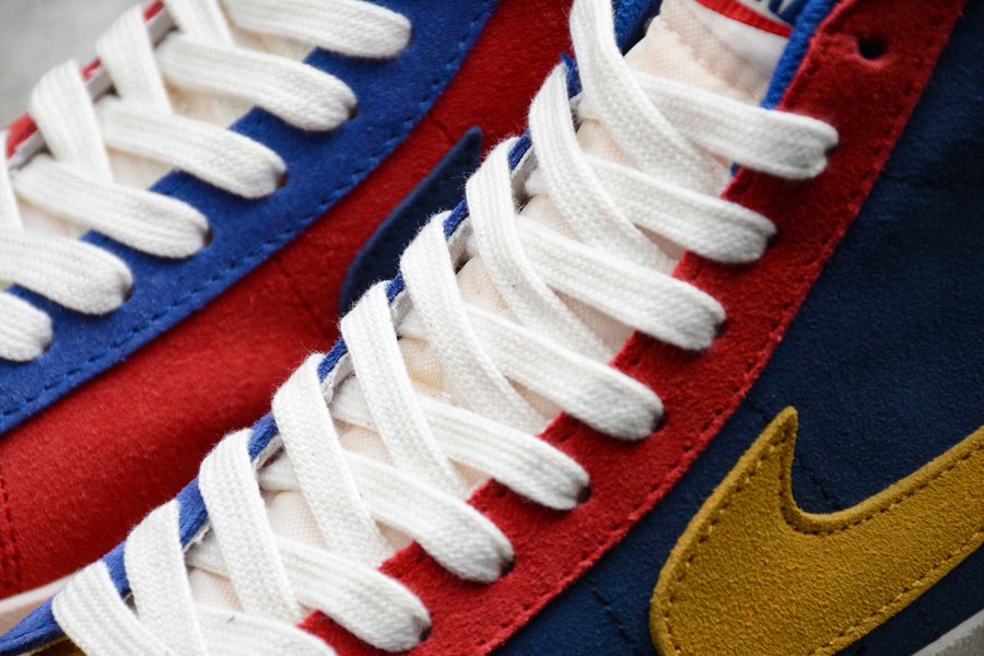 Featuring a nautical theme, the outer paneling, and inner paneling feature mix-matched color-blocking that creates an interesting new look. Arriving with Coastal Blue on the outer portions and Red on the inner, other suede overlays are added onto the build with yellow painting the toes, heel, and Nike Swoosh and Olive being added in for extra detailing around the toes.