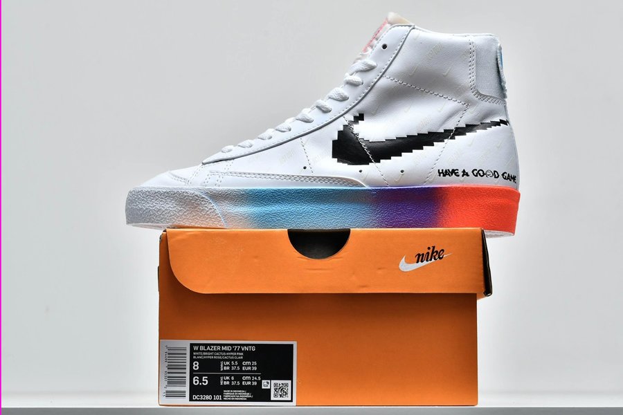 Celebrating the gaming culture, the Nike Blazer Mid ’77 Vintage Have A Good Game is equipped with updated details that gives the model a brand new look and feel. Done in a White, Bright Crimson, and Black color scheme standout features include the digitalized Swoosh logo, colorful gradient sole and a removable backtab that reveals a patchable surface that allows you to attach a smiley face patch that gives you an alternate look. Additionally, the White upper glows in the dark revealing all-over Nike and Swoosh branding along with “Have A Good Game” print across the lower heels.