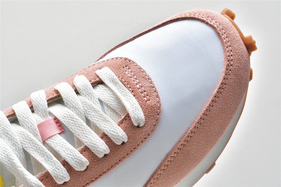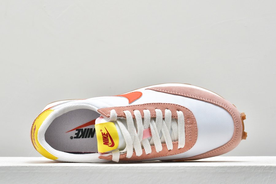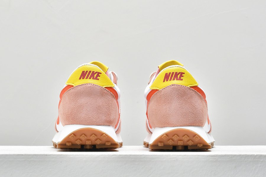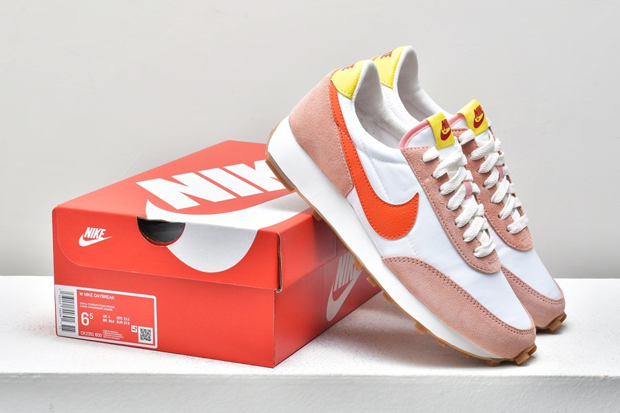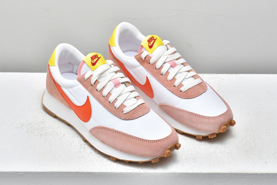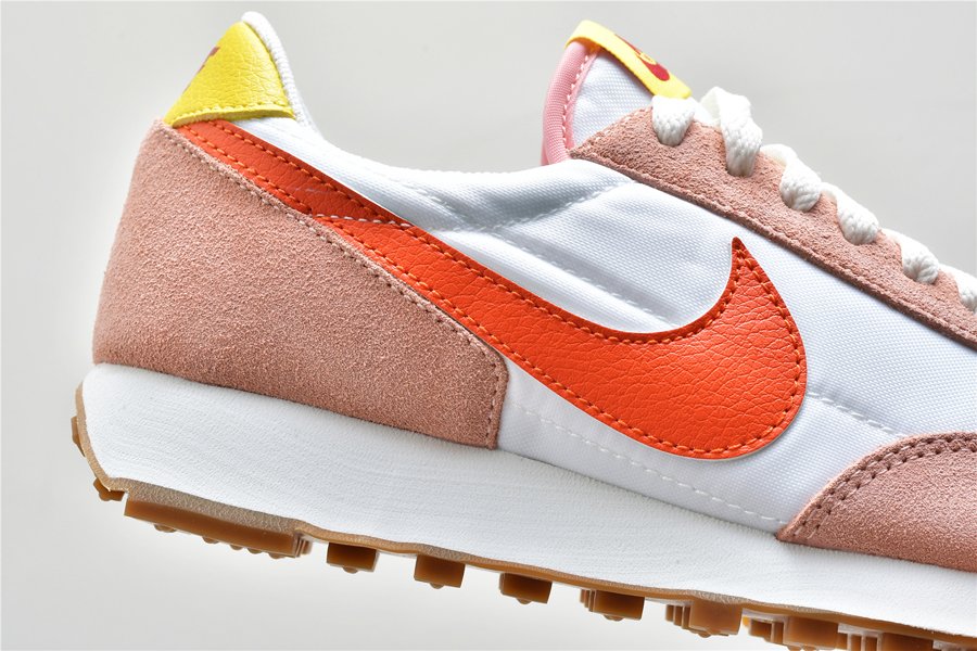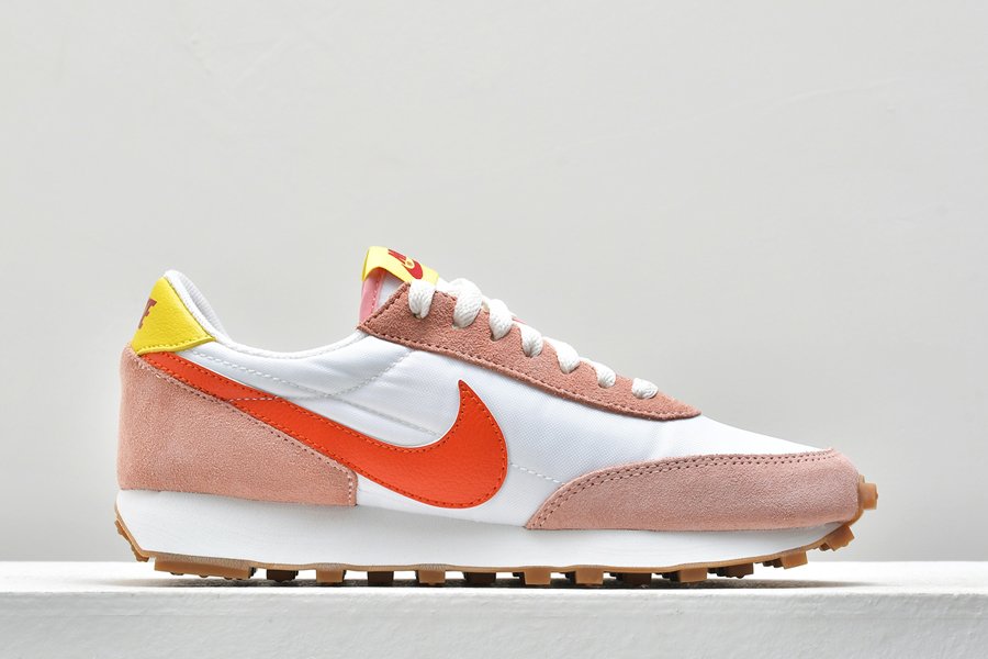 The Nike Daybreak receives a bright overhaul, dressed in this perfectly peach colourway that we’re obsessing over! This white and red Daybreak features vibrant Swooshes across the sidewalls that stand out against the clean white nylon upper. Dreamy pink suede overlays add a contrast of colour and texture to the heel, lace unit and toe cap with added accents of bright yellow on the tongue.