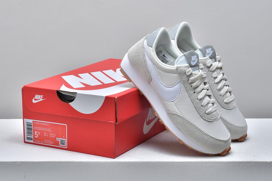 A Nike icon that helped beat Summer Games records in 1984, the Daybreak is a comfortable option for the city today. Made from a lightweight combination of nylon and suede, the off-white and grey uppers of this women’s pair are joined by an iconic waffle sole – in a classic gum hue – below.