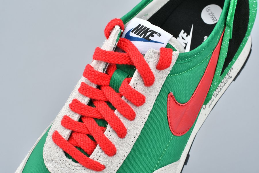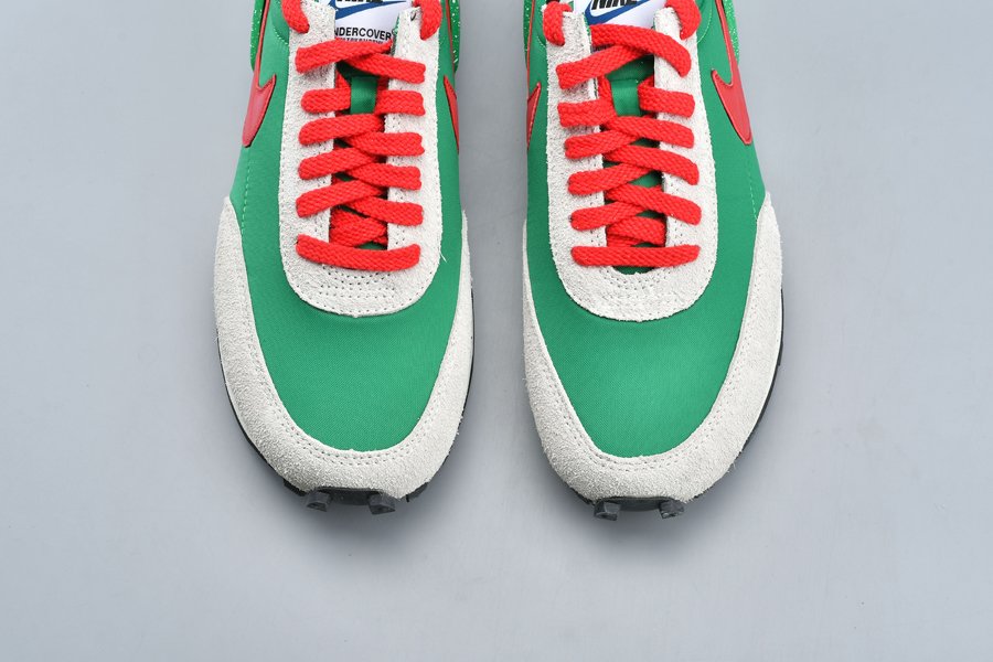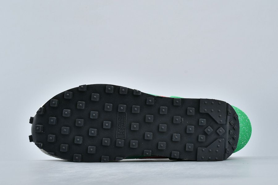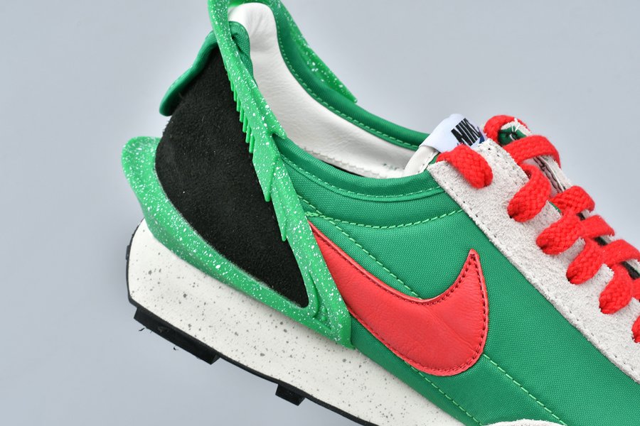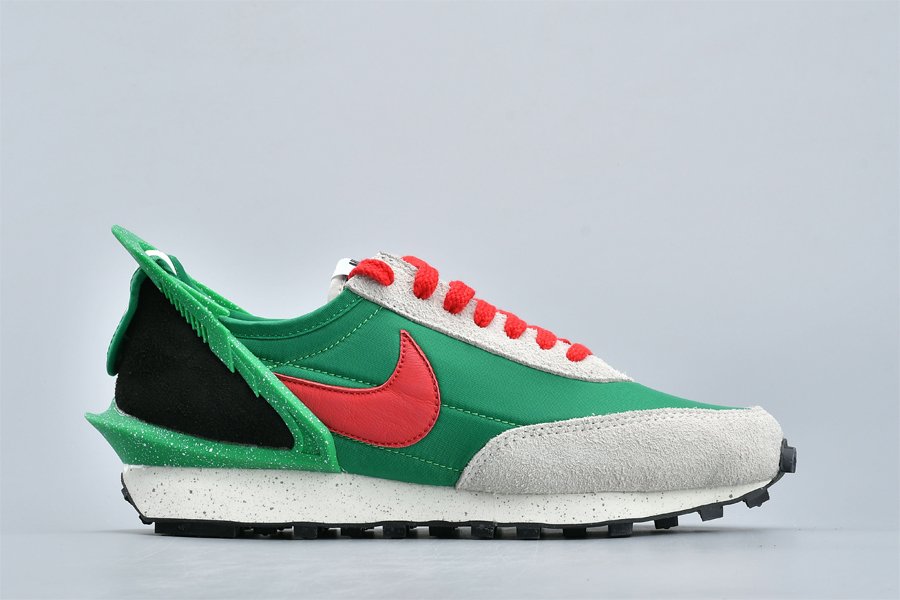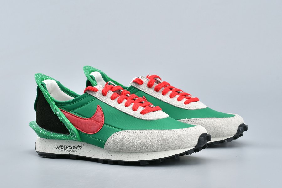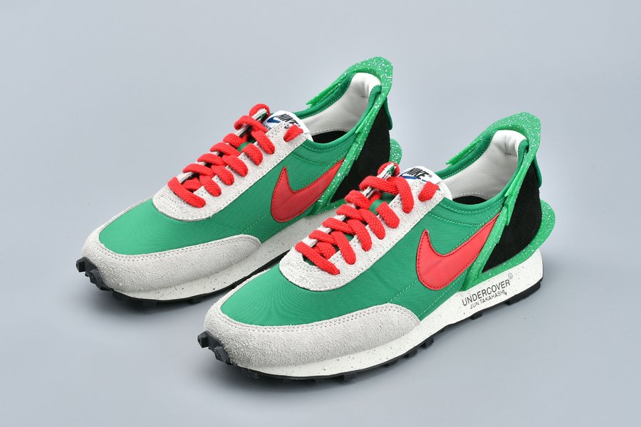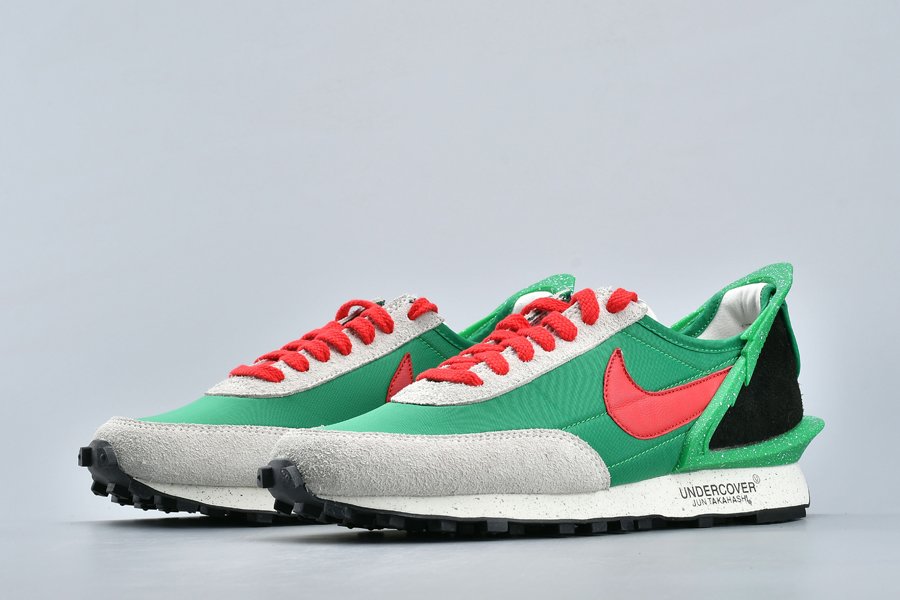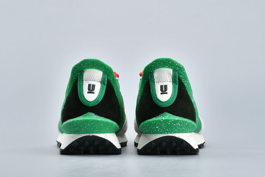 The Undercover x Nike DBreak “Lucky Green” is another impeccable look for the unique reconstruction of the Nike Daybreak by Undercover designer Jun Takahashi. The vintage running shoe is redesigned by the Japanese fashion label with an added TPU heel clip that extends to the top of the heel for a futuristic aesthetic. This colorway features an eye-catching Lucky Green nylon base with light grey suede overlays and red and black accents. Speckled details are added to the heel clip as well as the midsole, the latter which also includes Undercover branding printed on.