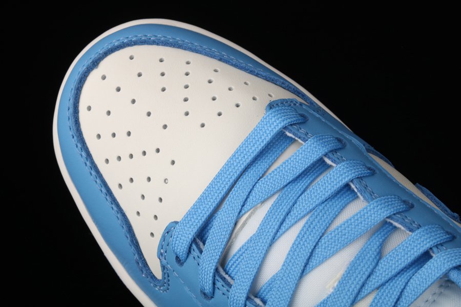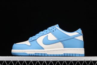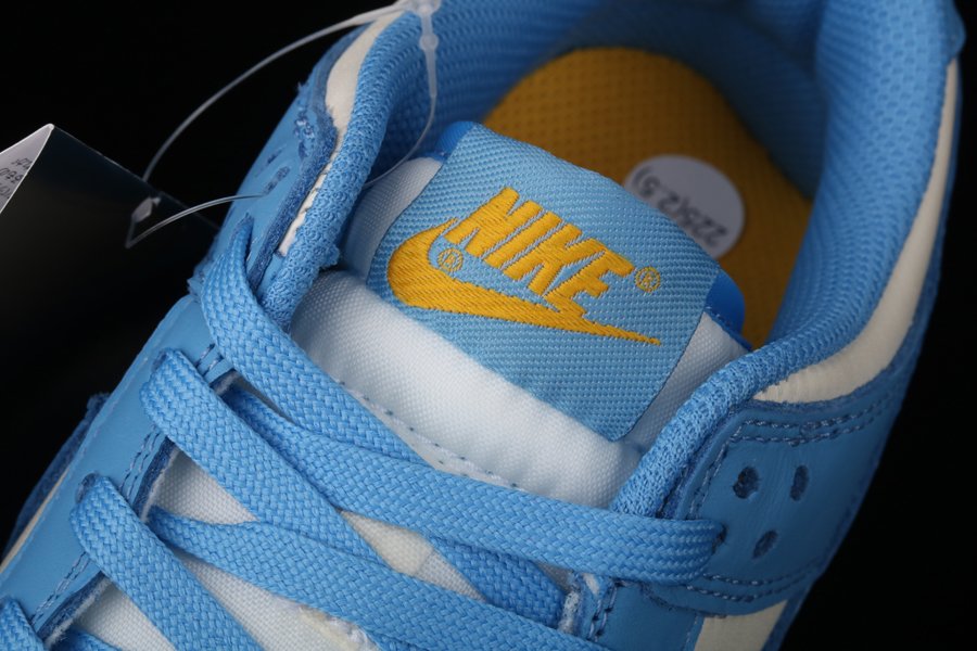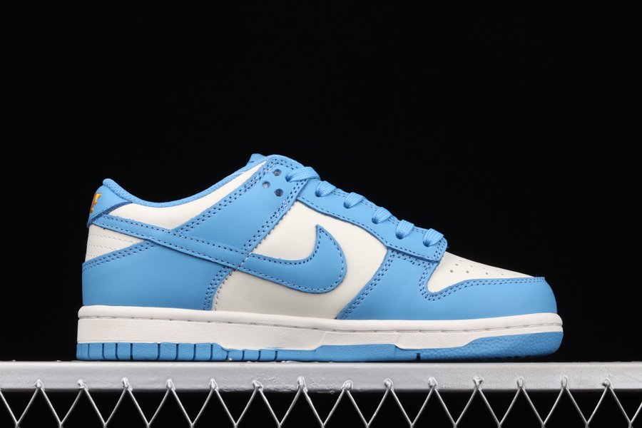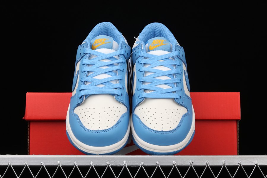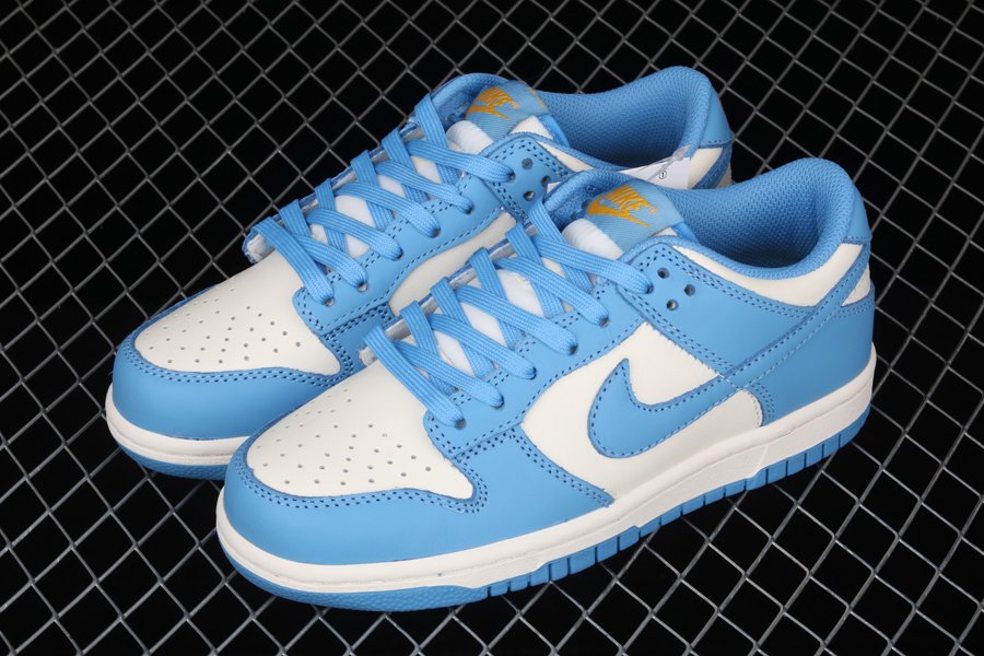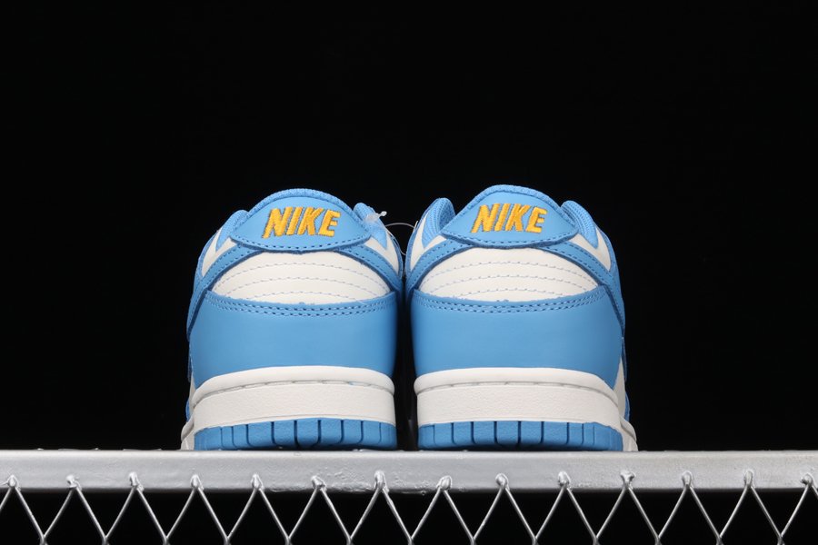 This Nike Dunk Low “Coast” comes dressed in a Sail, Coast, and University Gold color combination. First, the pair features Sail leather across the panels, toe box, and ankle. Next, we have Coast, which resembles a UNC Blue on the overlays, Swoosh logos, wraps the toe and heel, liner, and rubber outsole. Adding contrast, University Gold appears on the tongue branding, embroidered Nike on the heel, and across the insoles. Lastly, a Sail midsole finishes the look.