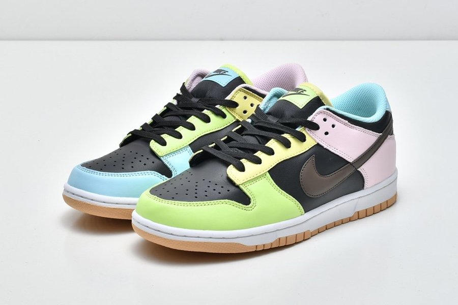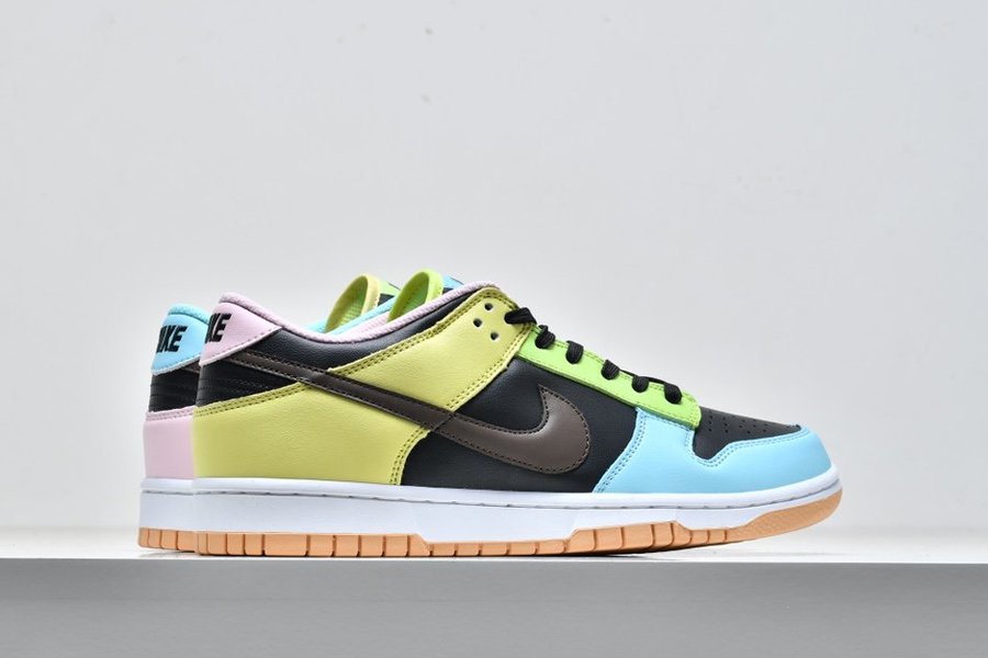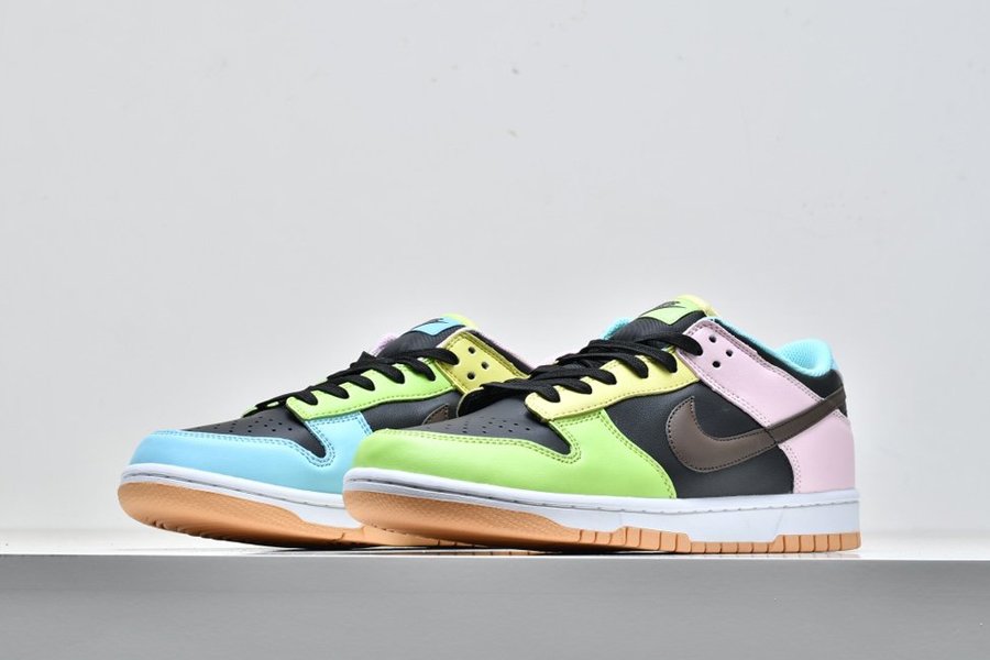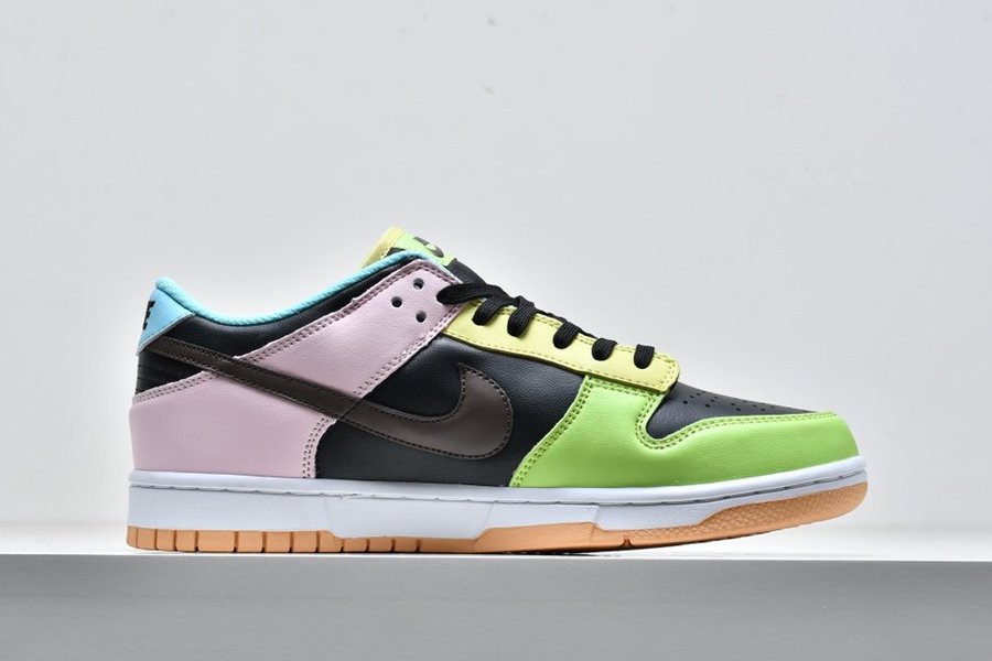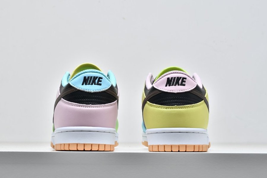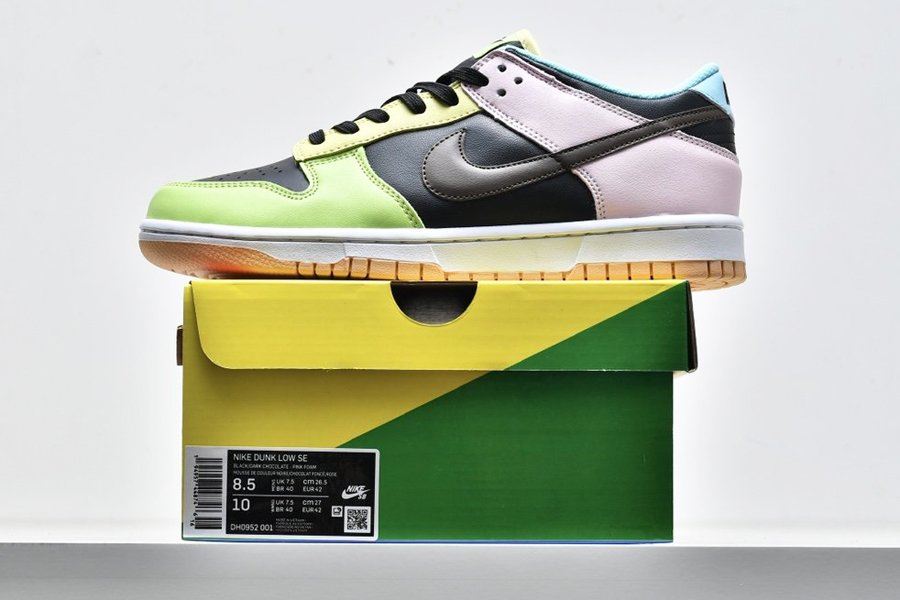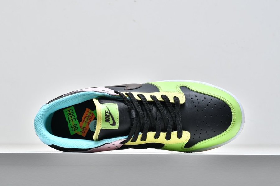 The Nike Dunk Low SE ‘Free.99 – Black’ applies mismatched color blocking to the vintage hoops shoe turned streetwear staple. Both the left and right shoe feature a black leather base on the upper, supported by a crisp white midsole and pale orange rubber outsole. While the overlays on each shoe are arranged in asymmetrical fashion, they draw from the pastel palette of powder blue, pink, yellow and line green hues. The custom sockliner displays ‘Free.99’ price stickers.