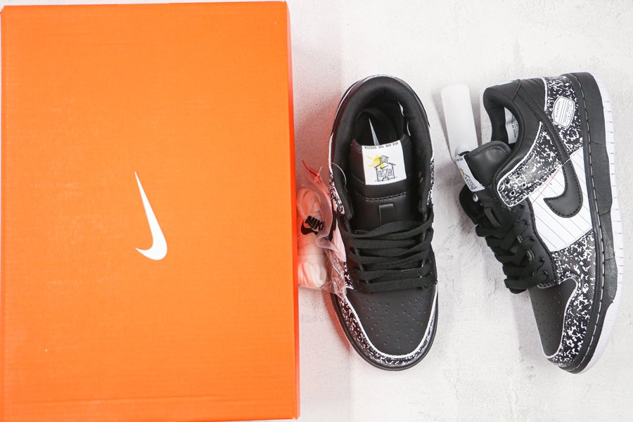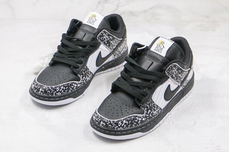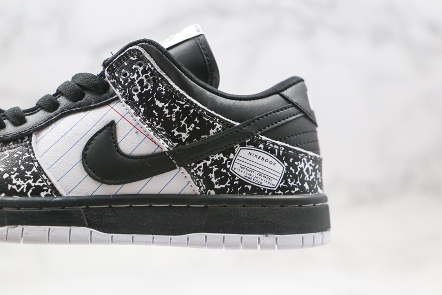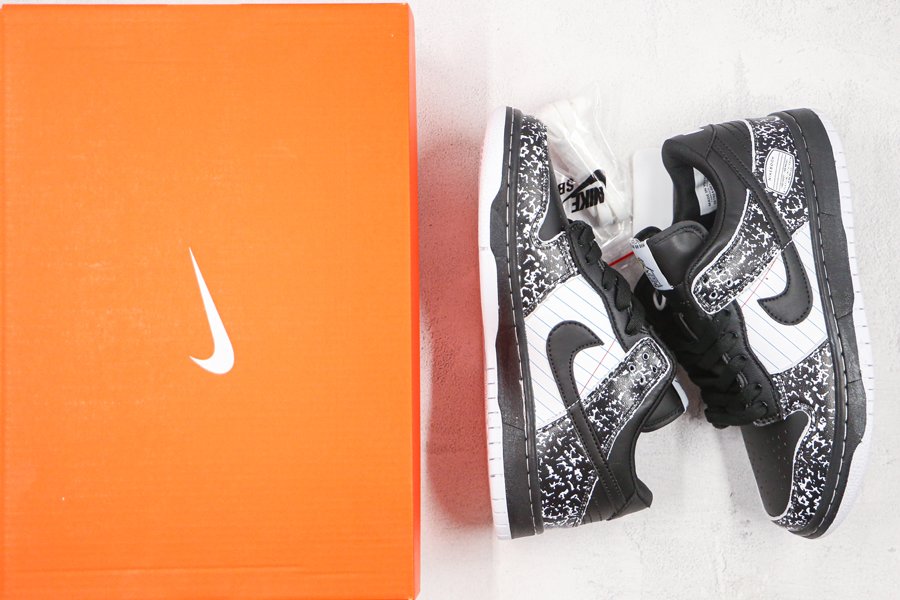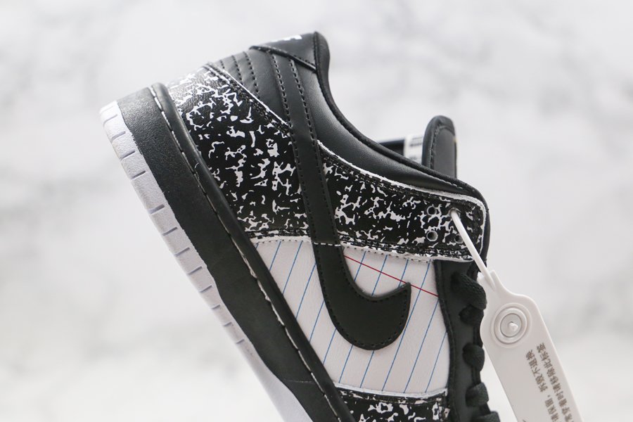 This take on the classic skate-inspired shoe has a black leather upper with patterned overlays. A composition notebook-inspired print adorns the mudguard and heel panels, while a loose-leaf paper graphic decorates the midfoot panel. Underfoot, a two-toned rubber outsole completes the notebook-inspired style.