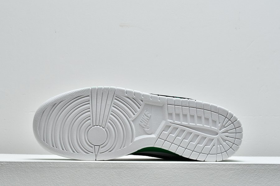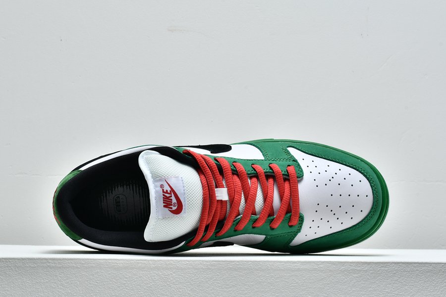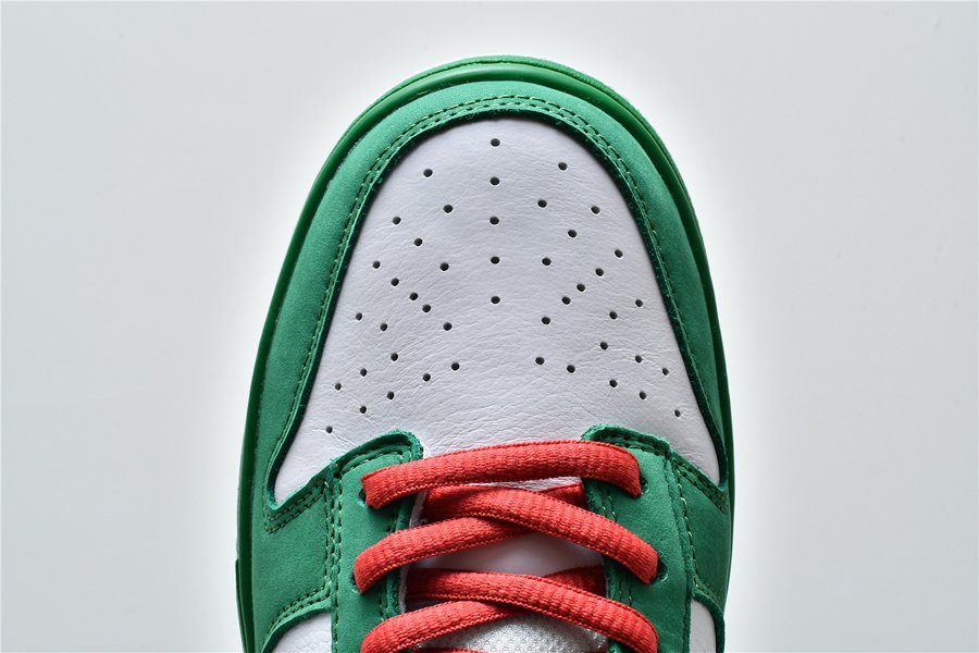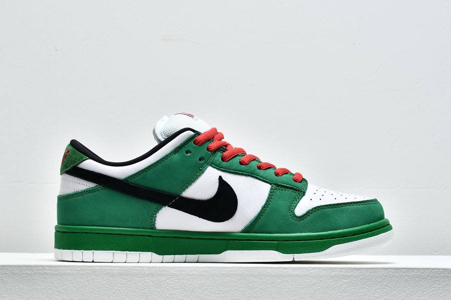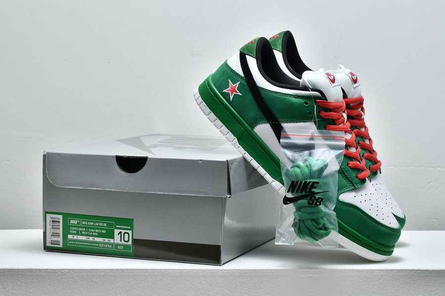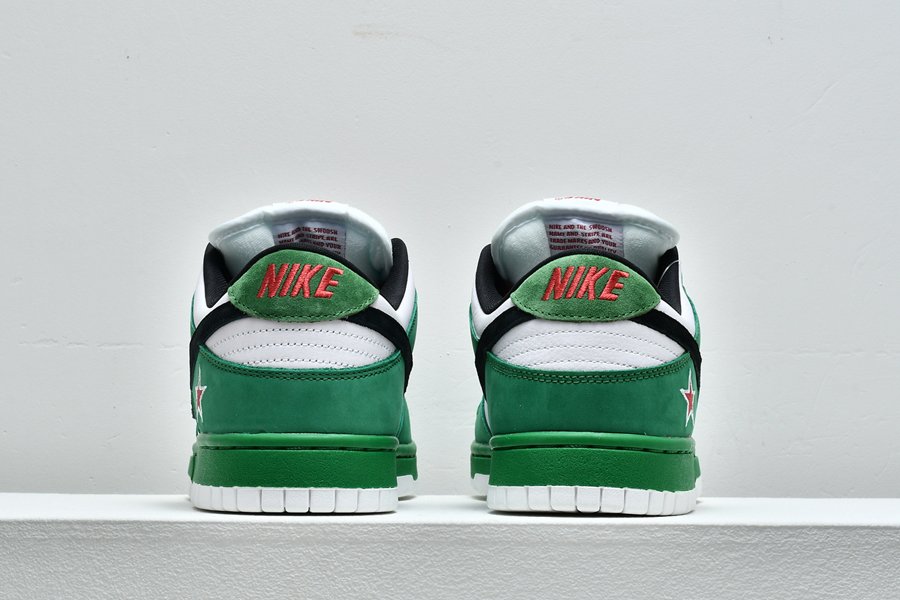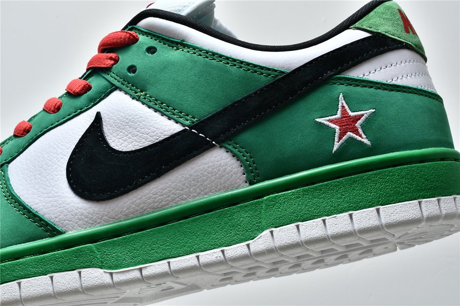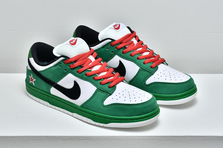 In regards to the design of the shoe, vibrant kelly green nubuck overlays contrast a white leather base that is visible on the mid-panel, collar, and perforated toe. Heineken’s recognizable red star logo is embroidered on the heel and a black felt Swoosh adds detailing to the mid-panel. Bright red laces add a pop of color. Nike SB equips their “Heineken” Dunk with a green midsole and white outsole.