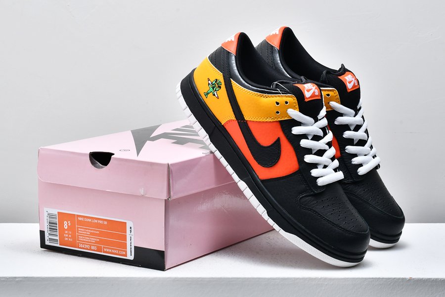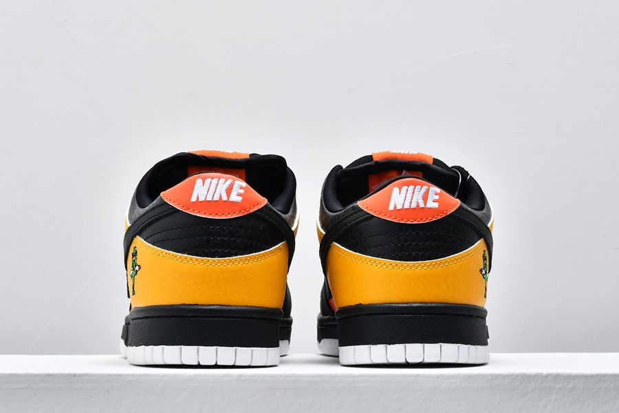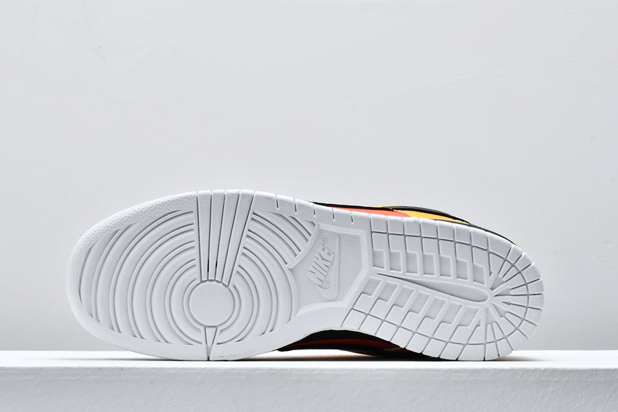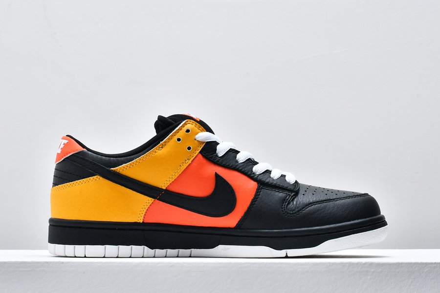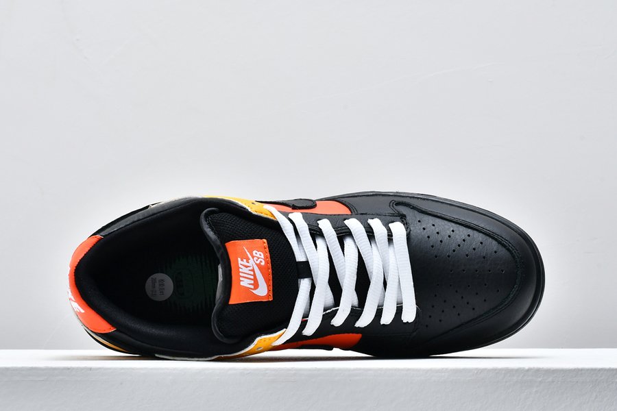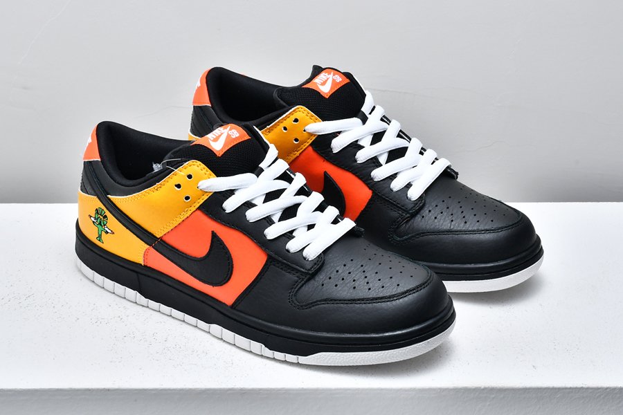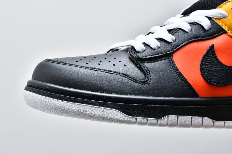 An all-time classic Nike SB Dunk colorway, this “Rayguns” edition takes inspiration from the fictional Roswell Rayguns basketball squad in an old Nike Basketball commercial. This colorway features the “road” colorway in black leather with yellow and orange accent panels.