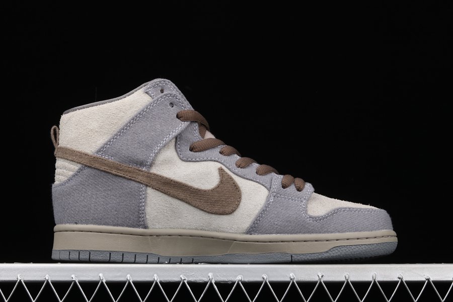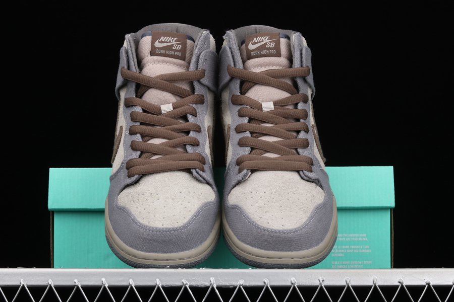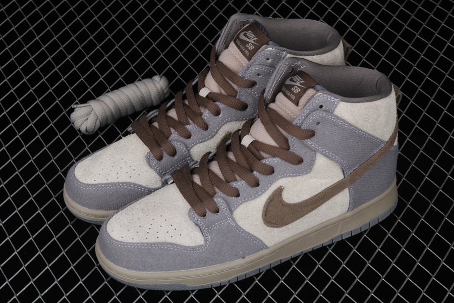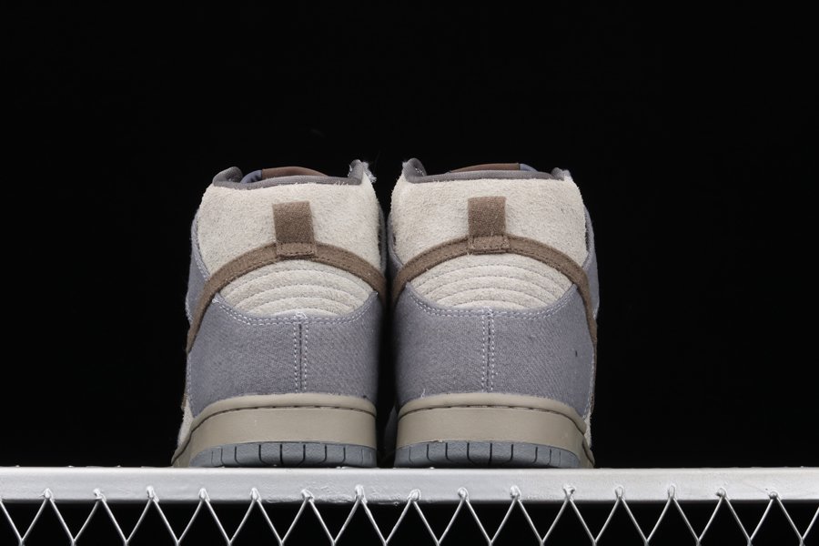 The Nike Dunk SB High Tauntaun features a heavily texturized upper with grey suede and light blue canvas paneling alongside a dark grey canvas Swoosh. The shoe is finished off with dark grey laces, a grey midsole, and a light blue outsole.