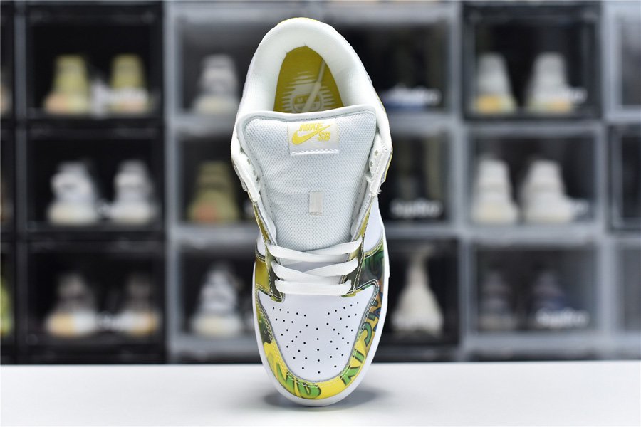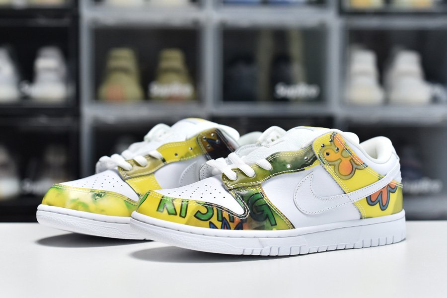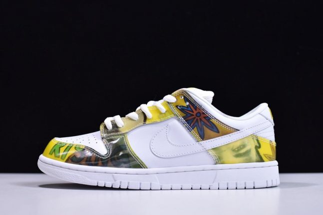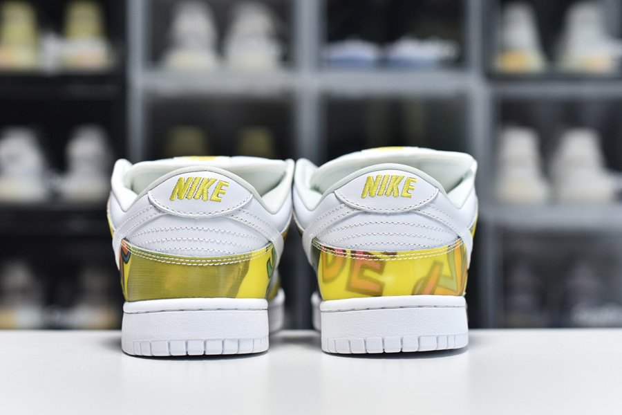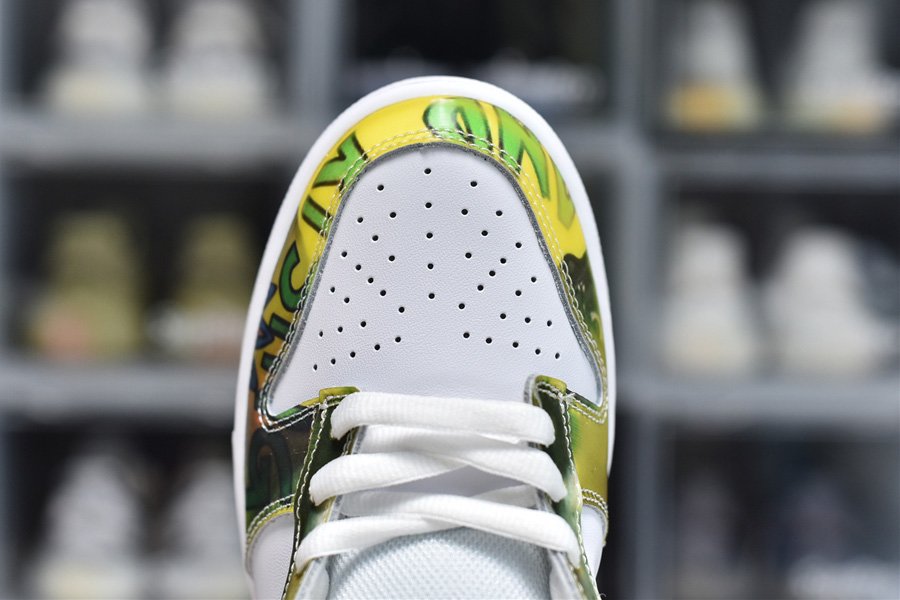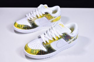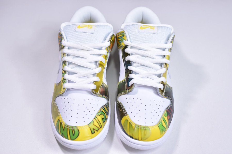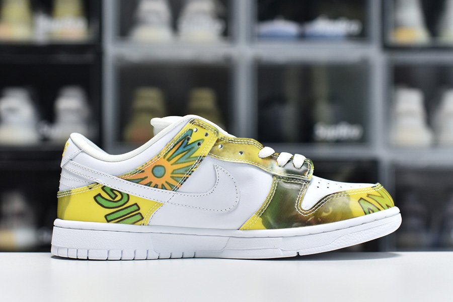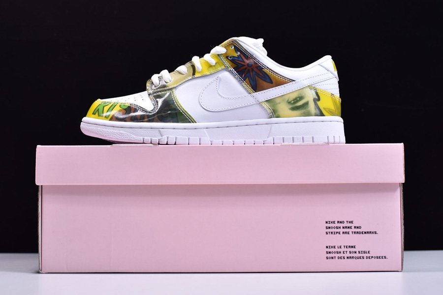 Nike linked up with legendary hip-hop group De La Soul to create uniquely designed Dunk High and Dunk Low silhouettes back in 2005. Released in October of that same year, the Dunk Low Pro SB ‘De La Soul’ sneaker features an upper with an eclectic blend of textiles and colors, a combination of white overlays with vivid holographic vinyl panels that boasts the band’s iconic Three Feet High album cover artwork.