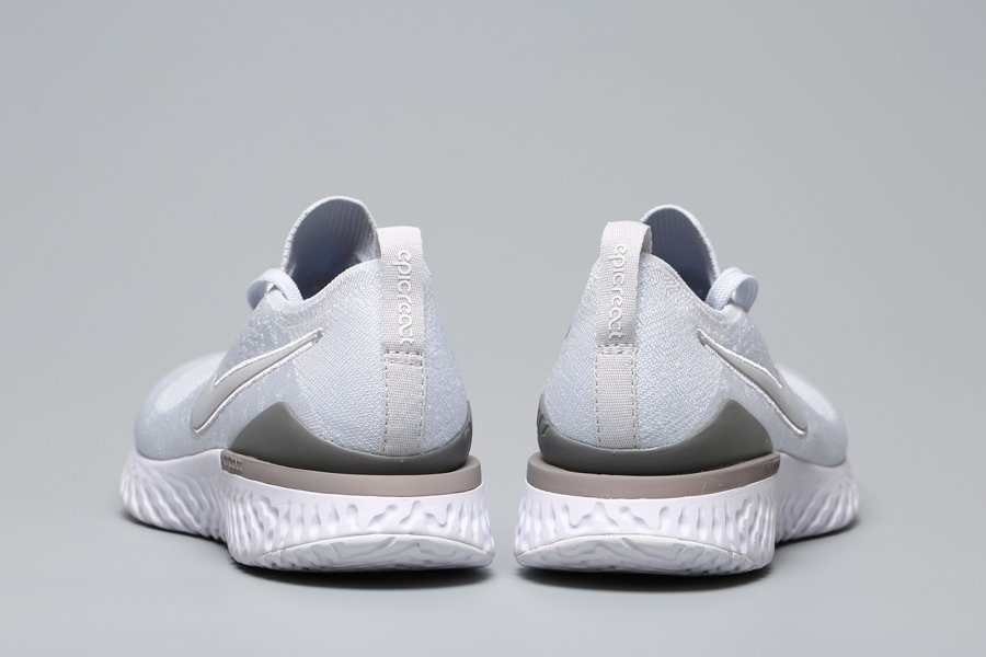 The Nike Epic React Flyknit 2 “Pure Platinum” picks up where its predecessor left off, featuring extremely lightweight React foam cushioning and a breathable knit upper that conforms to the foot. The latter is finished in pristine Pure Platinum, accented with a modified heel clip in Wolf Grey. The full-length React midsole is coated in white, reinforced with matching white rubber on the toe and heel of the outsole.